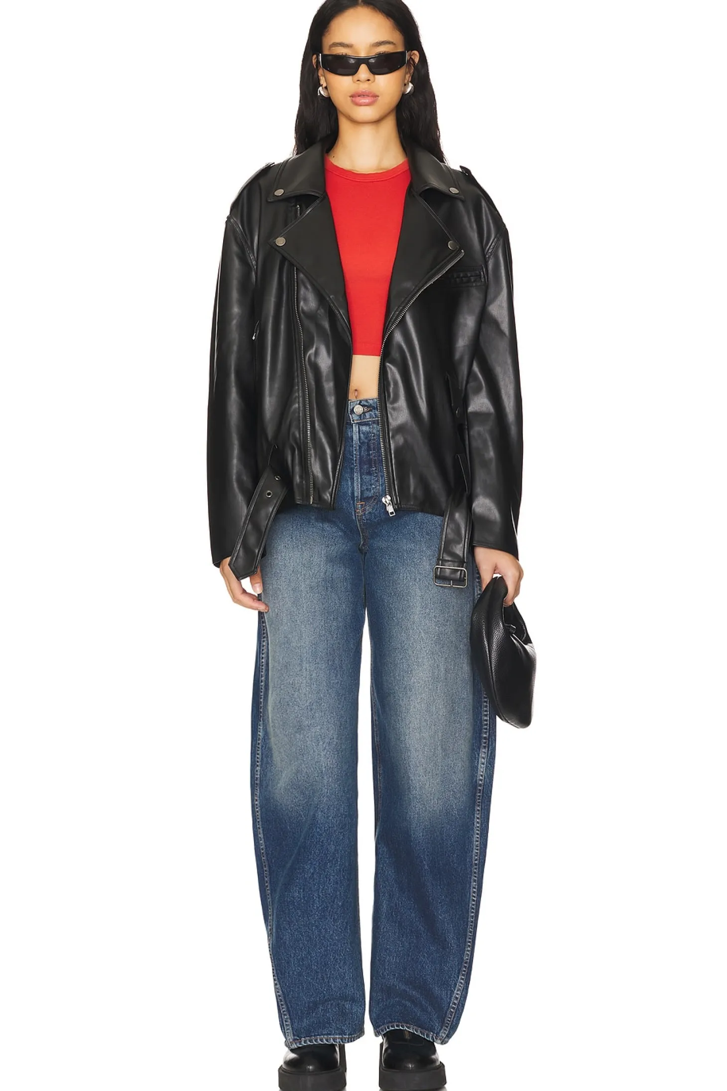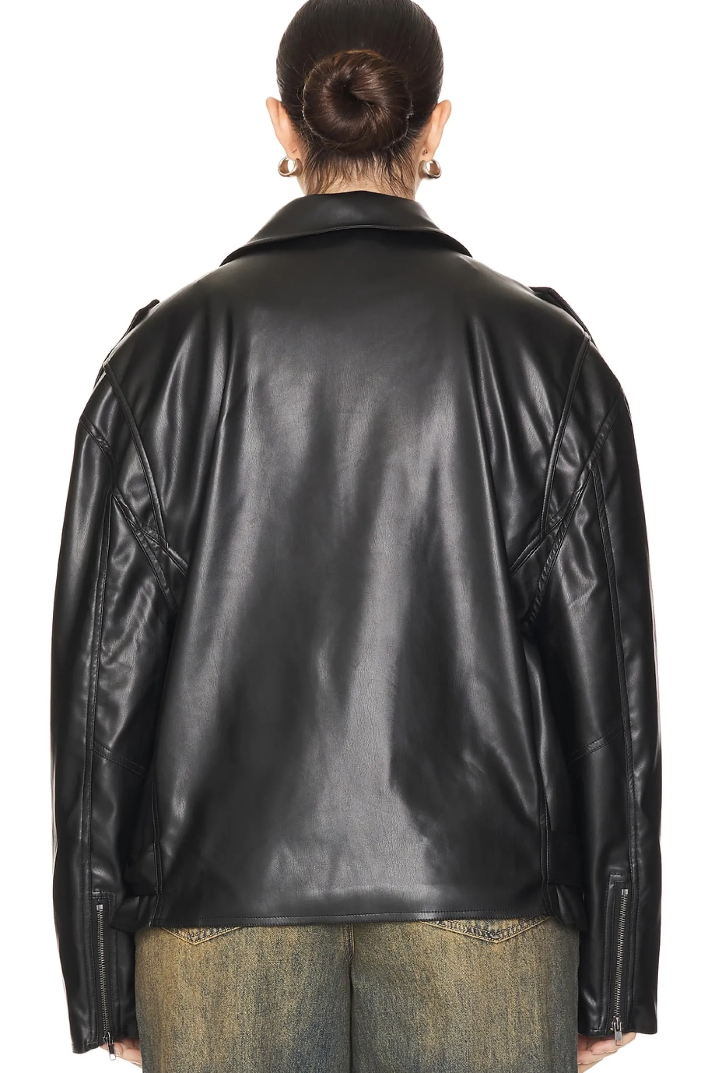 Self 1: 100% polyurethane Self 2 & Lining: 100% polyester.Made in China.Machine wash.Exposed front zipper closure.Moto jacket styling.Epaulettes and zip-cuffs.3-pocket design Faux leather