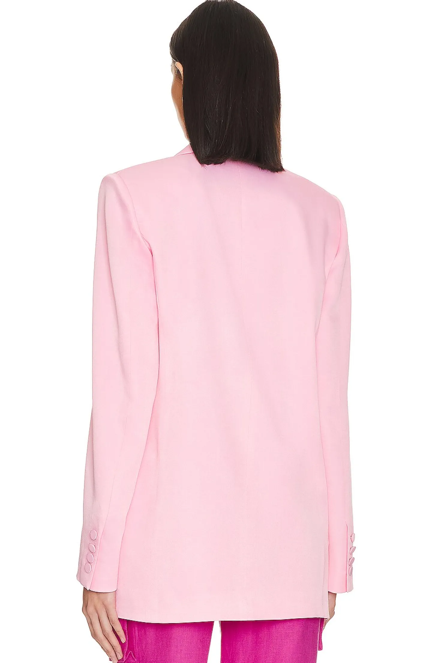 Self: 100% viscose Lining: 100% polyester.Made in Italy.Dry clean only.Front button closure.Padded shoulder with buttoned cuffs.Front welt pockets.Satin fabric