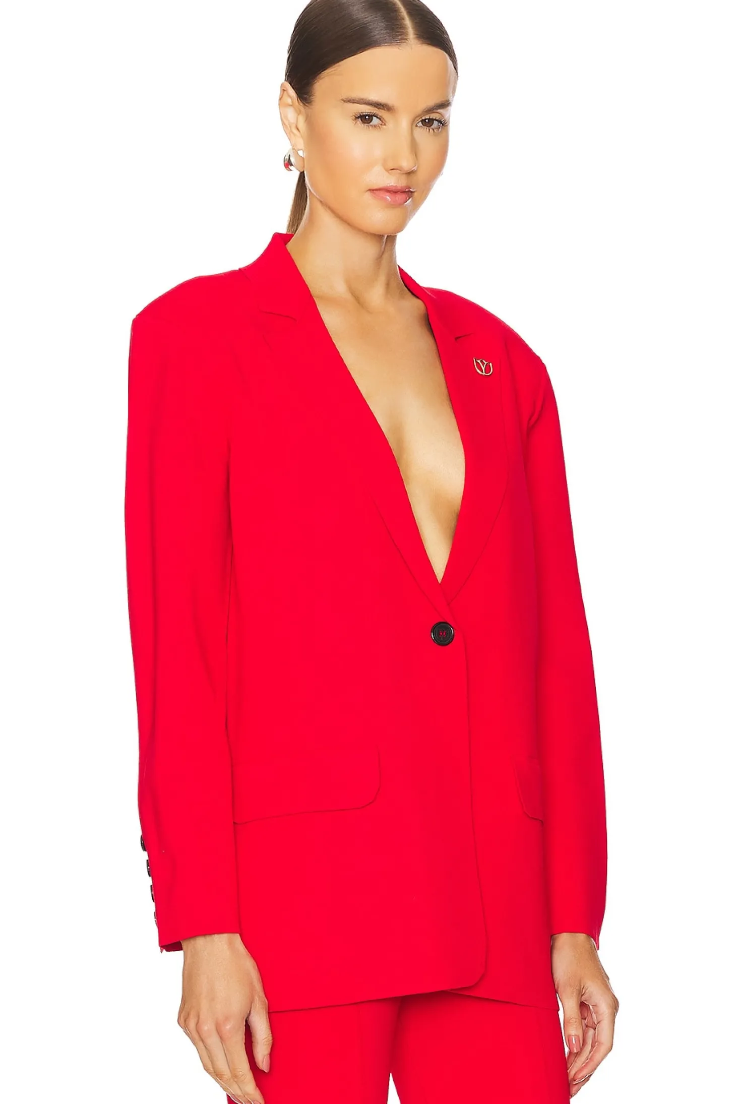 Ponte textile.Made in China.Dry clean only.Singular front button closure.Padded shoulders.Gold-tone accent at shoulder.Button cuffs.Item not sold as a set