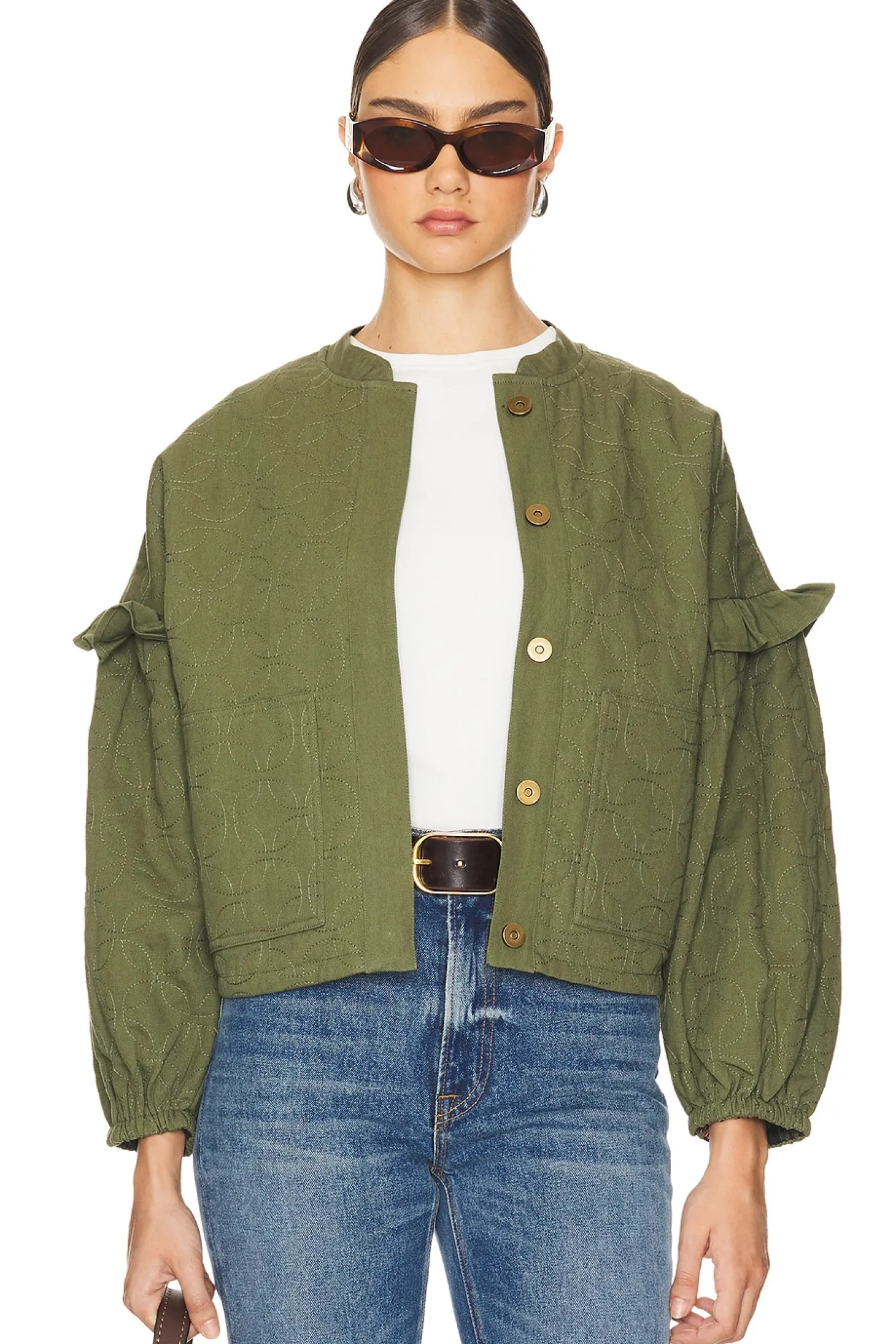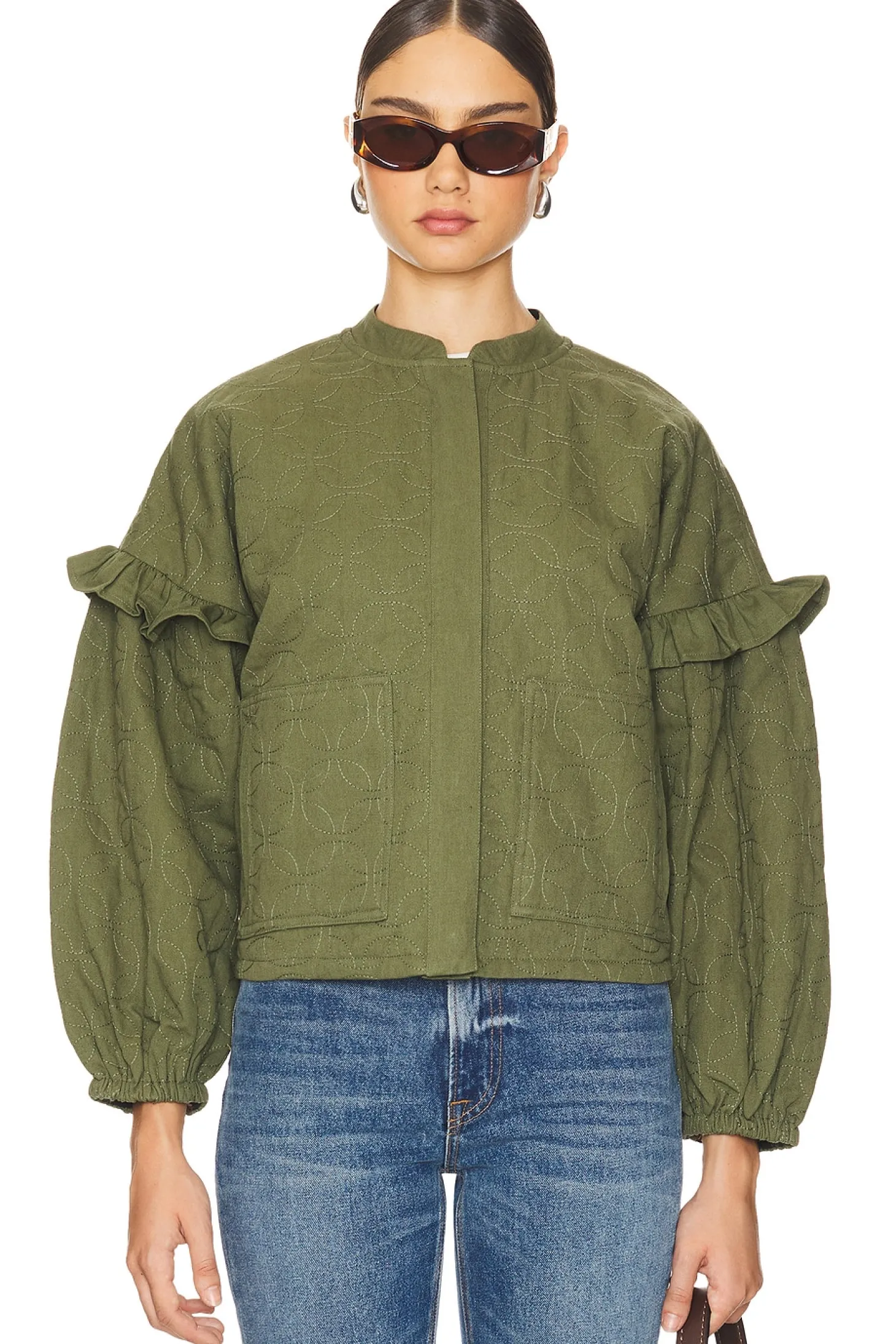 Twill textile.Imported.Machine wash recommended.Front button closure.Side seam pockets.Ruffle details at sleeves.Reversible styling.Midweight twill fabric