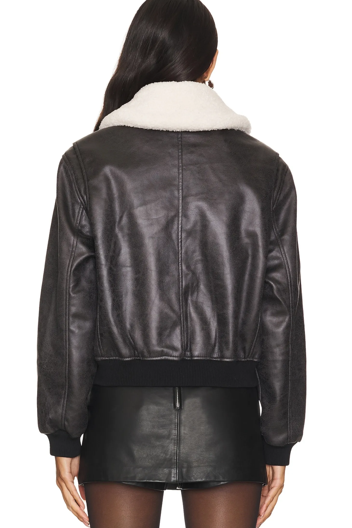 Self: 95% polyester 5% spandex Lining: 97% polyester 3% spandex Rib: 95% cotton 5% spandex Trim: 100% polyester.Made in China.Dry clean only.Front zipper closure.Side flap pockets.Sherpa collar.Faux leather fabric