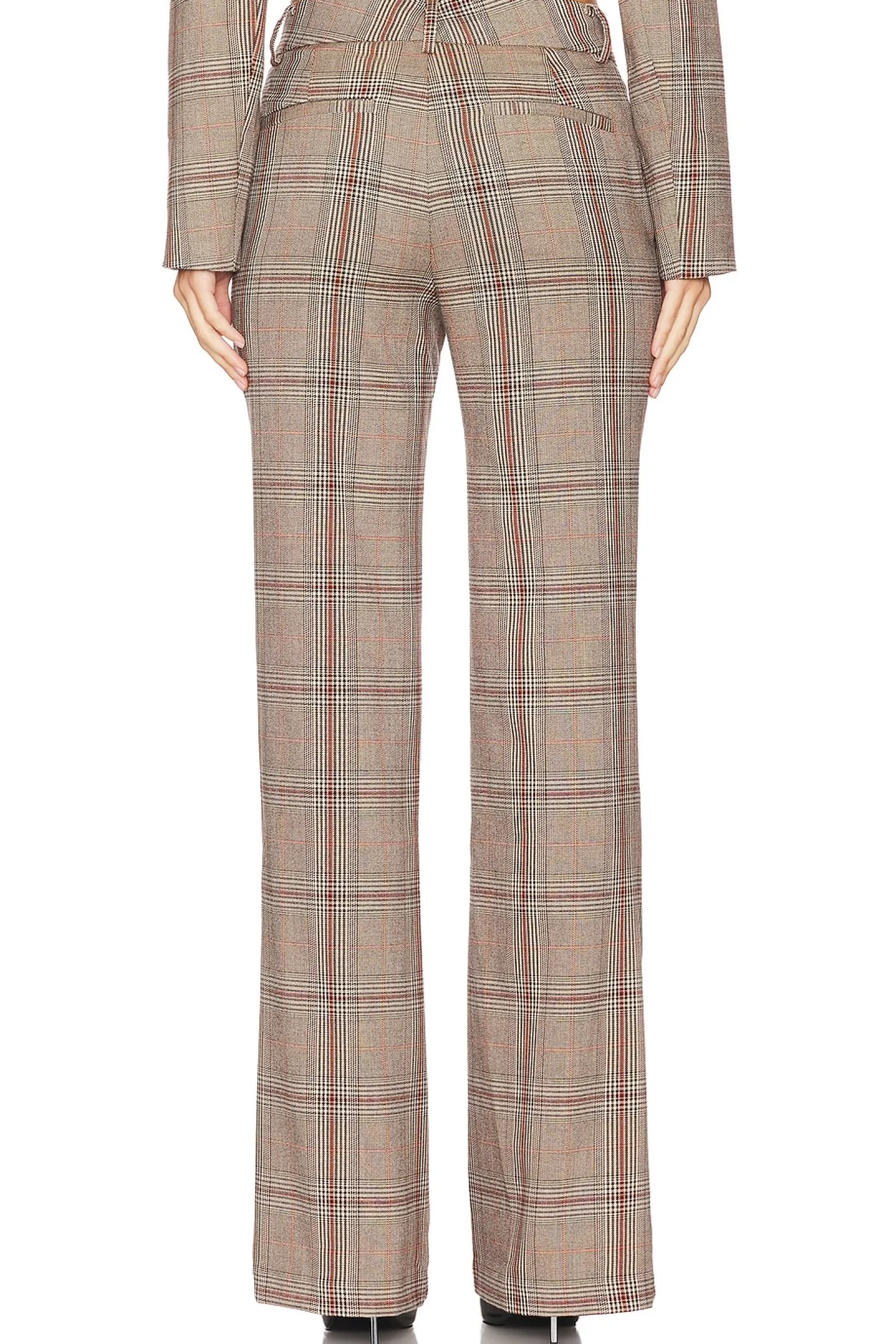 Self: 64% polyester 34% viscose 2% elastane Lining: 100% polyester.Made in China.Dry clean only.Zip fly with button closure.Side slit pockets.Back welt pockets.Twill fabric Item not sold as a set.16" at the knee breaks to 20" at the leg opening