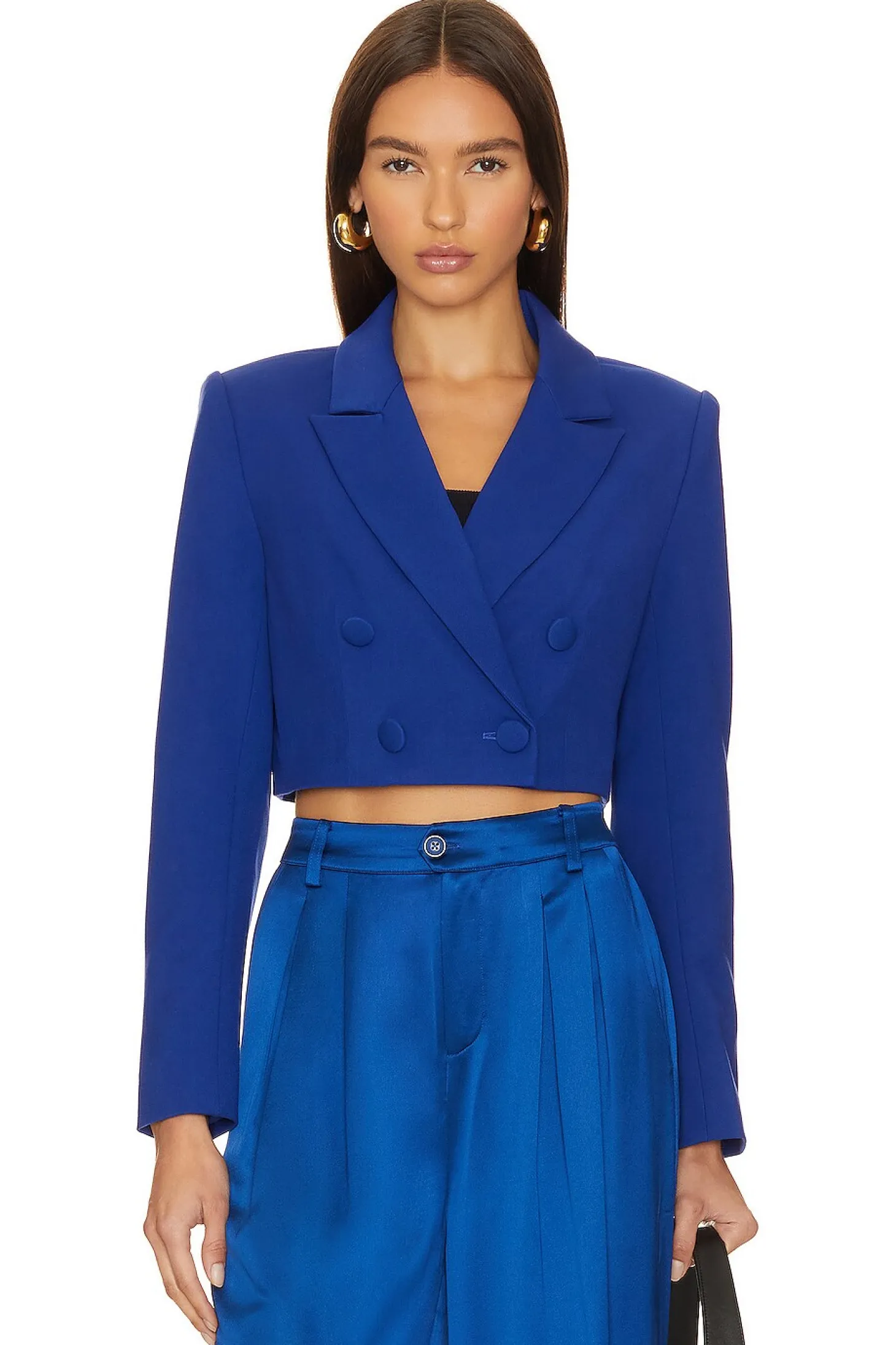 Self: 67% polyester 28% rayon 5% spandex Lining: 100% viscose.Made in China.Dry clean only.Double breasted front button closure.Padded shoulders with buttoned cuffs.Item not sold as a set