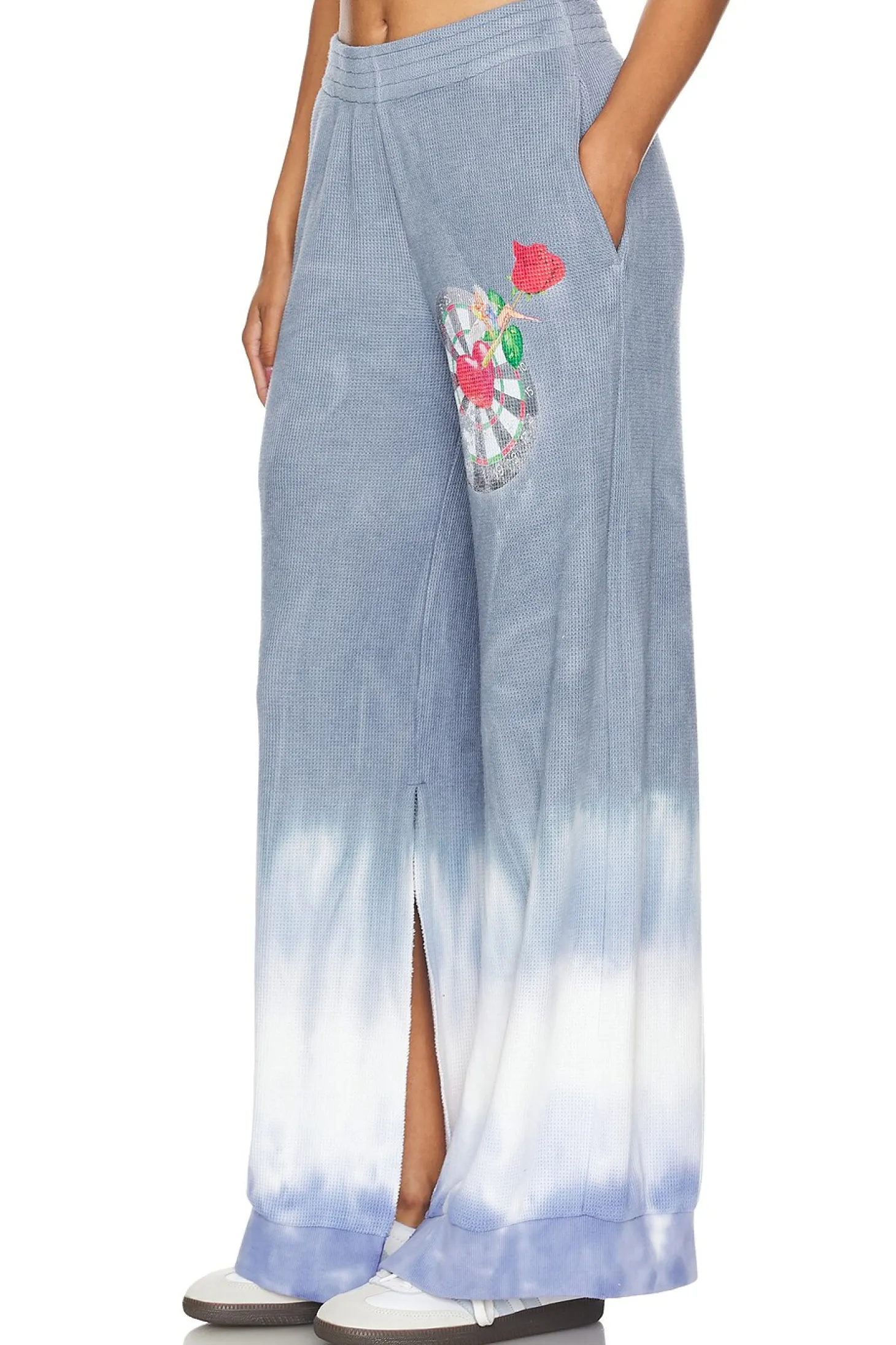 68% polyester 29% rayon 3% spandex.Made in China.Machine wash.Elastic waistband.Side pockets.Item not sold as set.Knit fabric with leg slits and front graphic.26" at the knee narrows to 21" at the leg opening