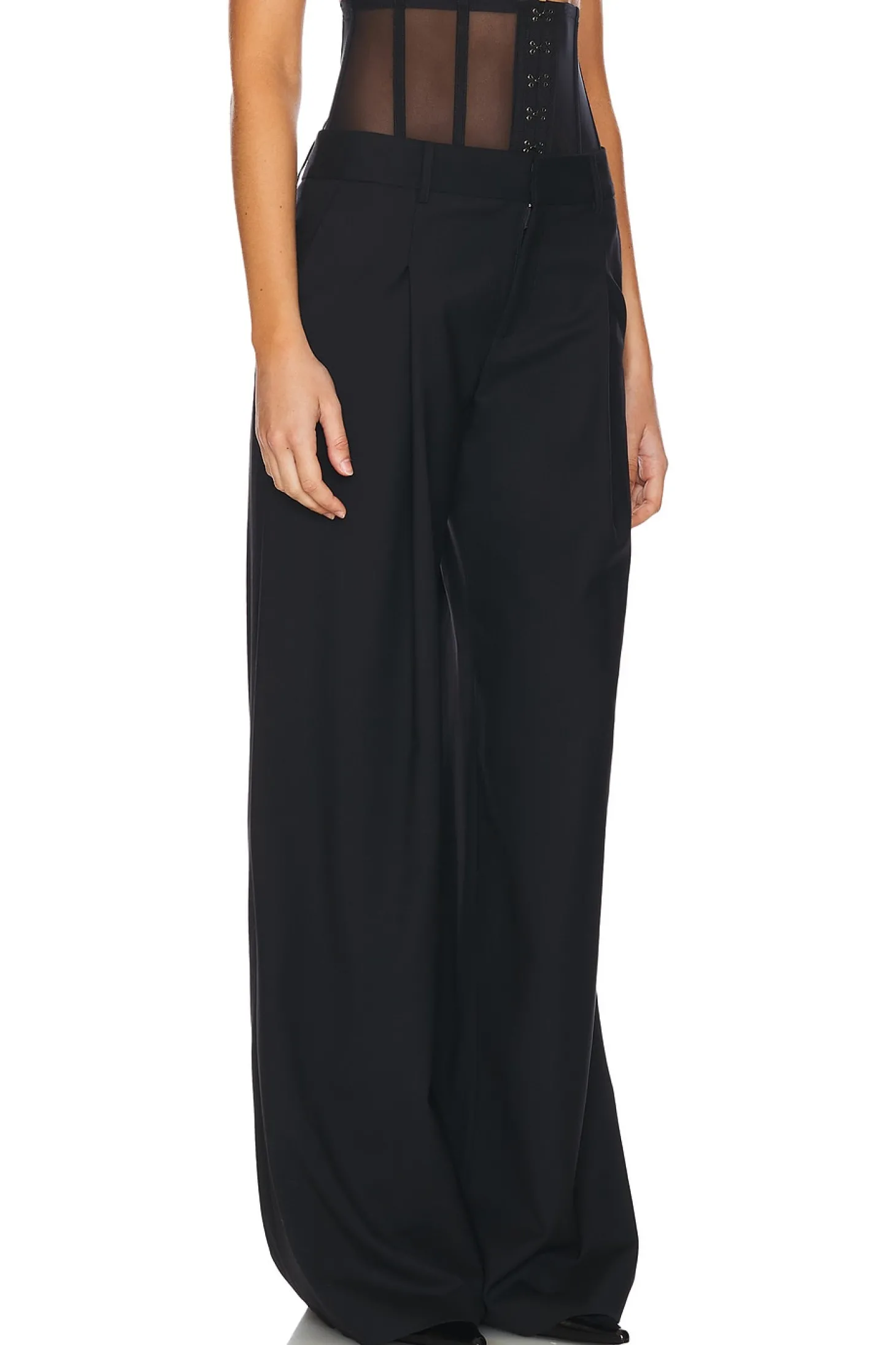 95% virgin wool 5% elastane.Made in USA.Dry clean.Zip fly with hook and bar closures.4 pocket styling.Attached boned corset detail with hook and eye closures.24" at the knee and 24" at the leg opening