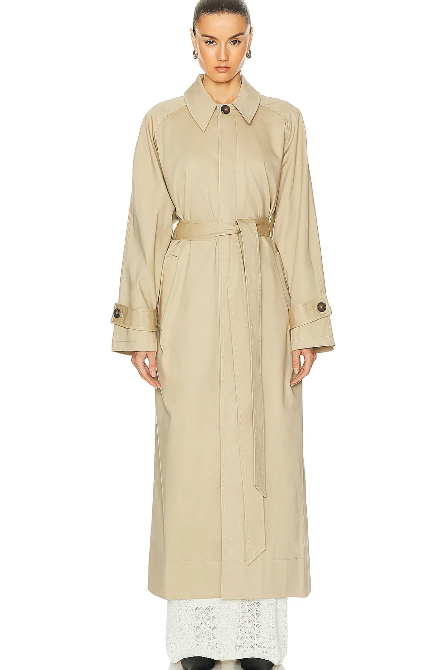 Self: 97% cotton 3% elastane Lining: 55% polyester 45% rayon.Made in China.Dry clean only.Front button closure.Side slant pockets.Attached waist tie.Button cuffs.Midweight twill fabric