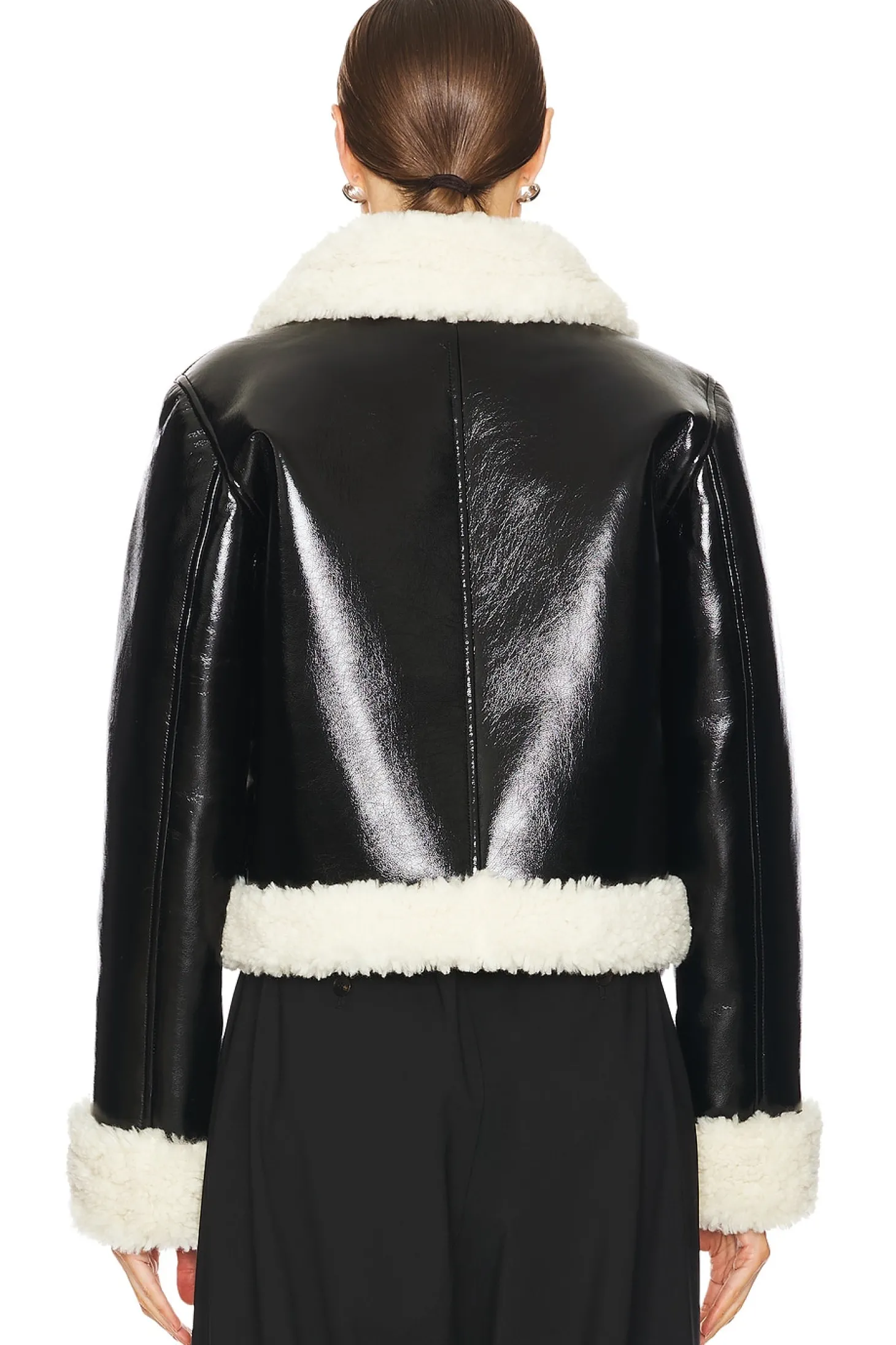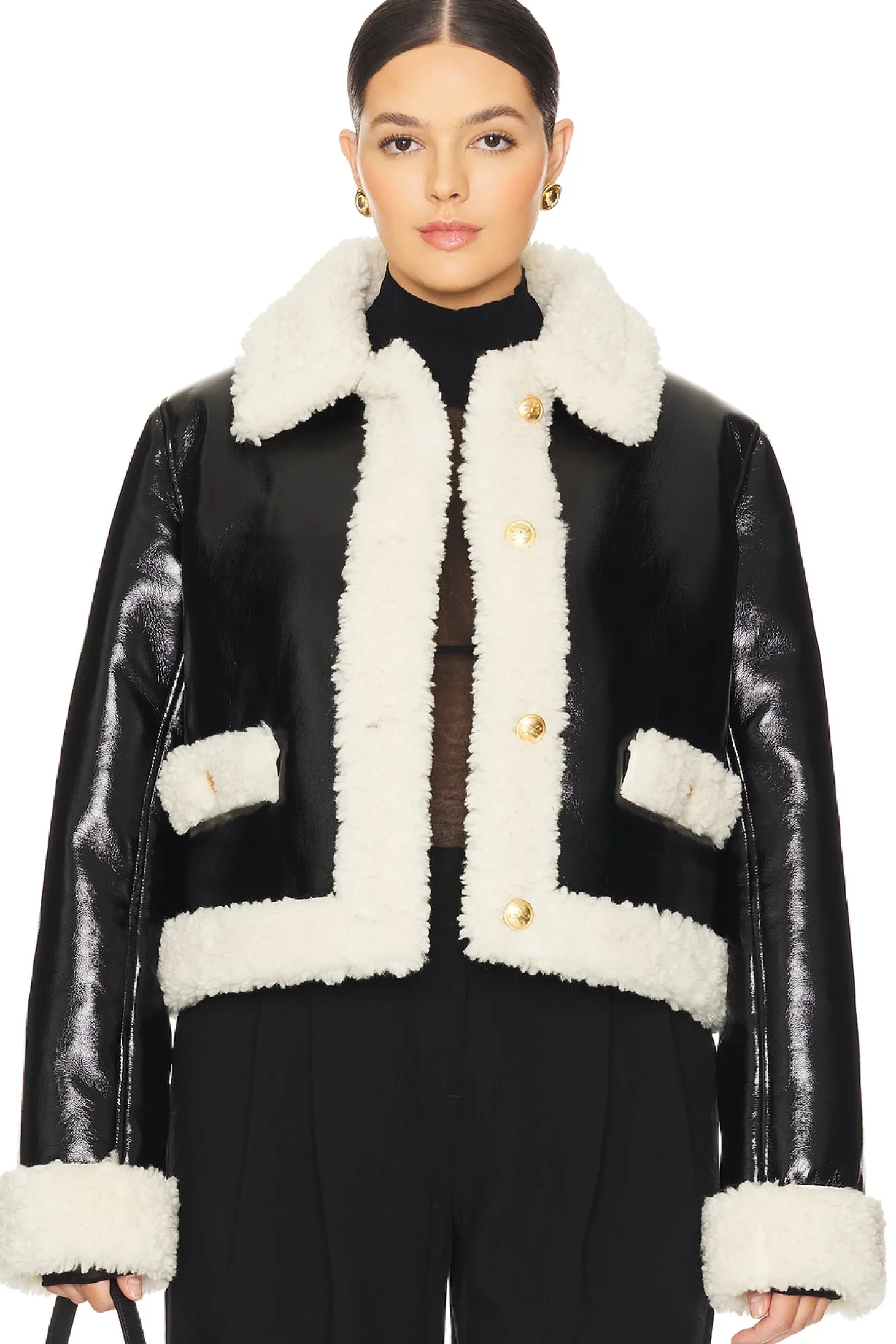Self 1: 100% polyurethane Self 2: 100% polyester Faux Fur: 100% polyester.Made in China.Dry clean only.Front button closure.Front pockets.Faux fur lining.Faux leather
