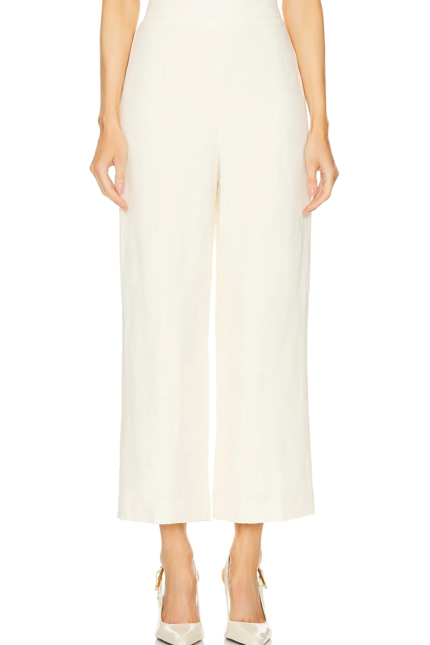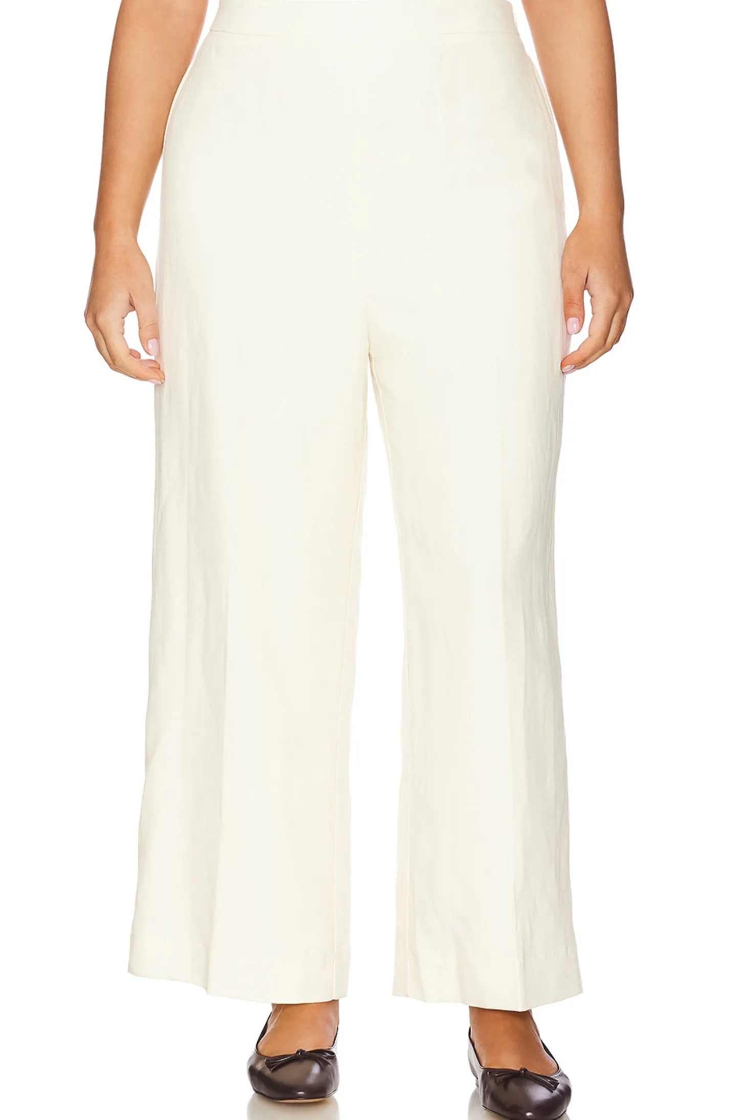 Self: 55% linen 45% lyocell Lining: 100% cotton.Made in China.Dry clean only.Hidden side zipper closure.Elastic back.Linen fabric.Item not sold as a set.20" at the knee and 20" at the leg opening