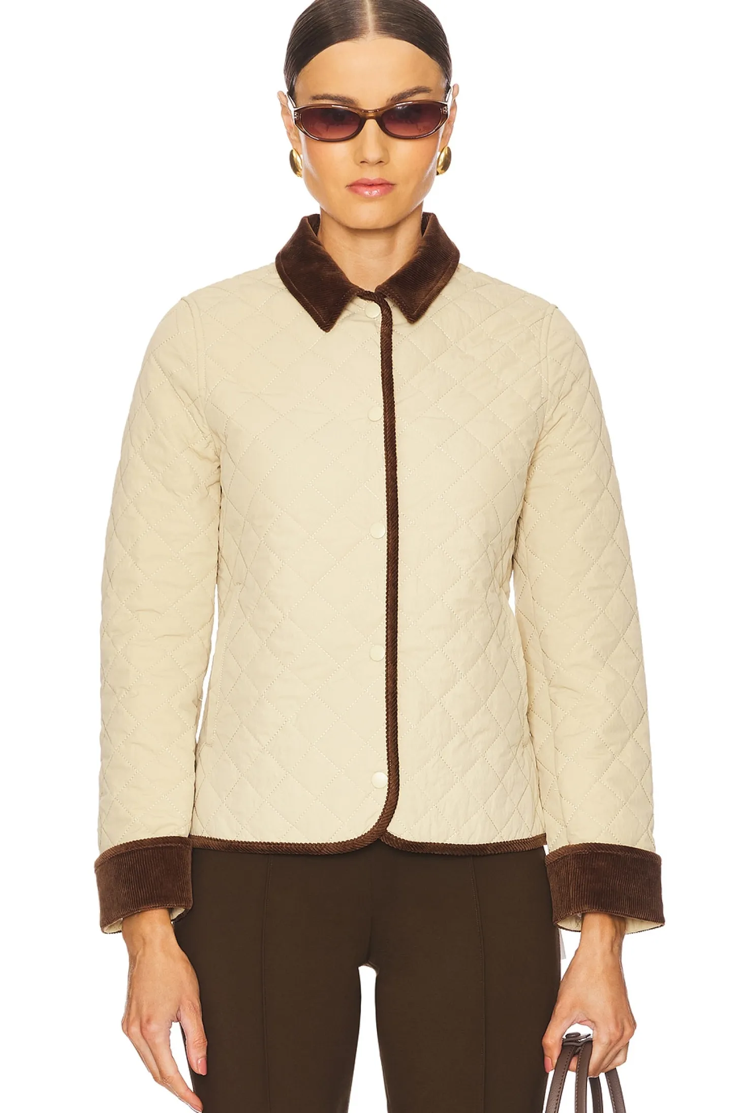 Self: 100% nylon Contrast Fabric: 98% cotton 2% elastane Filling: 100% polyester.Made in China.Dry clean only.Front snap button closure.Side pockets.Lightly padded ripstop fabric