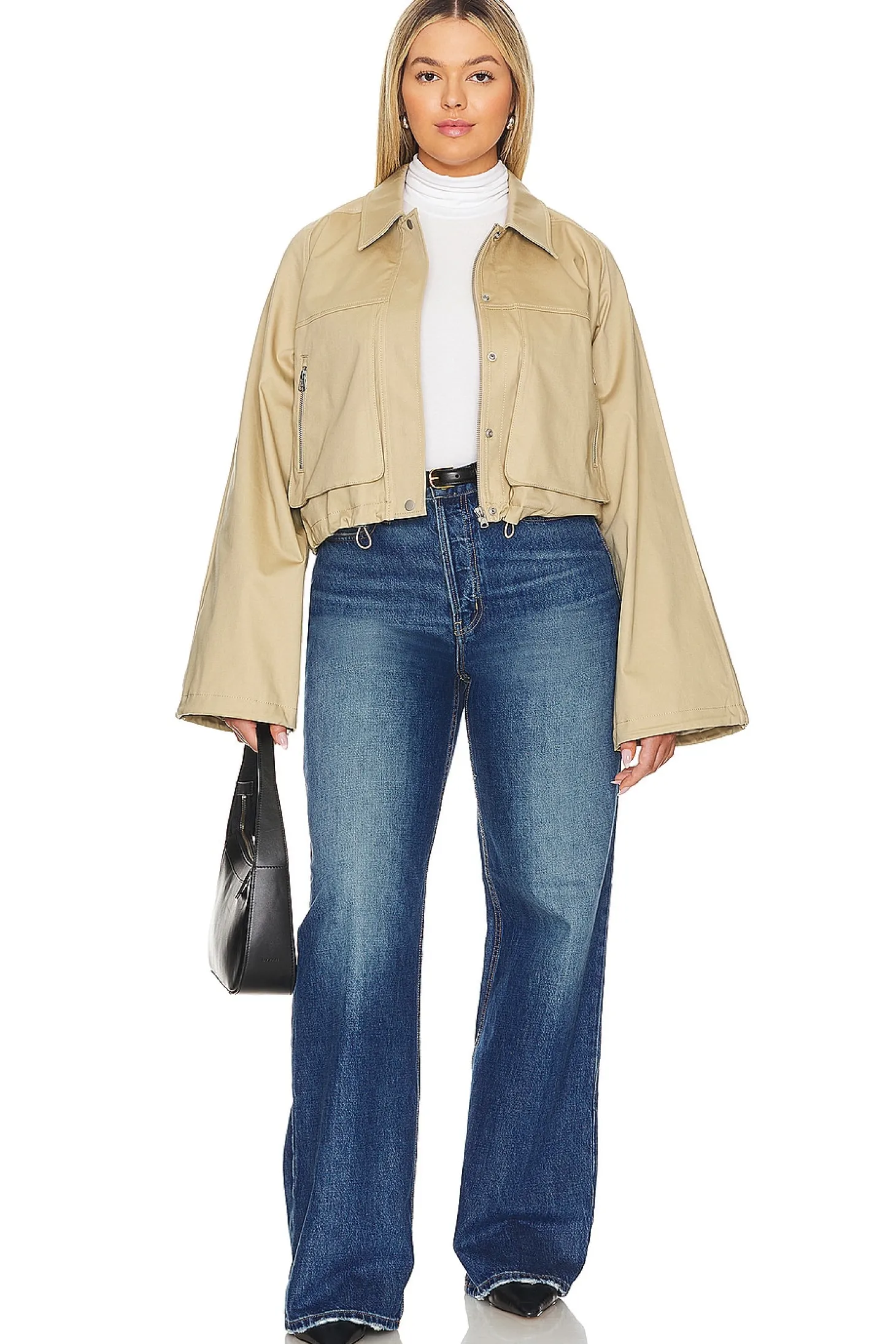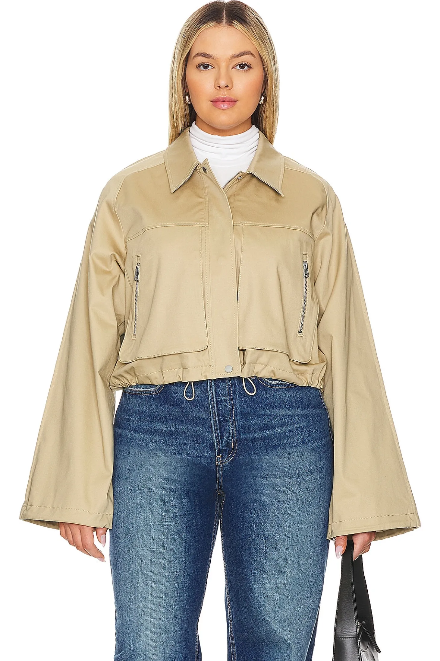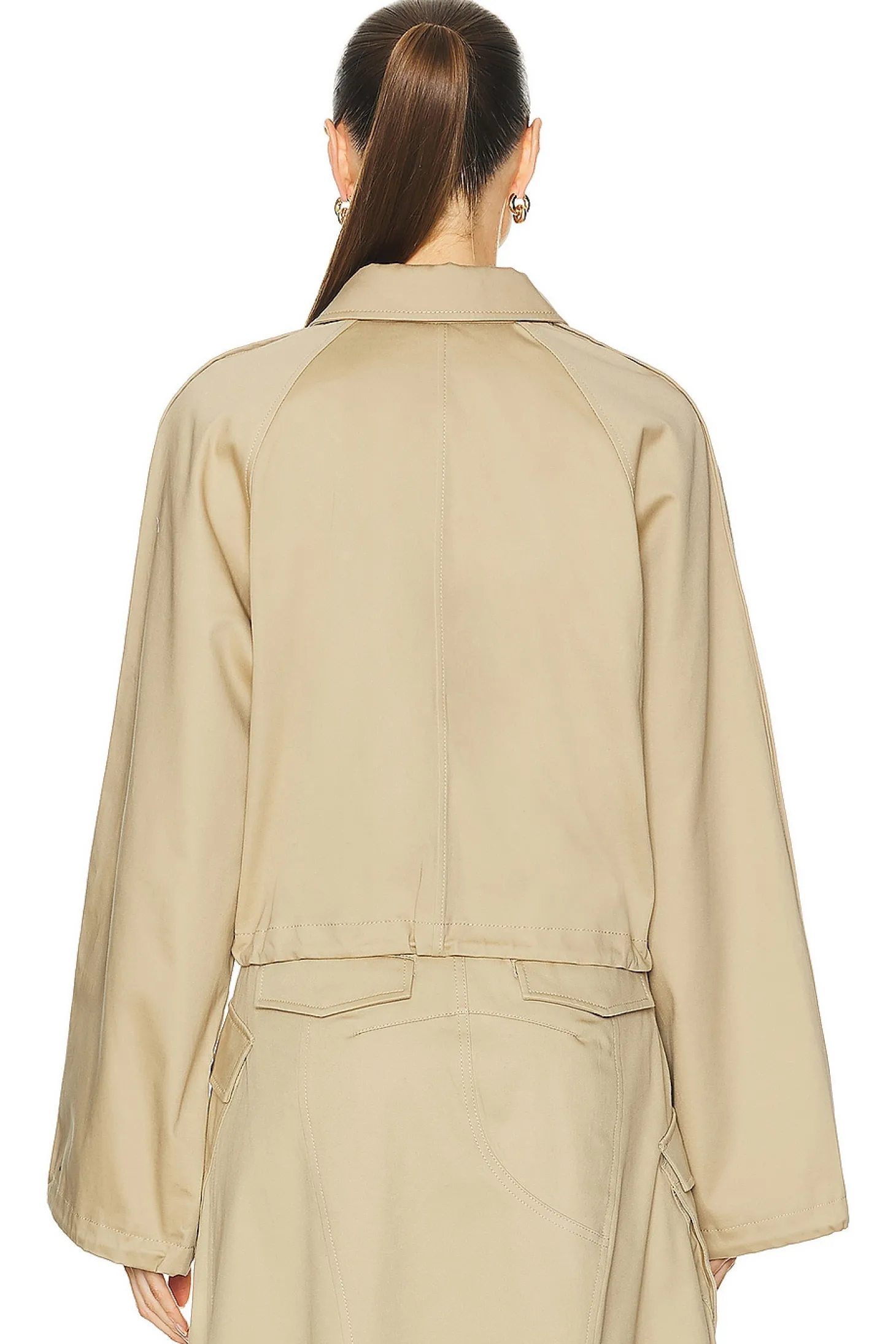 Self: 97% cotton 3% elastane Lining: 55% polyester 45% rayon.Made in China.Dry clean only.Front zipper closure.Side slant zipper pockets.Blouson sleeves with cinched cuffs.Drawcord detail at hem.Item not sold as a set