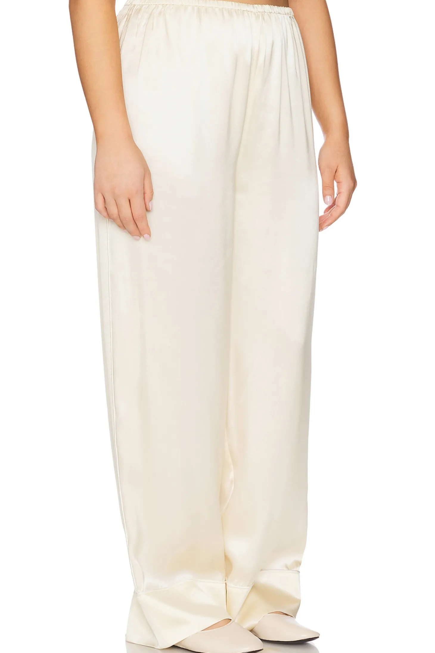 100% silk.Made in China.Dry clean only.Pull-on styling with elastic waistband.Lightweight satin fabric.Item not sold as a set.23" at the knee narrows to 18" at the leg opening