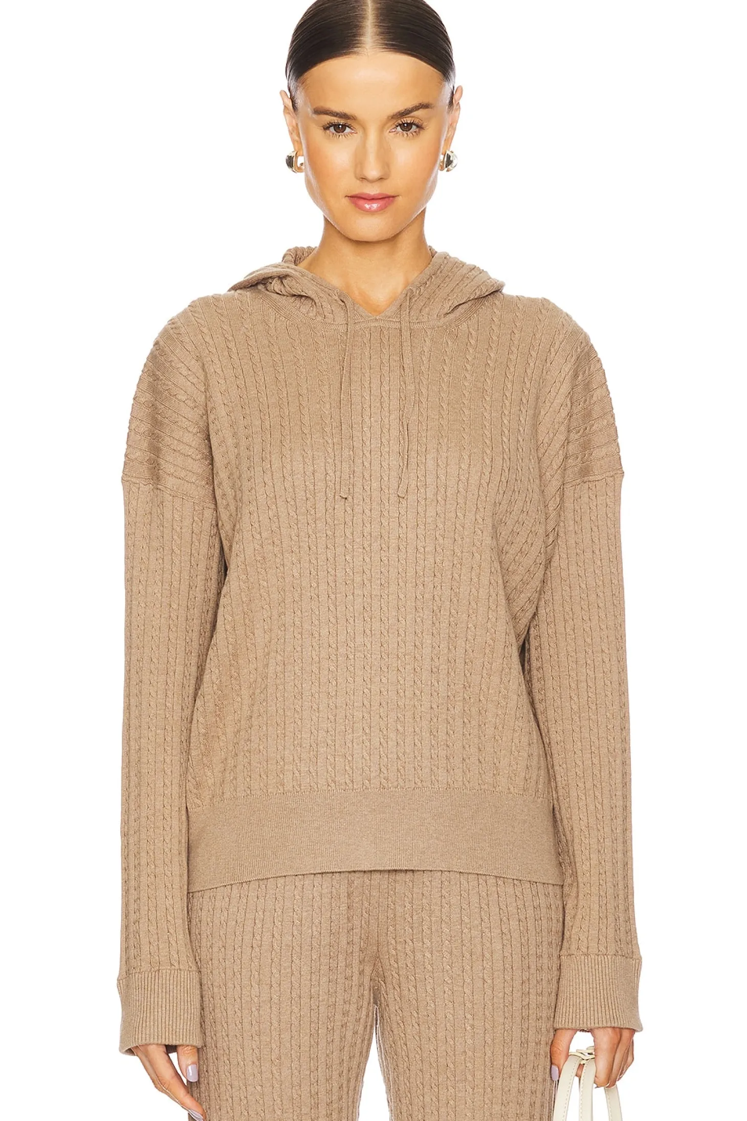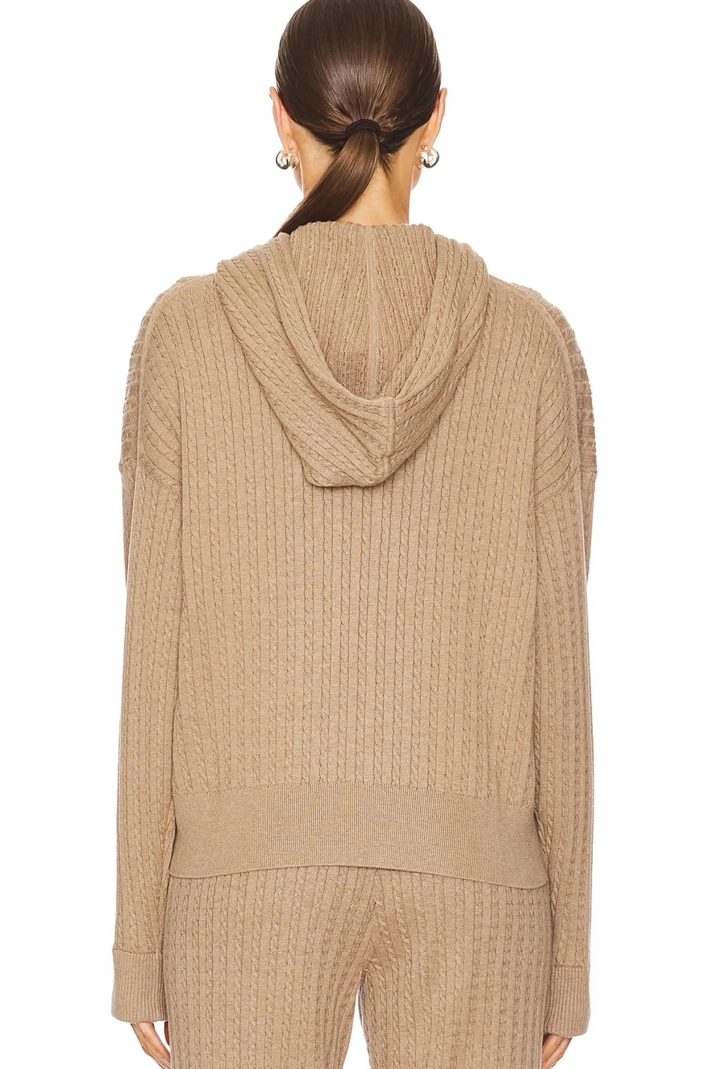 85% cotton 15% cashmere.Made in China.Dry clean only.Pull-on styling.Drawstring hood.Ribbed trim Midweight cable knit fabric Item not sold as a set