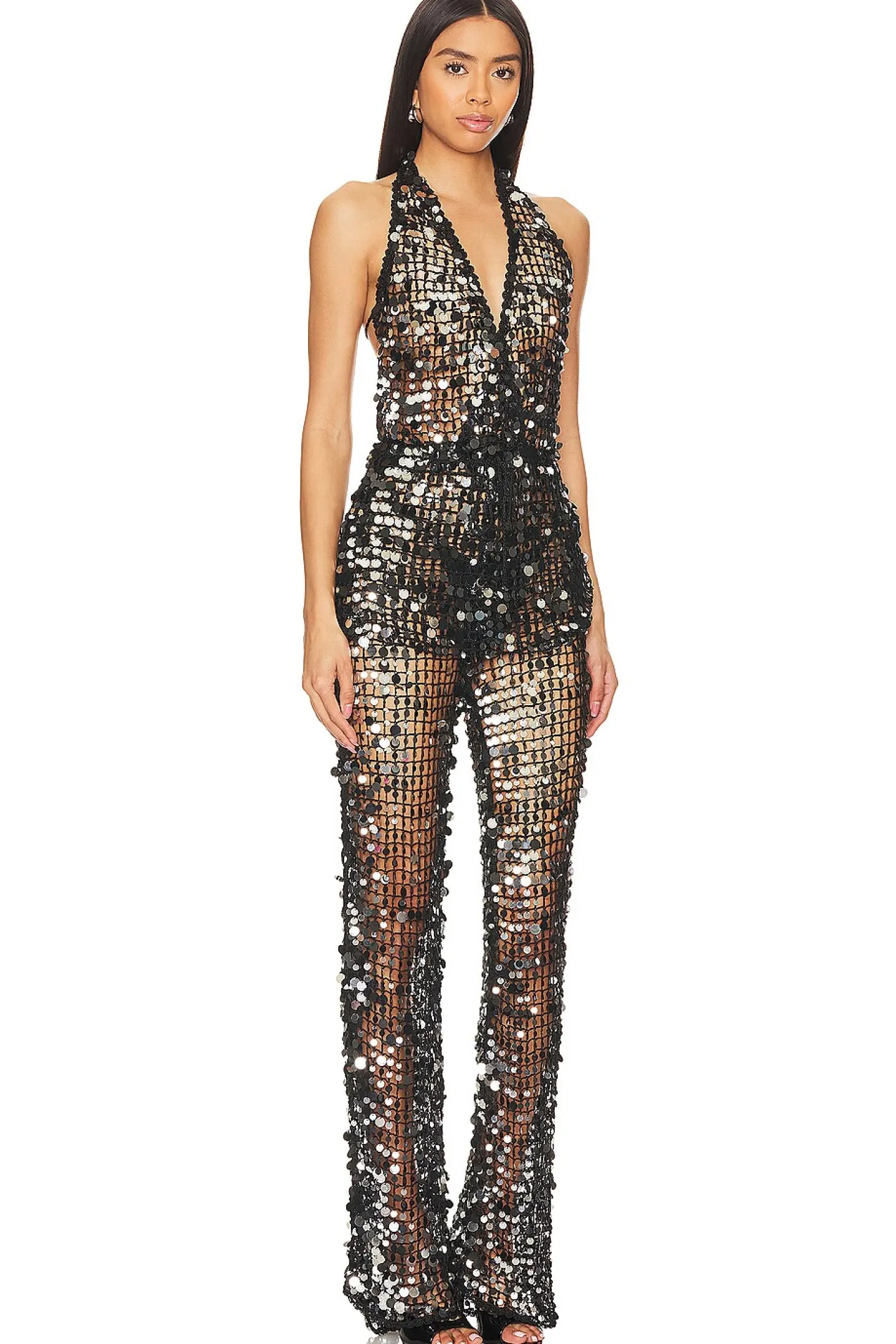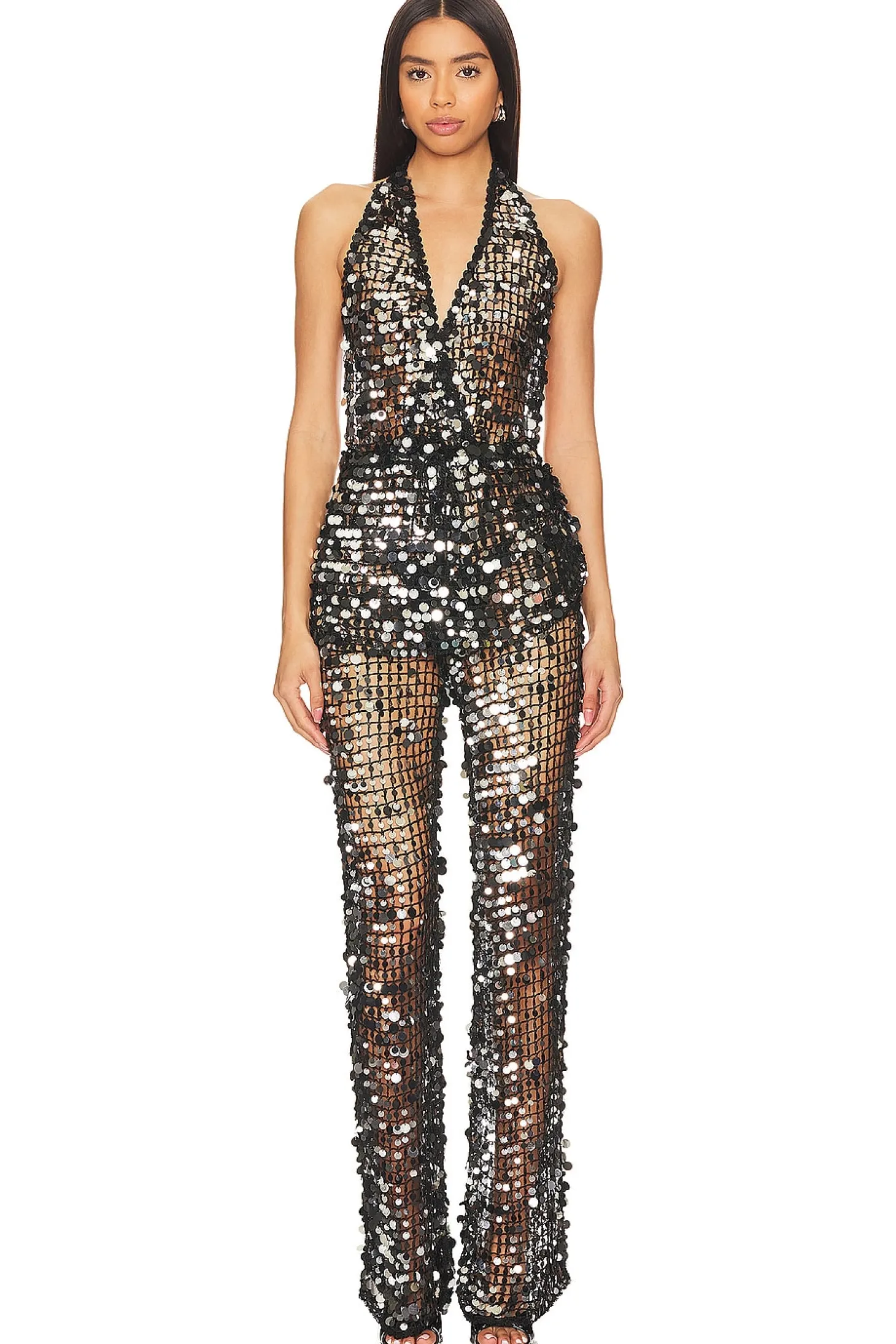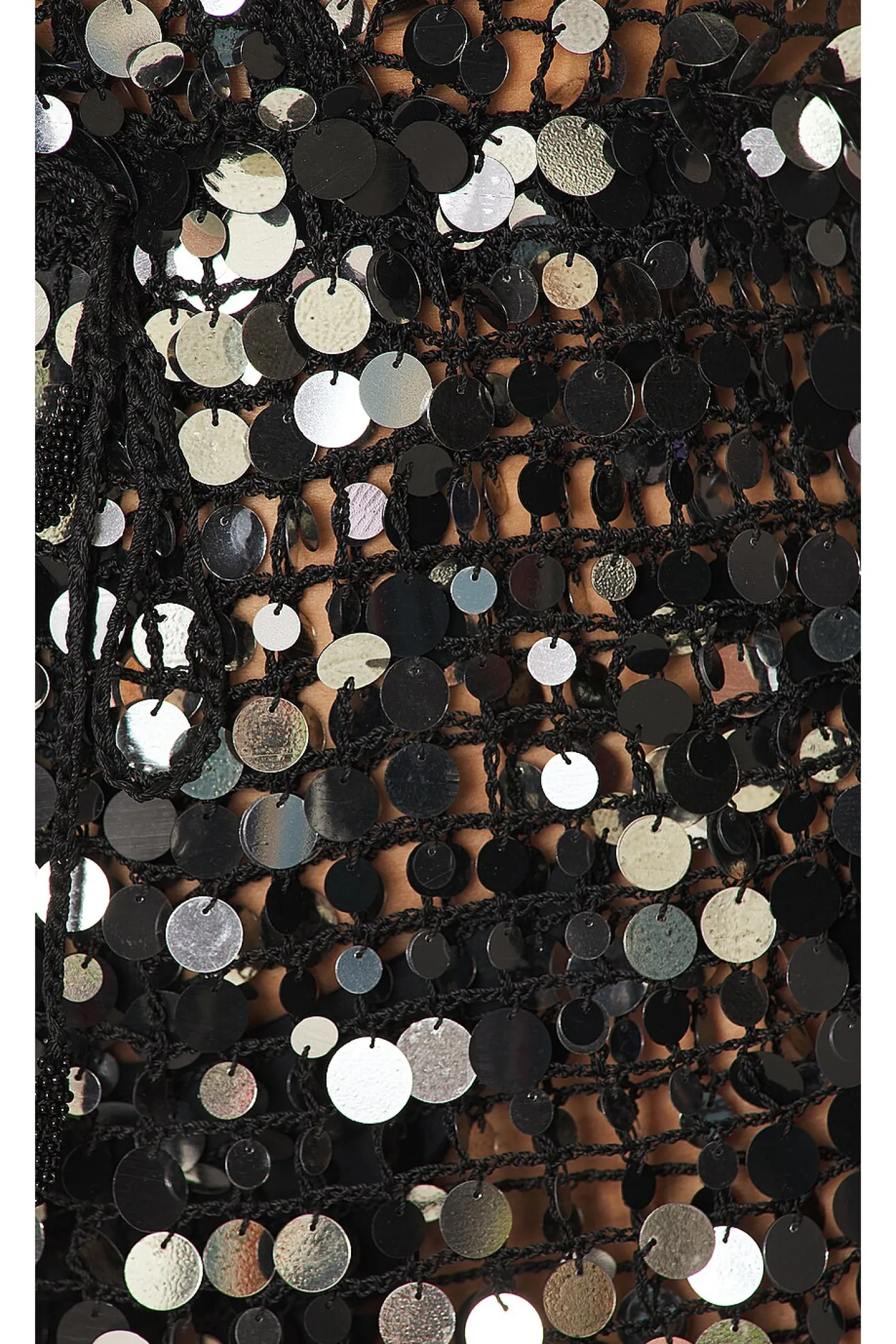 100% viscose.Made in India.Dry clean only.Back tie closure.Sequin-embellished crochet knit fabric.Garment is intentionally sheer, undergarments will show through..Please note undergarment not included