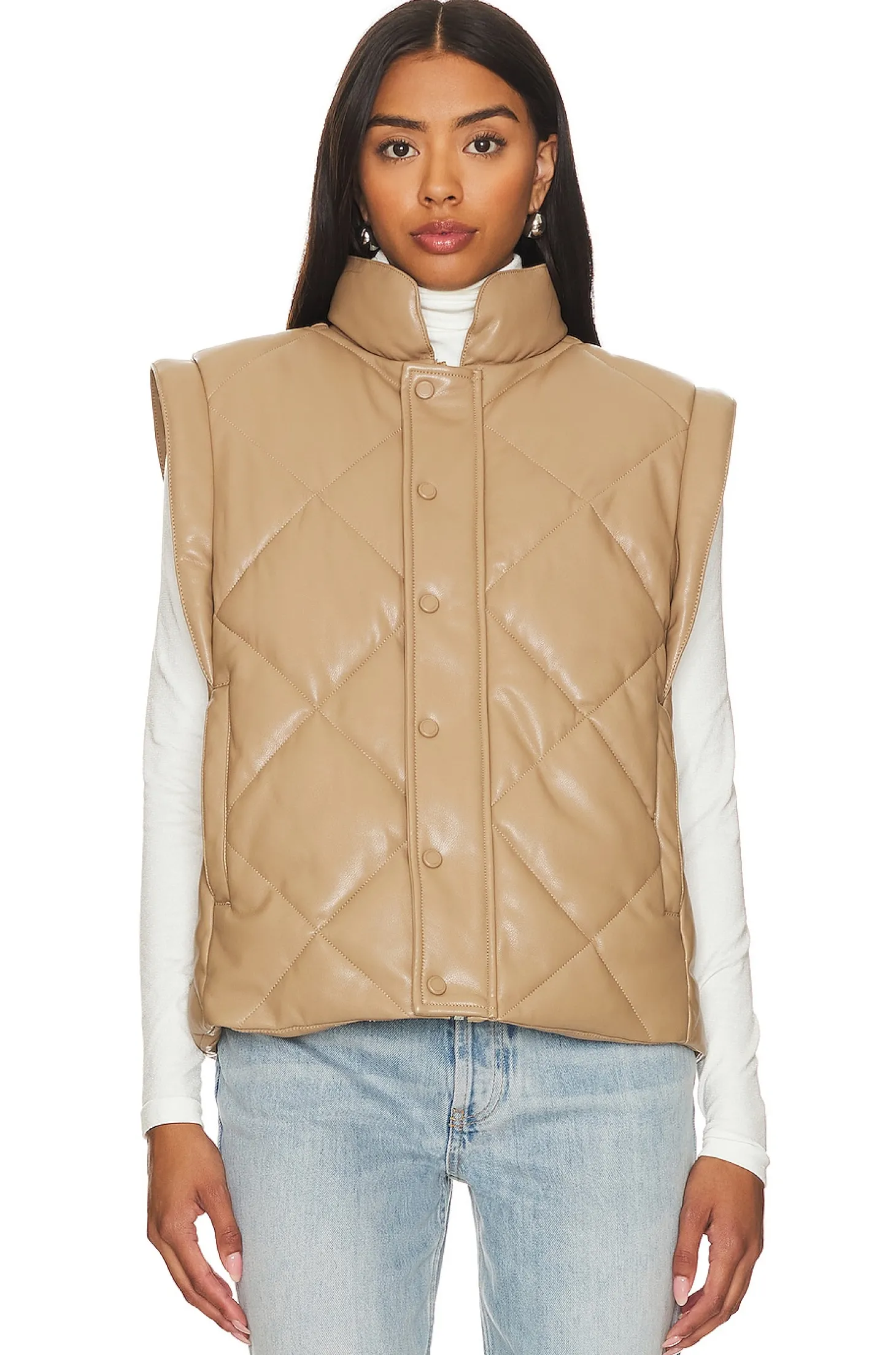 Polyurethane blend.Imported.Hand wash recommended.Front zipper and button closure.Side seam pockets.Stand up collar.Midweight padded faux leather fabric