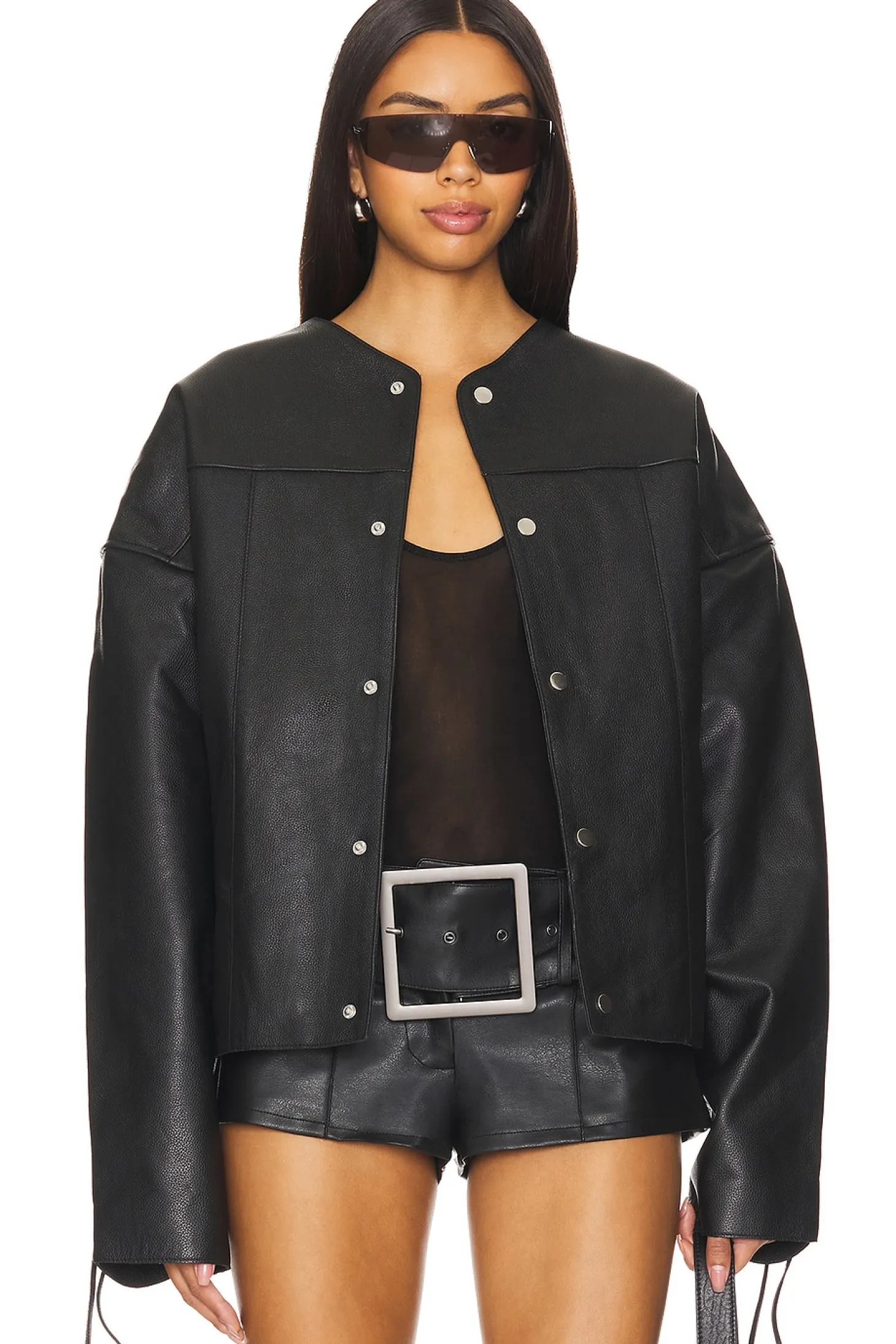 Self: 100% lambskin Lining: 100% recycled polyester.Made in India.Professional leather care.Front snap closure.Front slant welt pockets Lace-up detailing at cuffs and sides.Heavyweight leather fabric
