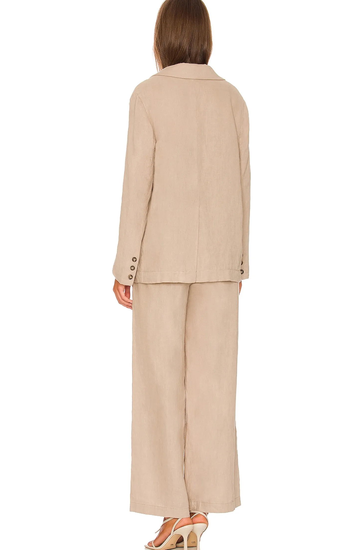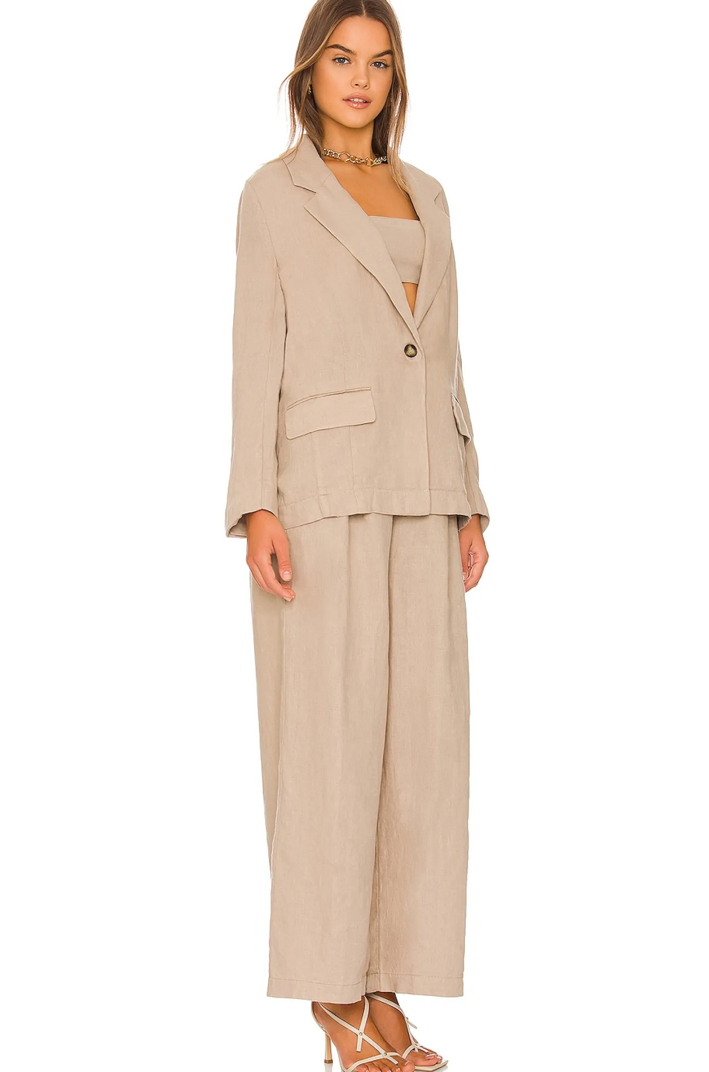 Self: 100% linen Lining: 50% poly 50% cotton.Made in Turkey.Machine wash.Blazer: Front button closure Flap welt pockets Buttoned cuffs.Top: Smocked back Button detail at shoulder straps.Bottom: Elastic waistband Front slant pockets Pleated fabric.22.50" at the knee breaks to 24" at the leg opening