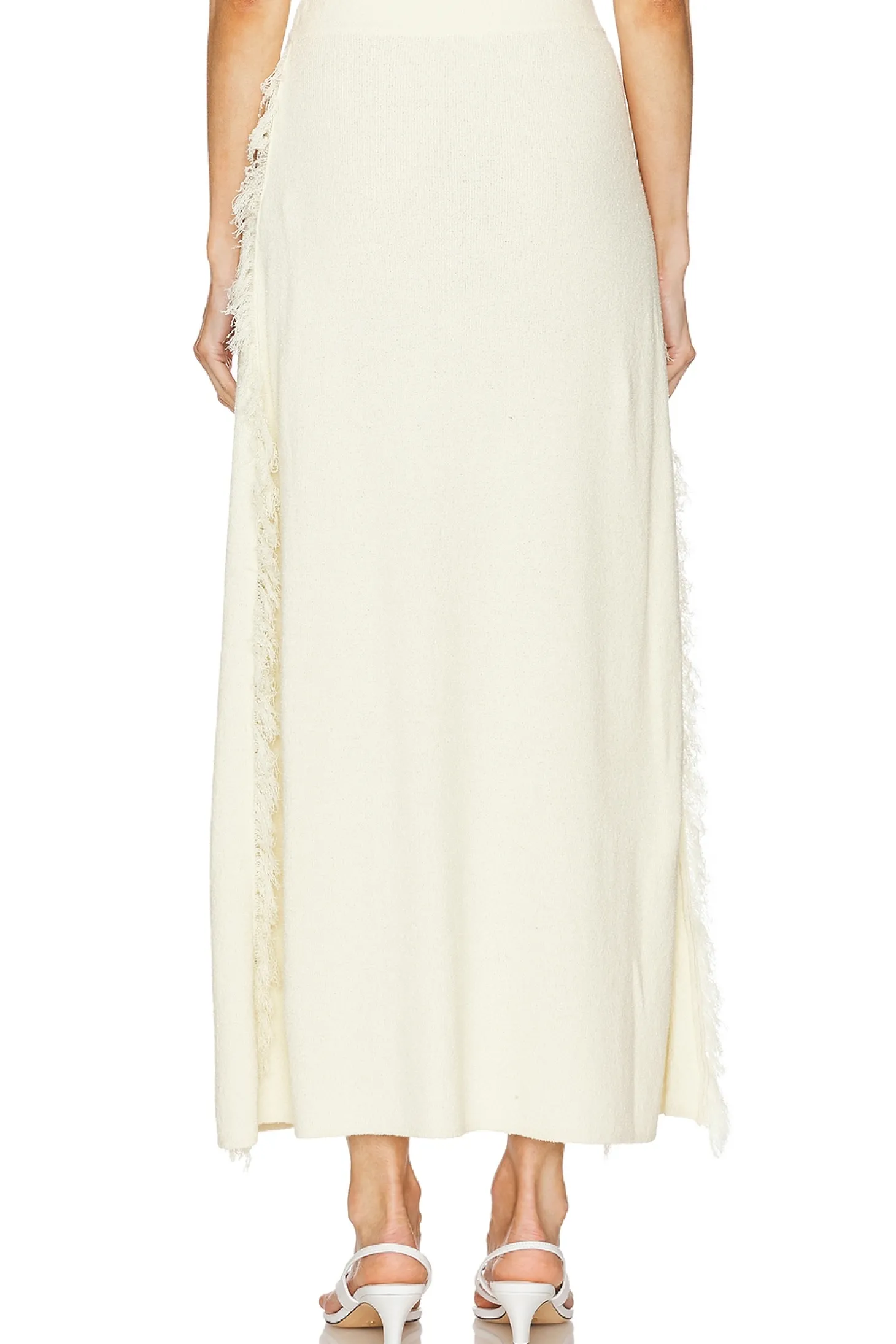 65% cotton 35% nylon.Made in China.Dry clean only.Unlined.Pull-on styling with elastic waistband.Slinky knit fabric with fringe trim.Item not sold as set.Waist to shortest hem measures approx 16" and to longest hem approx 38" in length