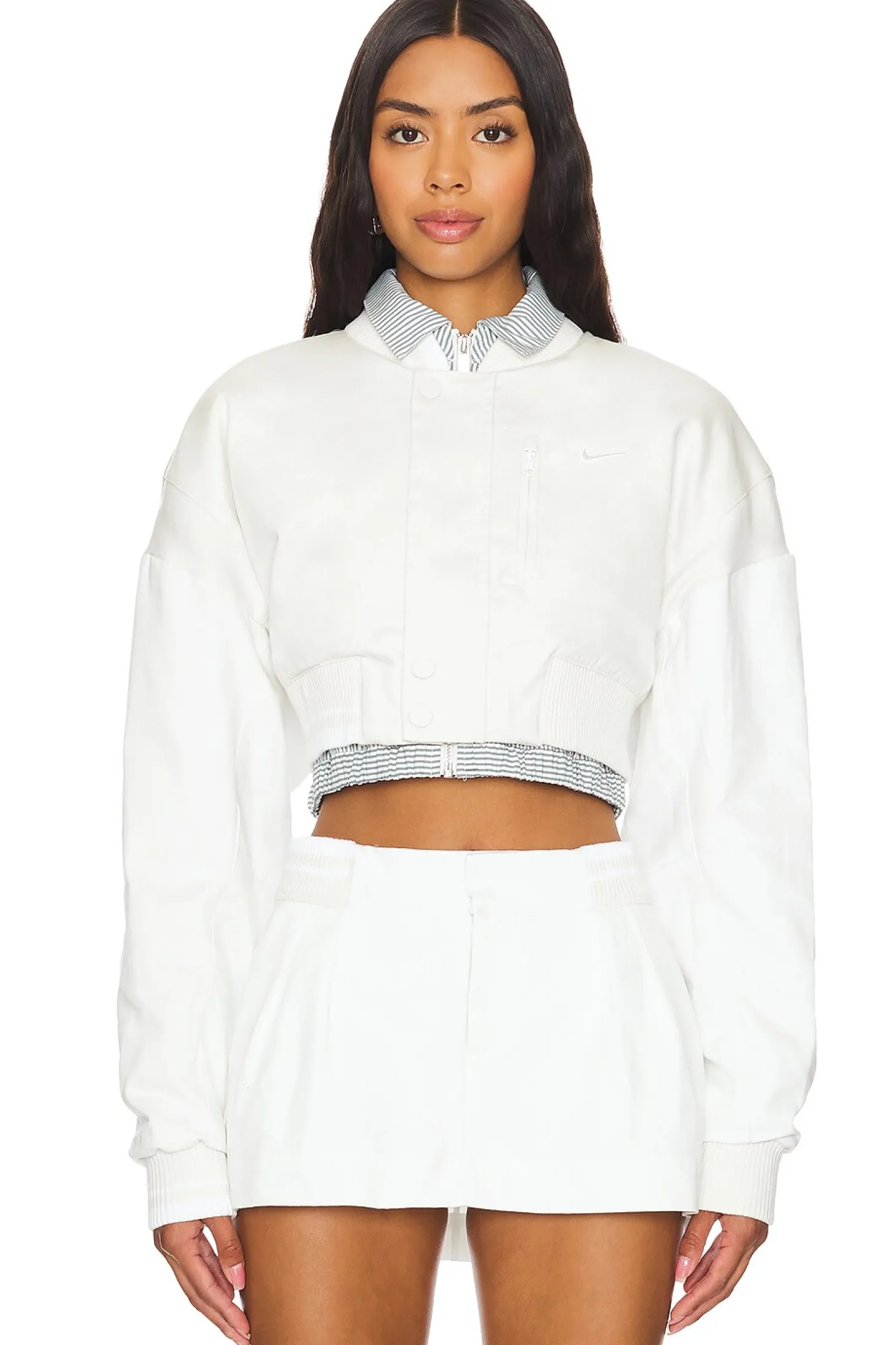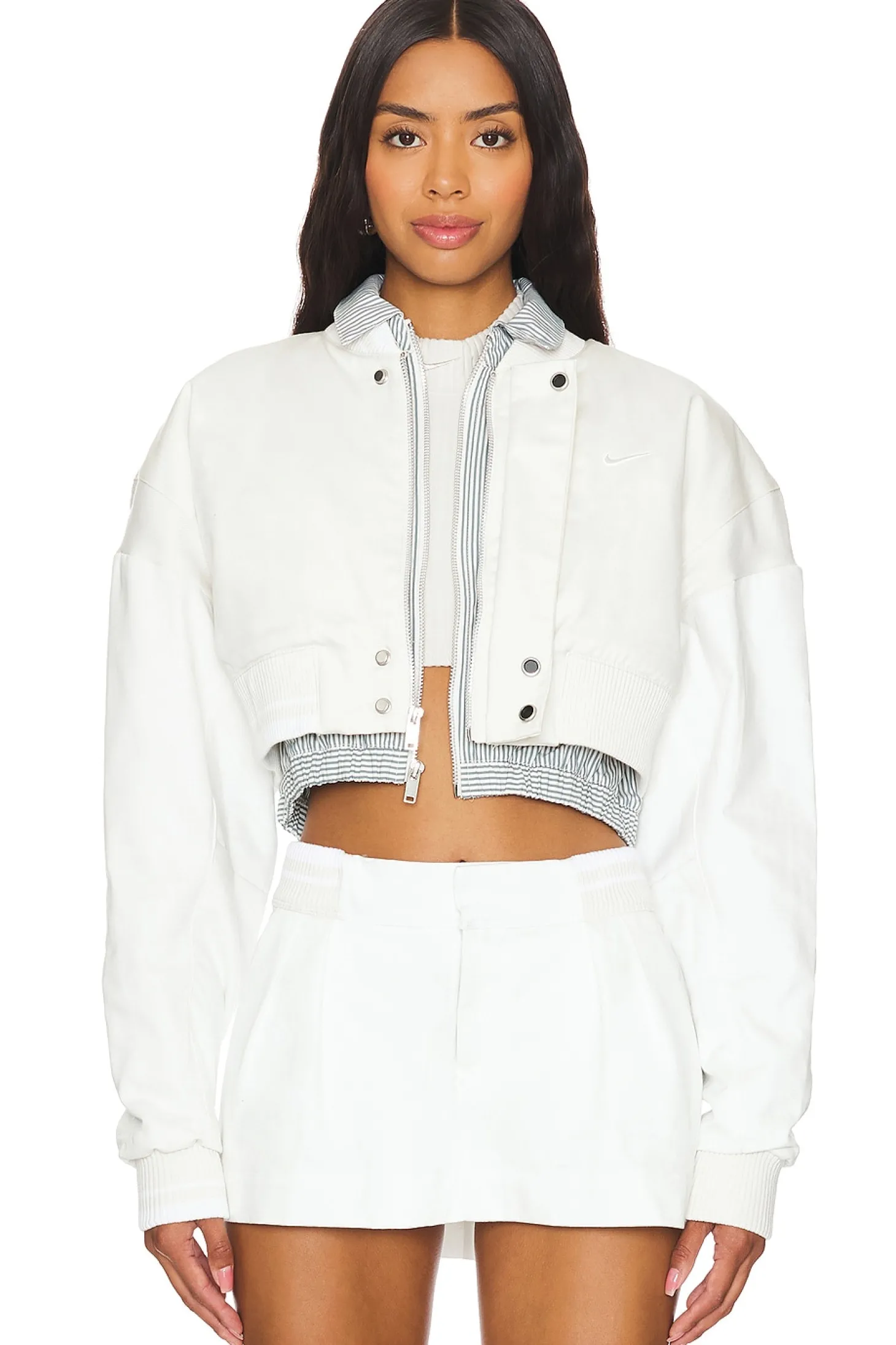 Self: 100% cotton Rib: 97% polyester 3% spandex Panels: 97% cotton 3% spandex Underlay: 63% cotton 34% nylon 3% spandex Lining: 100% polyester Fill: 100% polyester.Made in Indonesia.Machine wash.Front zipper closure.Breast pocket with zip closure.Ribbed cuffs and hem.Canvas fabric with floating collar shirt with zip closure