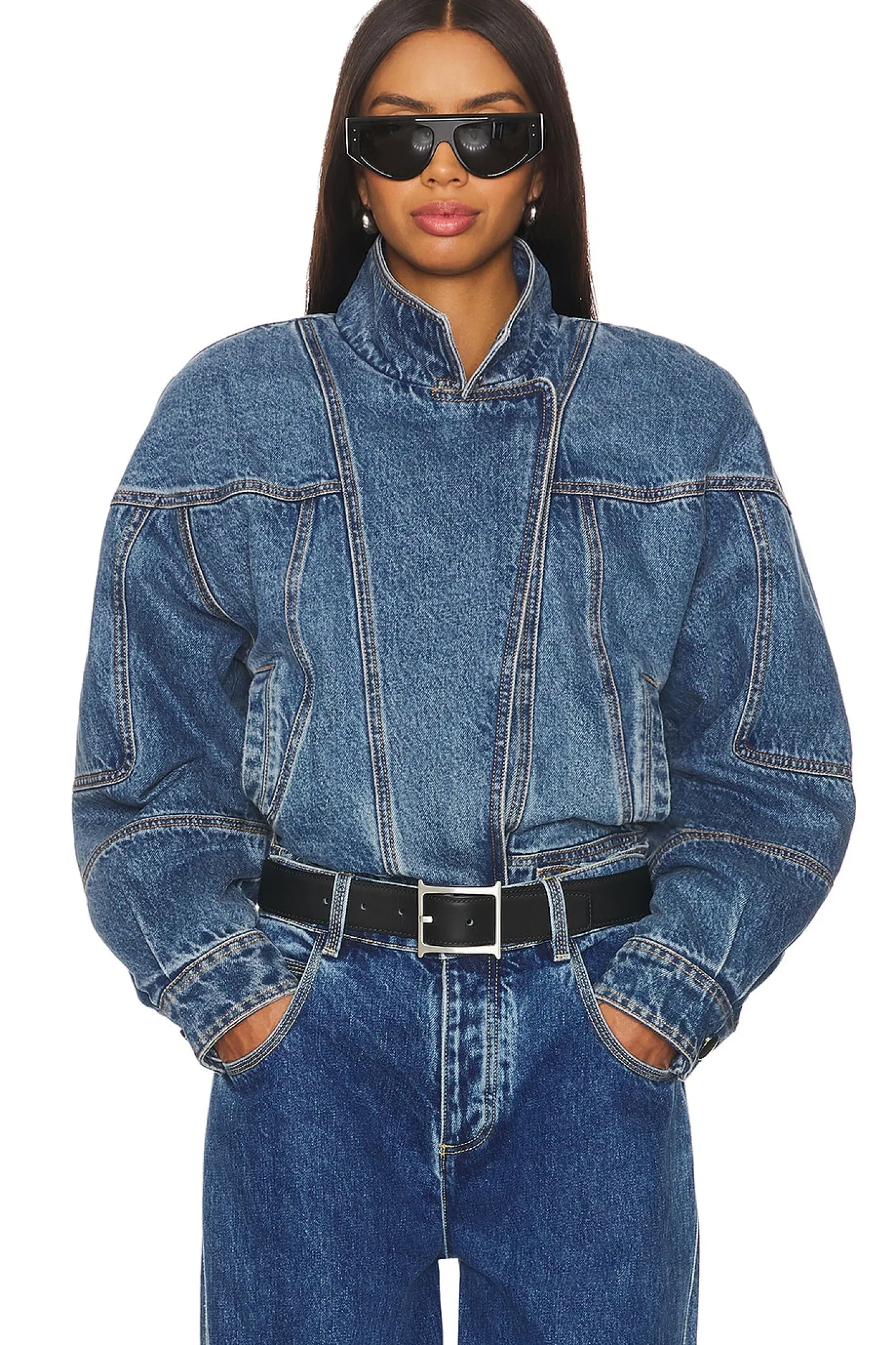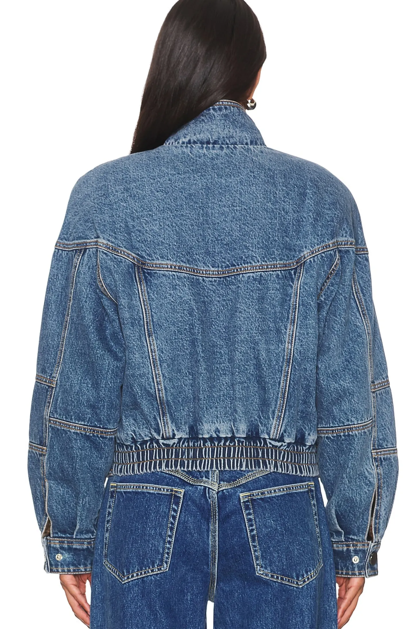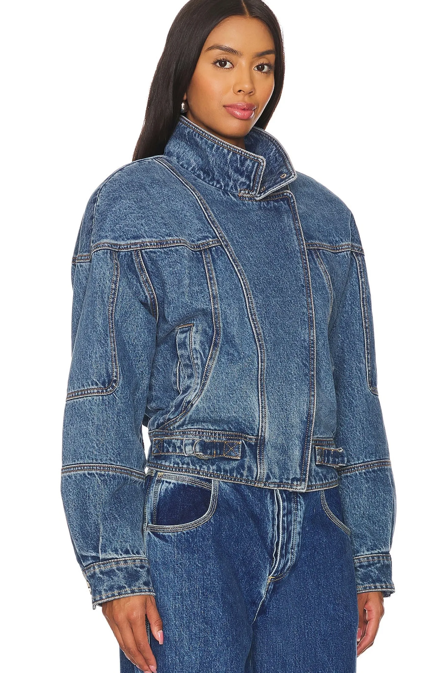 Self: 100% cotton Combo: 100% cotton.Made in China.Machine wash.Front zipper closure with snap button closure.Side pockets and single interior breast pocket.Snap buttoned cuffs and waist buckle accents.Stuffed denim with elastic hem