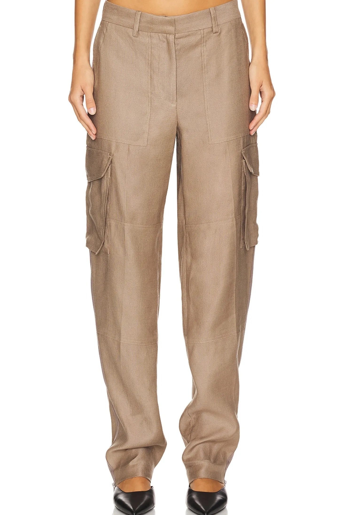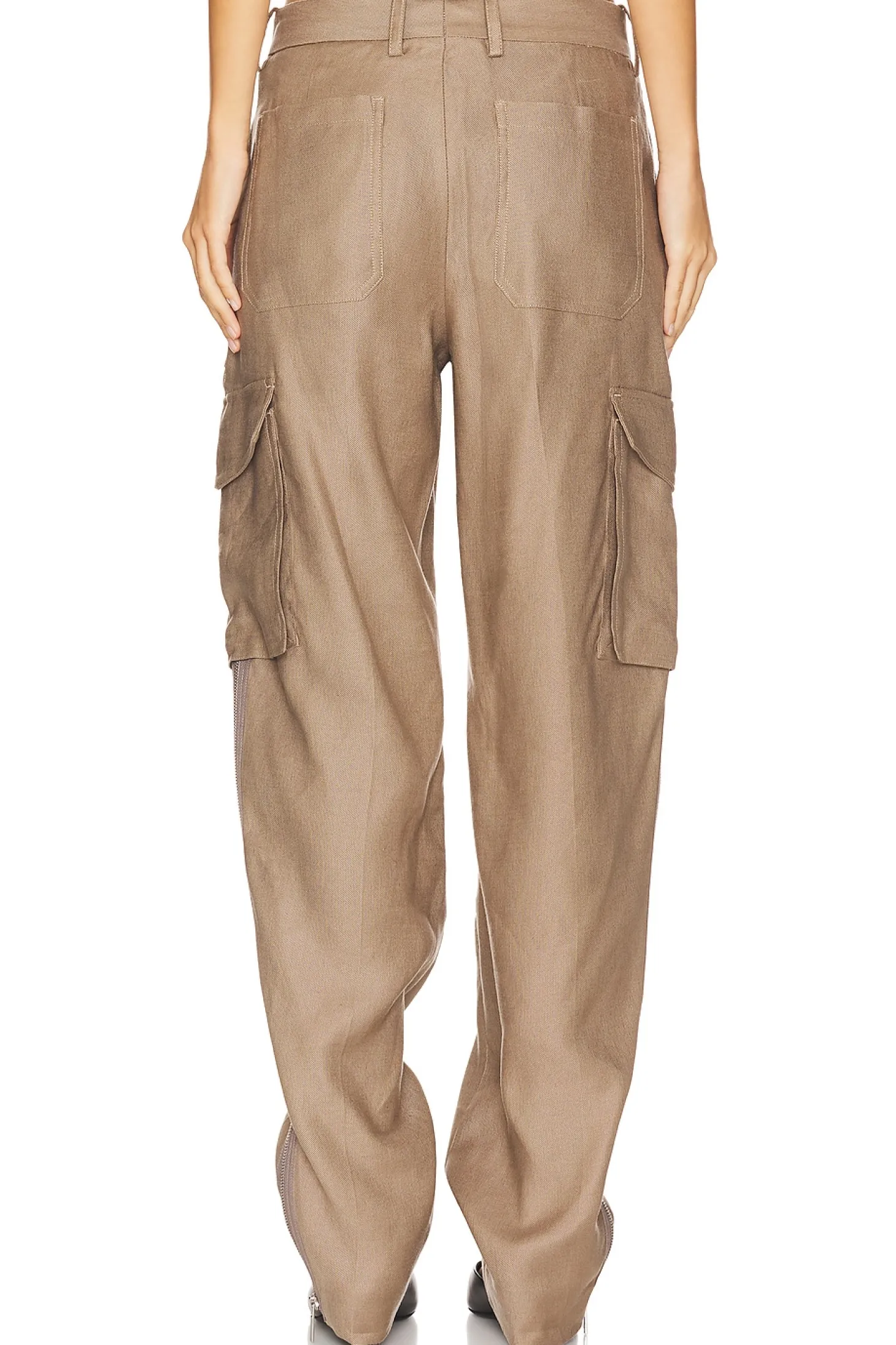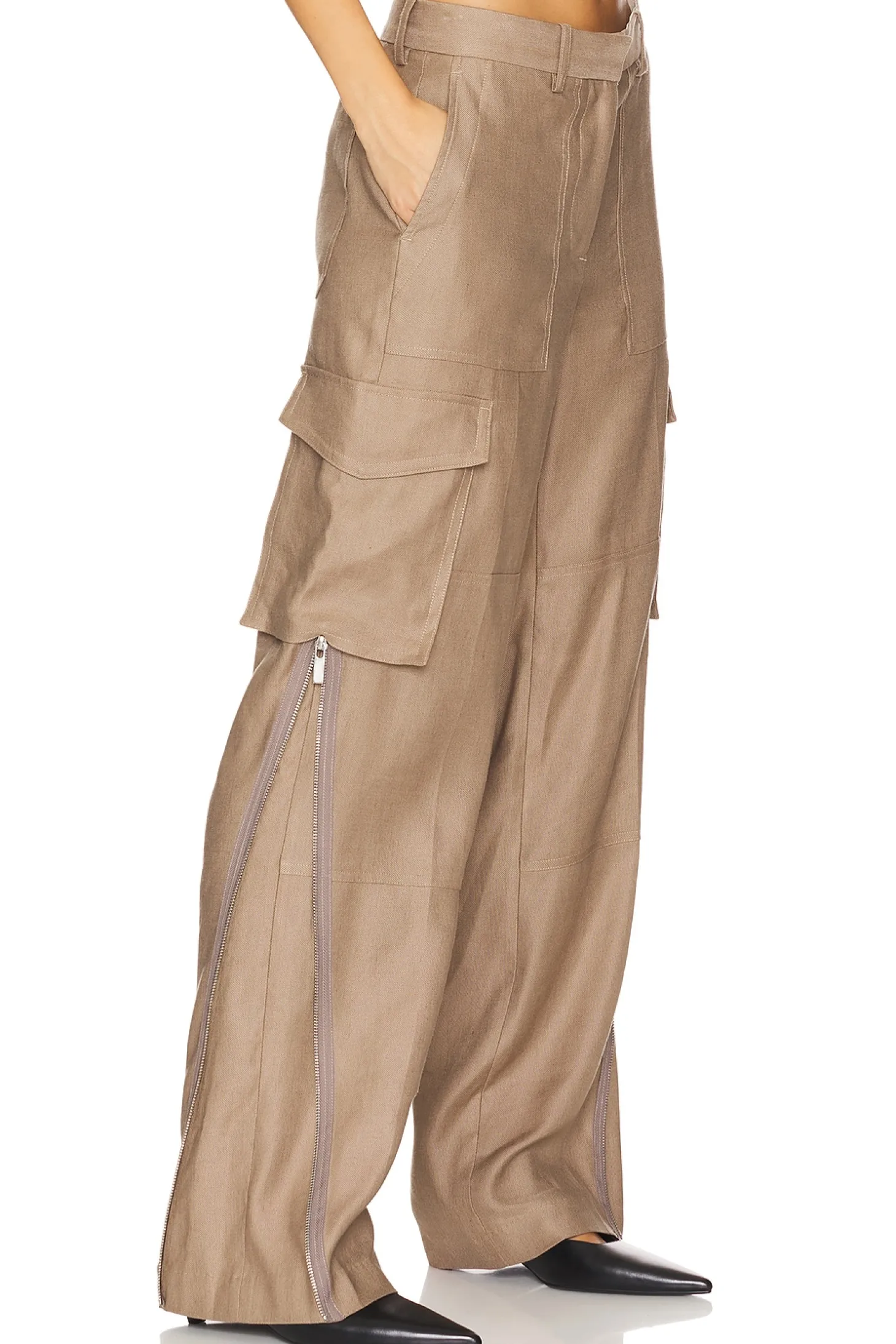 67% lyocell 33% linen.Made in China.Dry clean only.Zip fly with hook and bar closure.6-pocket design.Cargo styling with zipper closure accent along sides.Twill fabric.20" at the knee and 20" at the leg opening