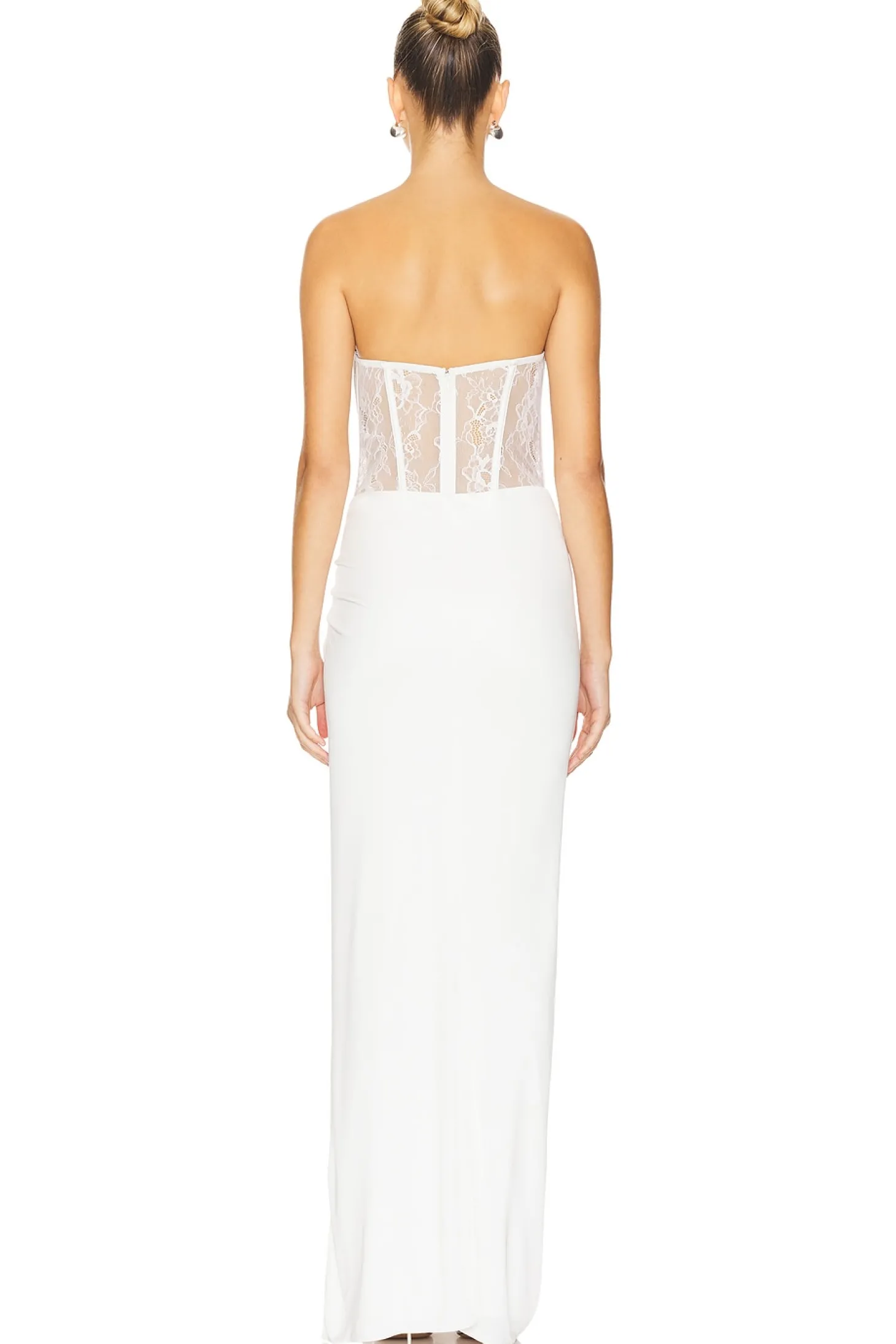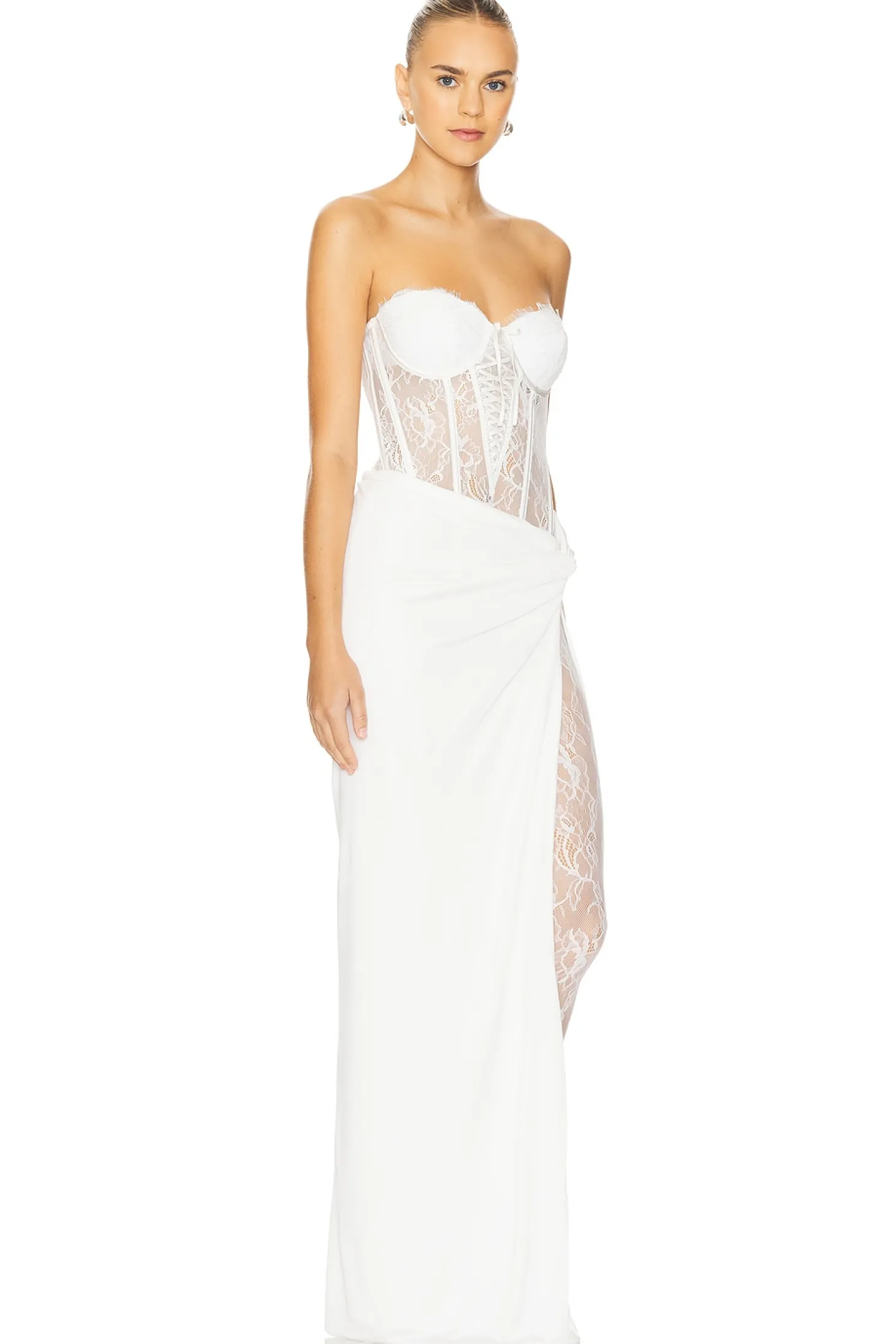 Self 1: 87% nylon 13% spandex Self 2: 85% viscose 15% silk Self 3: 95% silk 5% spandex Self 4: 100% nylon Self 5: 100% polyester.Made in China.Dry clean.Hidden back zipper closure.Padded underwire cups Corset style lace-up detail.Boned sides Zippered cuffs at lace jumpsuit.Lace jumpsuit with detachable jersey spandex skirt with side seam split.Neckline to hem measures approx 47.5" in length 11" at the knee narrows to 7" at the leg opening