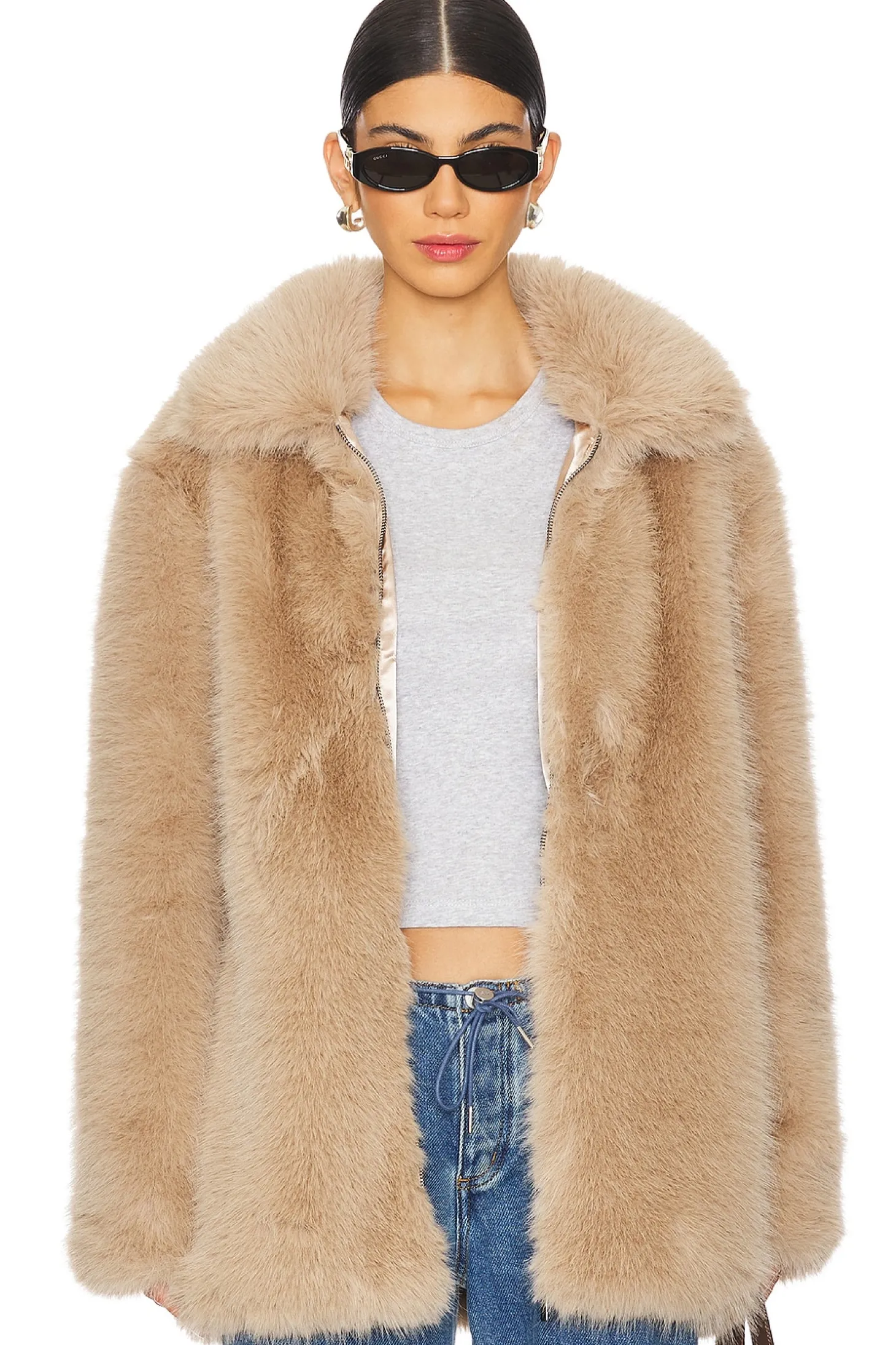 Faux Fur: 100% polyester Lining: 100% polyester.Made in China.Machine wash.Hidden front zipper closure.Faux fur exterior