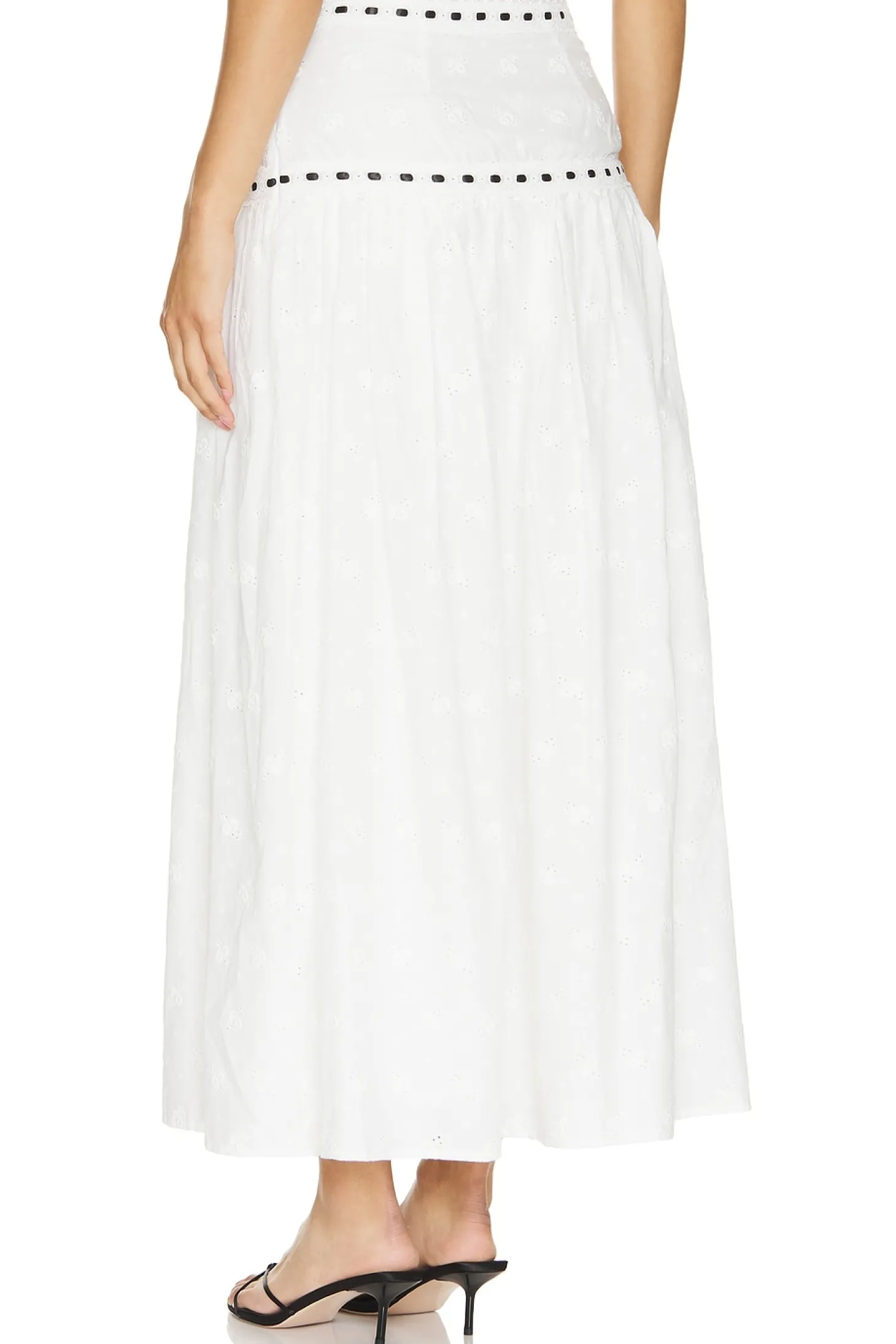 Shell: 100% cotton Lining: 100% viscose.Made in China.Hand wash cold.Fully lined.Hidden side zipper closure.Satin drawstring embellishment.Poplin fabric with floral embroidery.Skirt measures approx 37.5" in length