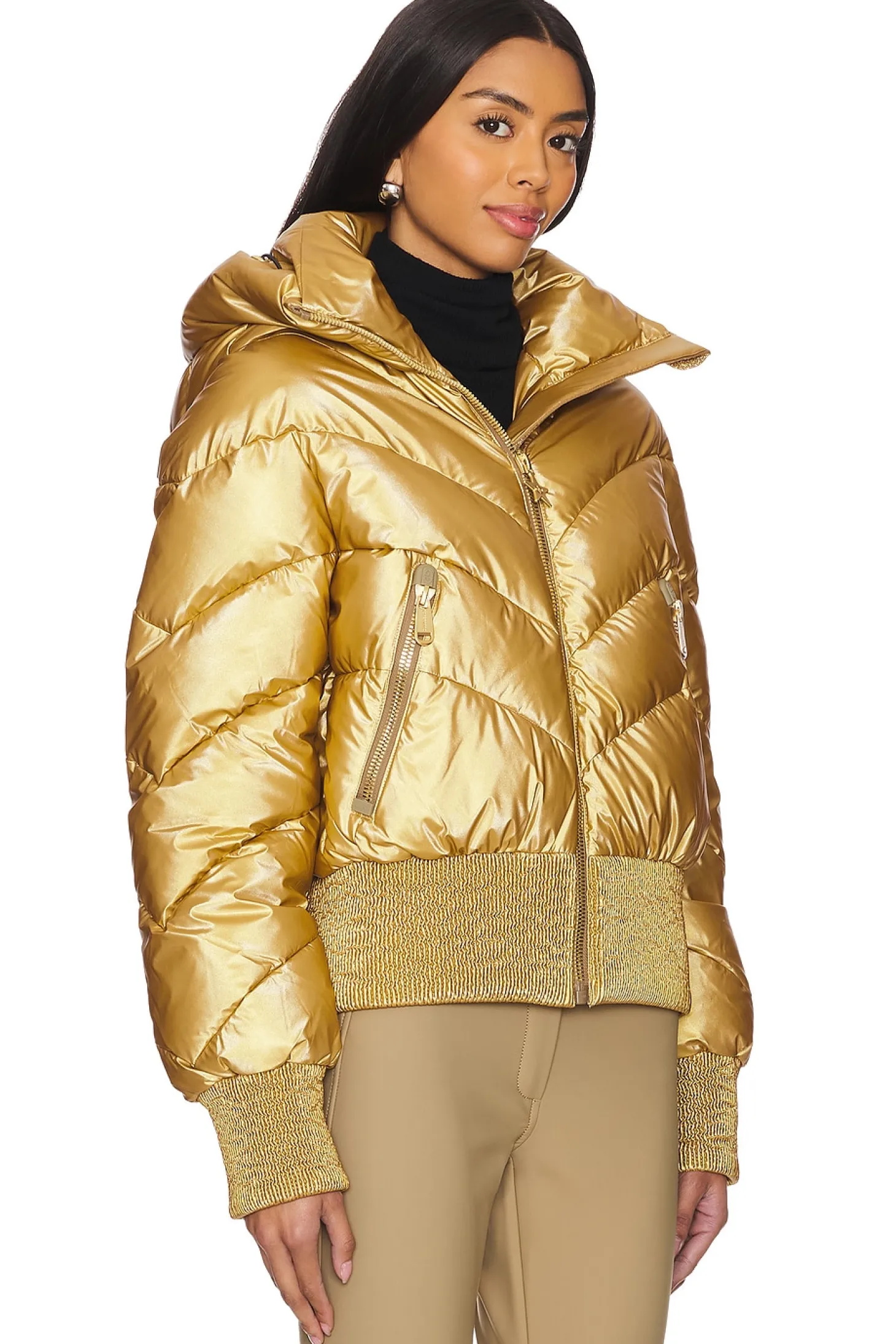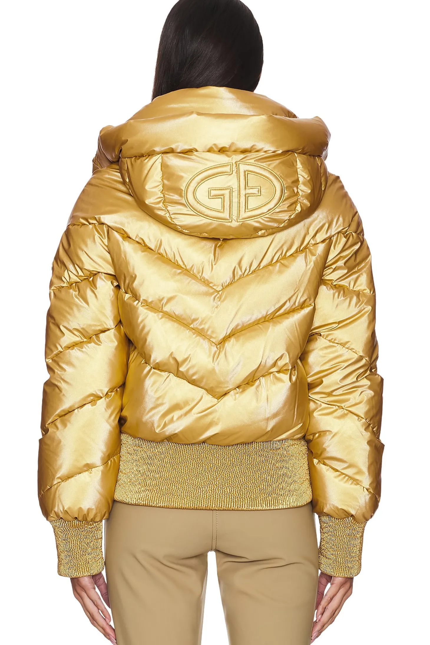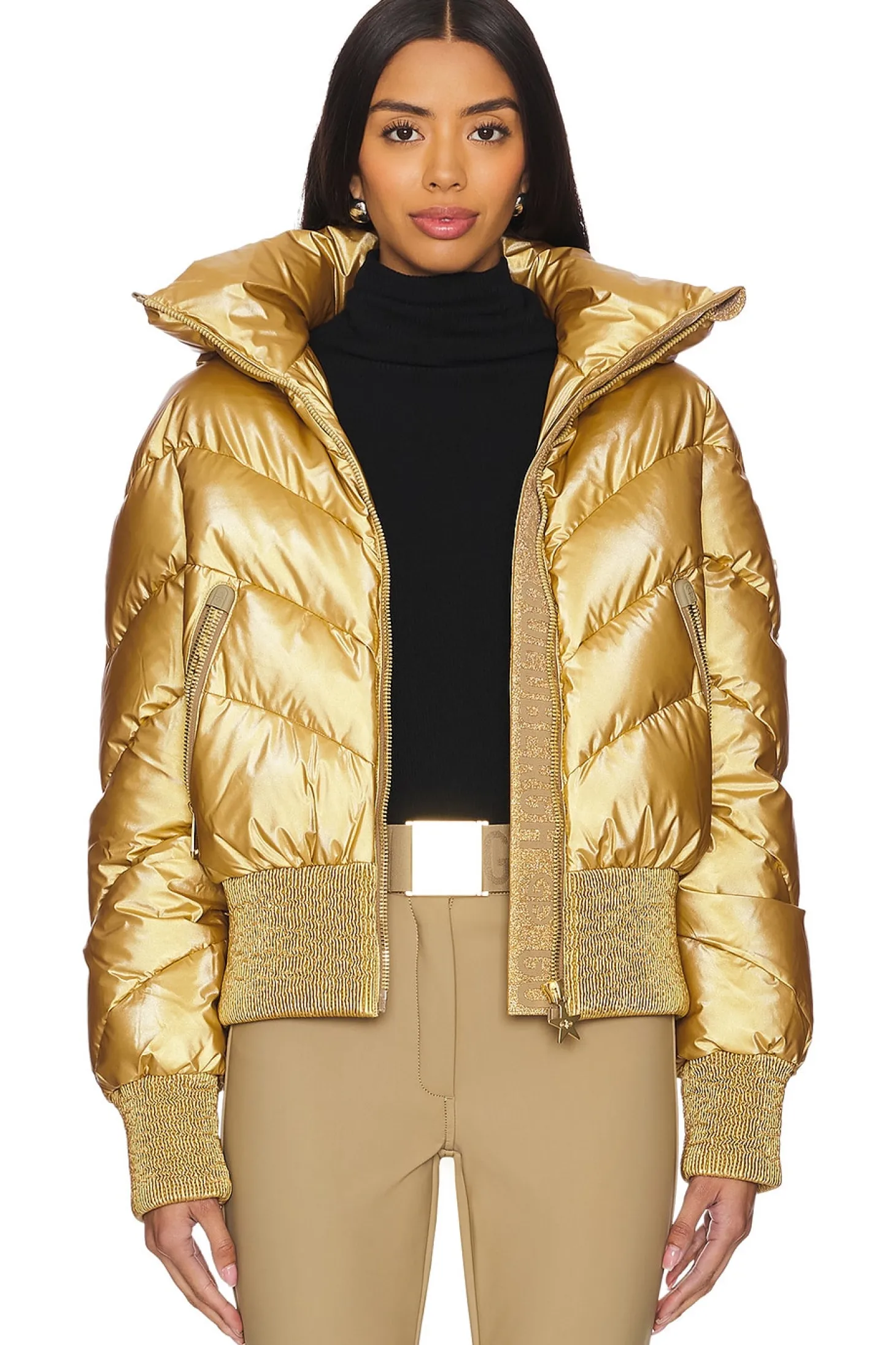Self: 52% polyurethane 48% polyester Lining: 58% polyester 42% recycled polyester Filling: 90% duck down 10% feathers.Made in China.Machine wash.Front zip closure with gold-tone star accent.Front zip pockets and attached hood with logo detailing.Heavyweight ripstop fabric with ribbed elasticized trim