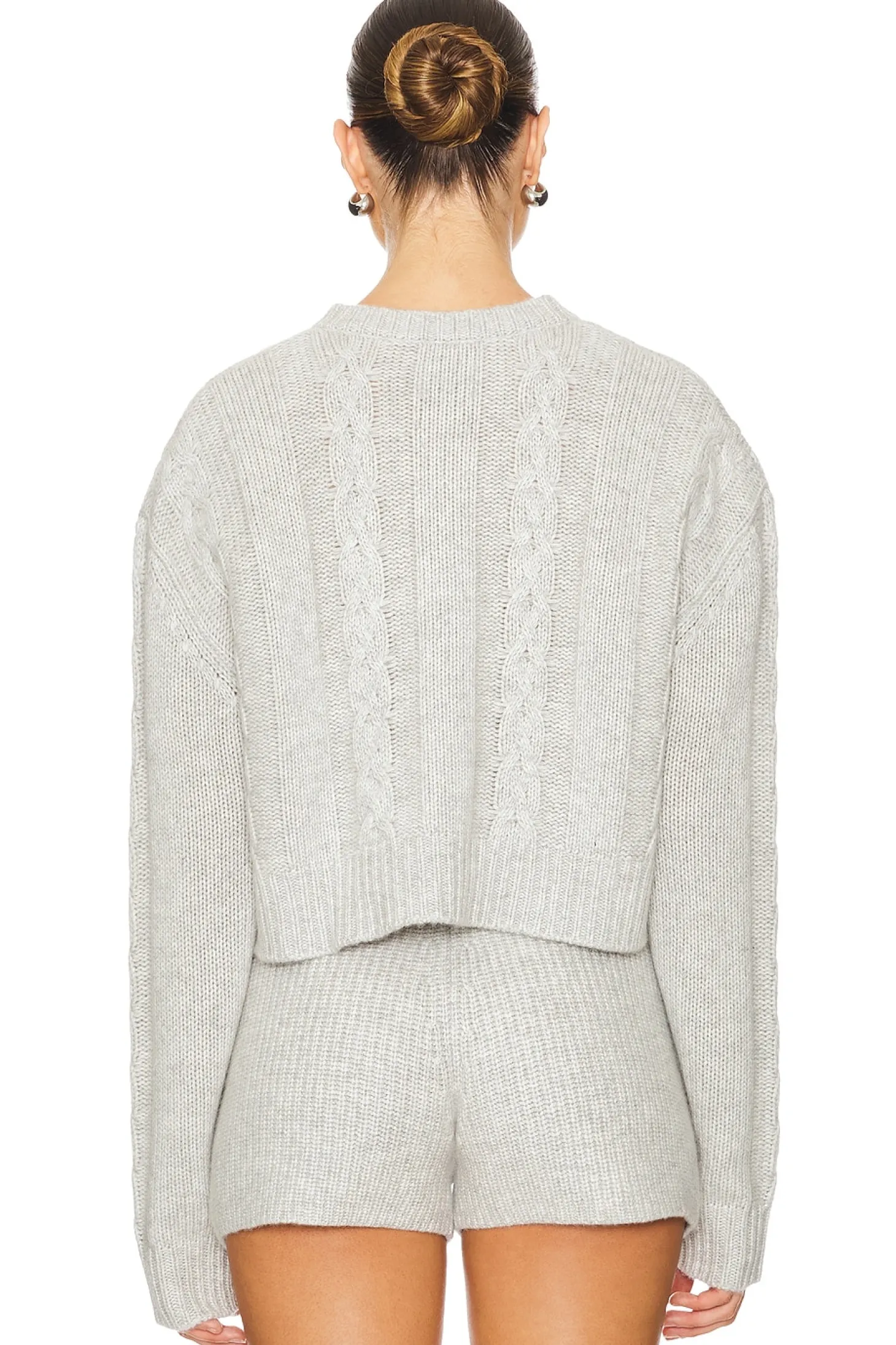 50% cashmere 50% wool.Made in China.Hand wash.Front button closure.Drop shoulder.Midweight cable knit fabric.Item not sold as a set