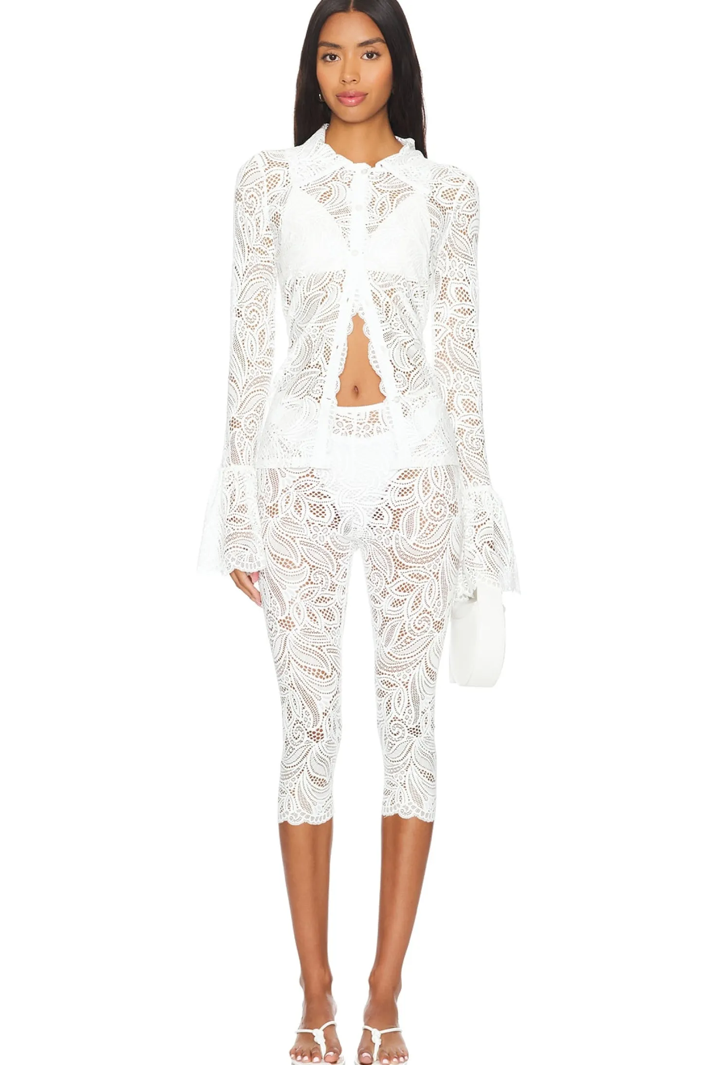 90% nylon 8% spandex 2% rayon.Made in Portugal.Hand wash.Stretch lace fabric.Item not sold as a set.Garment is intentionally sheer, undergarments will show through. Please note undergarment not included.Leggings measure approx 30" in length