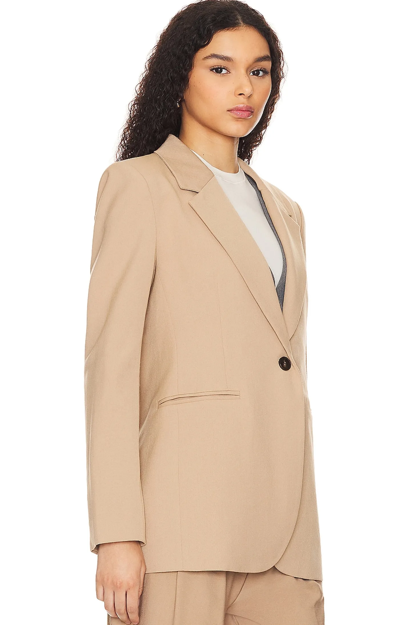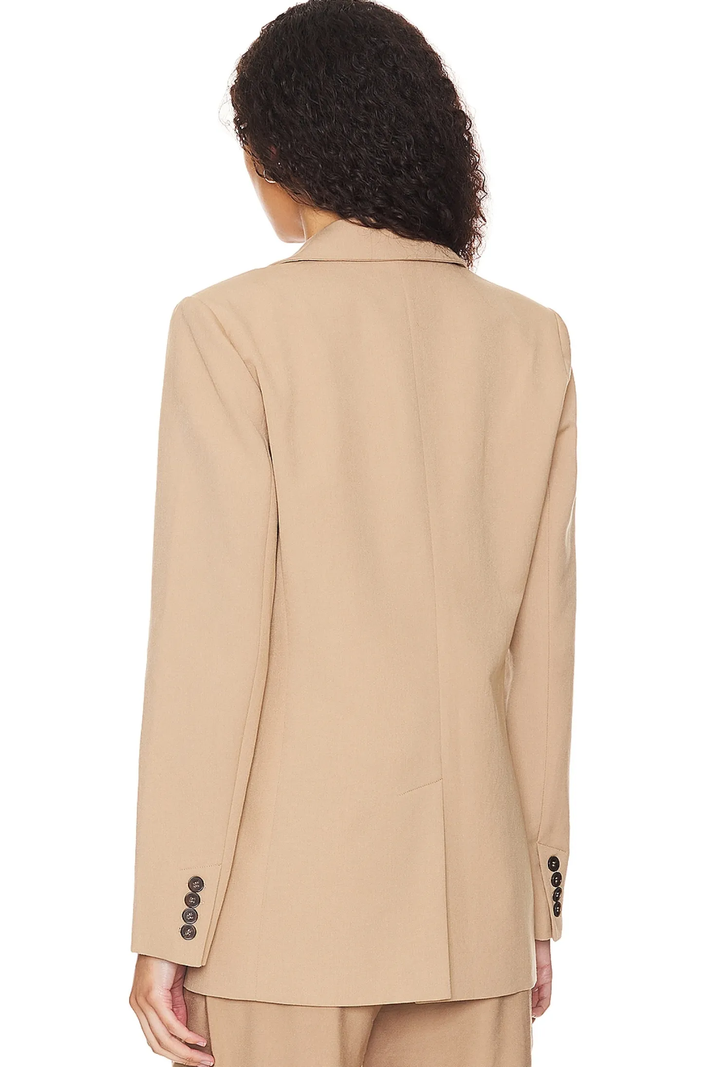 Self: 90% cotton 10% viscose Lining: 100% polyester.Made in China.Hand wash.Singular front button closure.Padded shoulders.Side welt pockets.Button cuffs.Crepe fabric