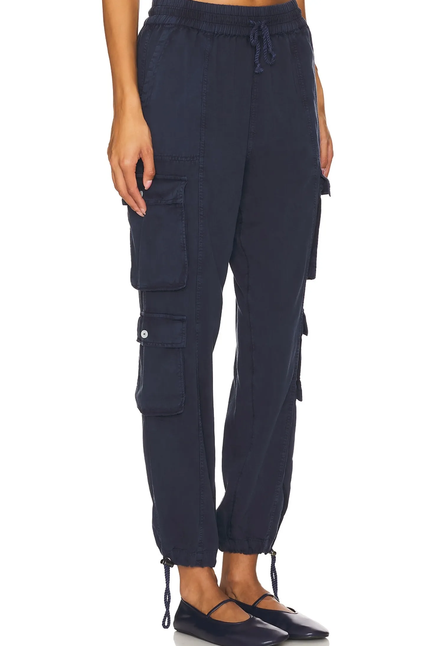 55% cotton 45% viscose.Made in India.Hand wash.Drawstring closure.4-pocket design.Cargo pockets Drawstring cuffs.Lightweight twill fabric Item not sold as a set.19" at the knee narrows to 14" at the leg opening