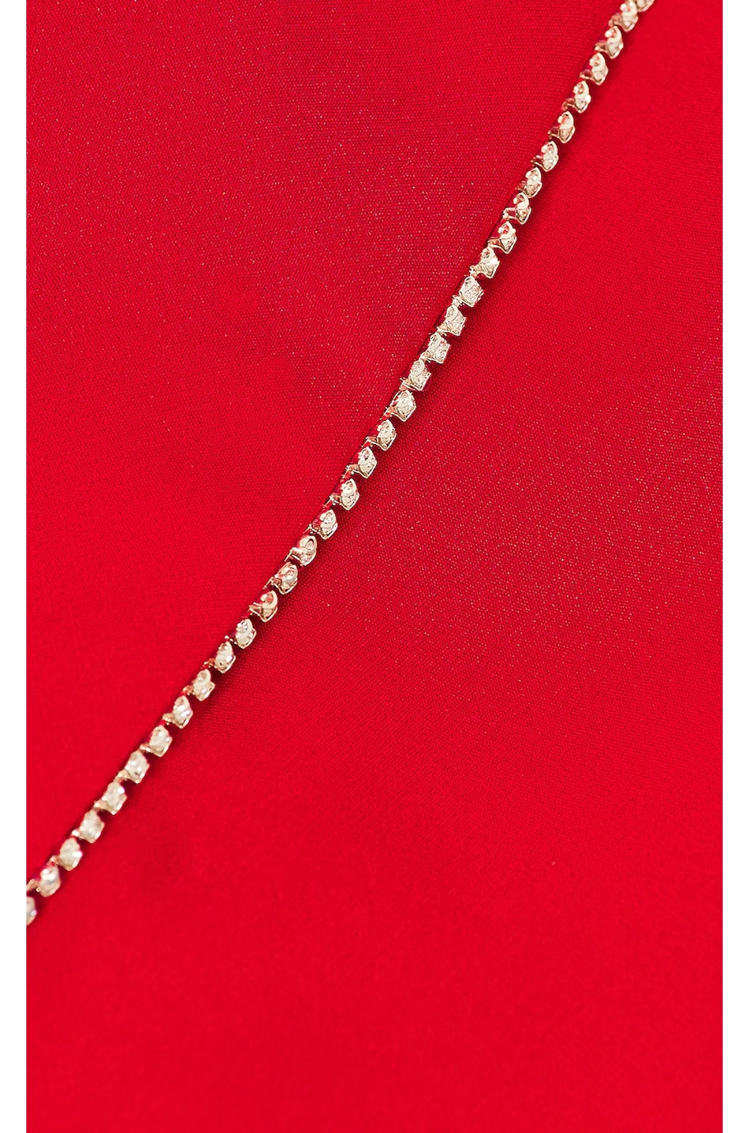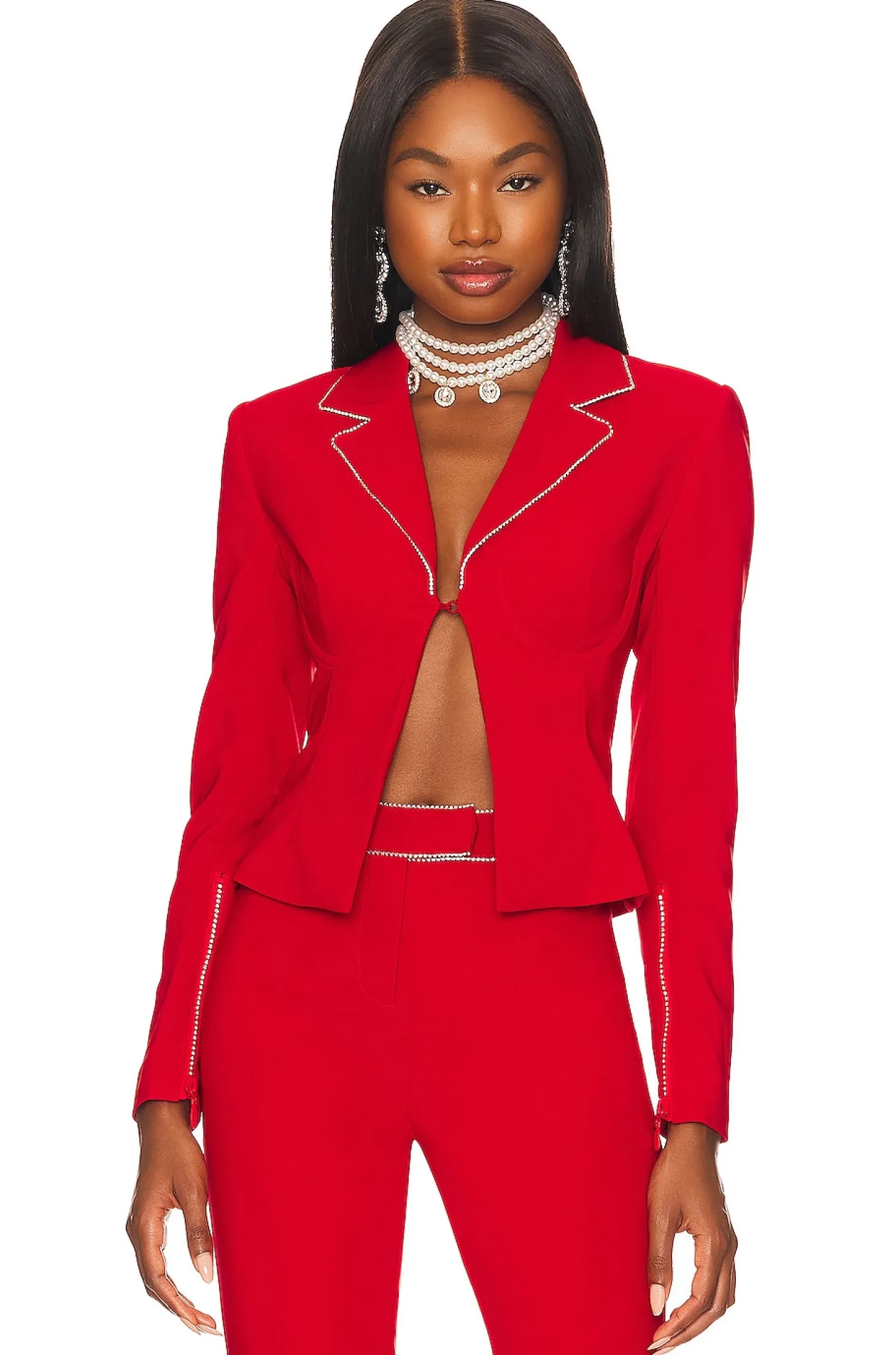 Self: 94% polyester 6% elastane Lining: 97% polyester 3% elastane.Made in China.Dry clean only.Front hook and eye closure.Padded shoulders.Sleeve zipper detail with rhinestone embellishment.Underwire cups.Item not sold as a set