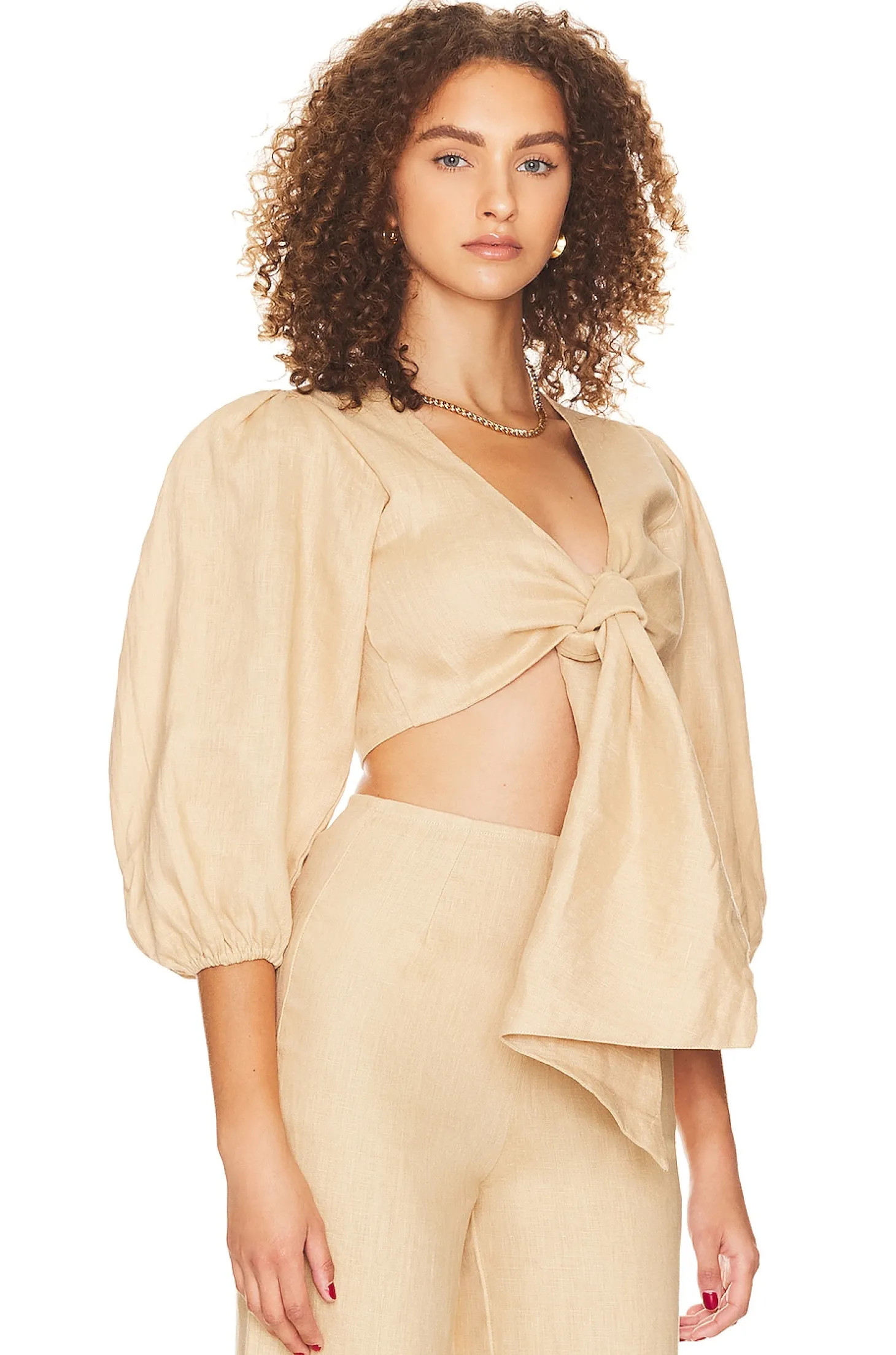 100% linen.Made in Indonesia.Hand wash.Front tie closure.Puff sleeves with elastic cuffs.Lightweight linen fabric.Item not sold as a set