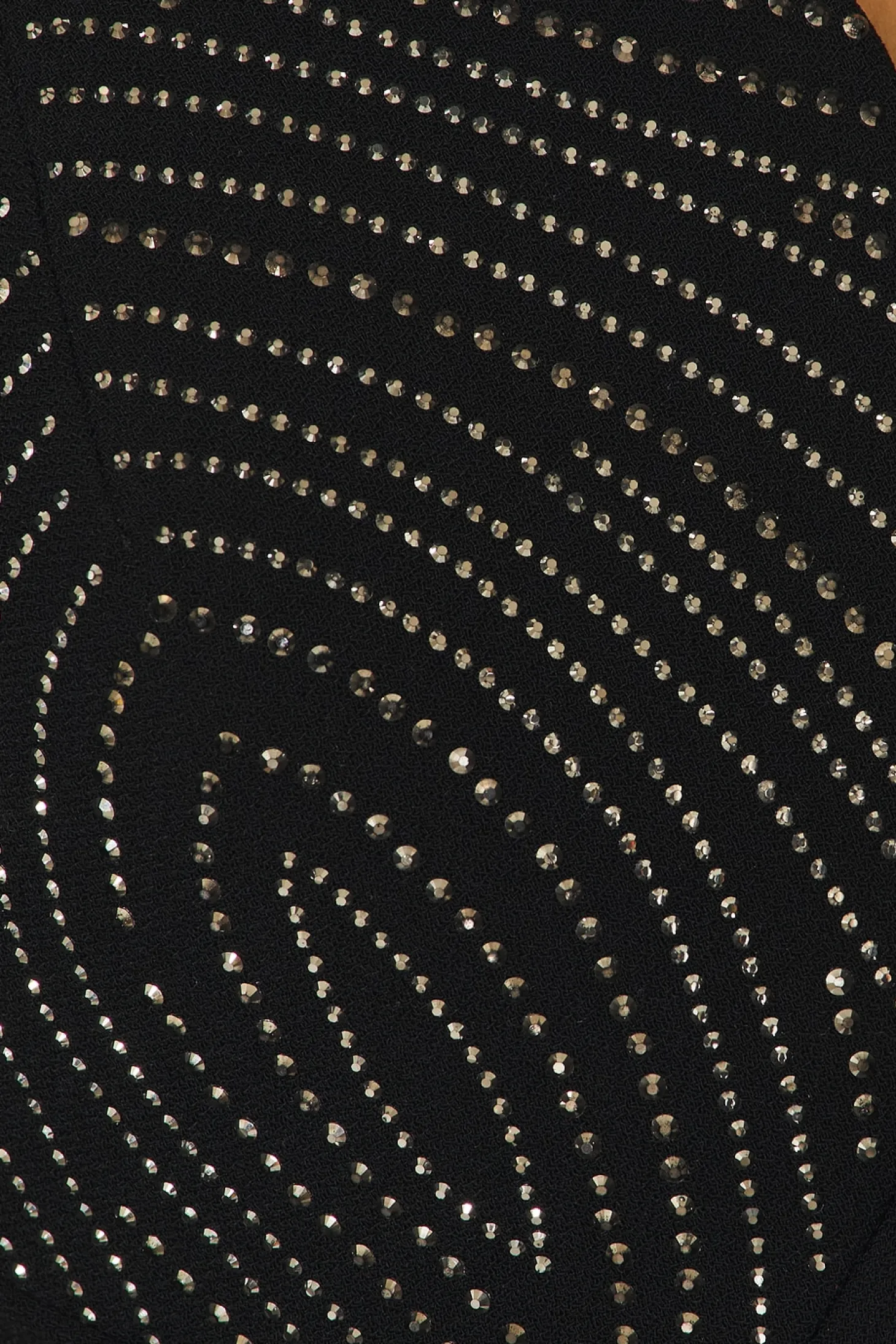 Crepe textile.Imported.Dry clean recommended.Fully lined.Hidden back zipper closure.Plunging neckline and rhinestone embellished cups.Crepe fabric with back slit.Neckline to shortest hem measures approx 26" and to longest hem approx 49" in length