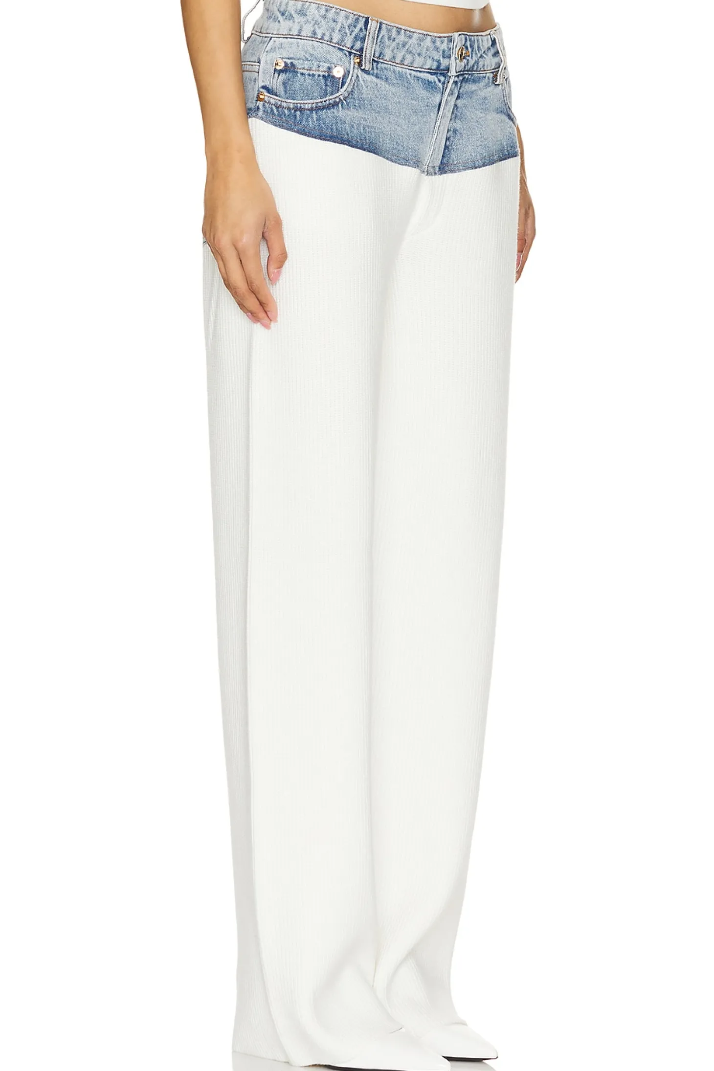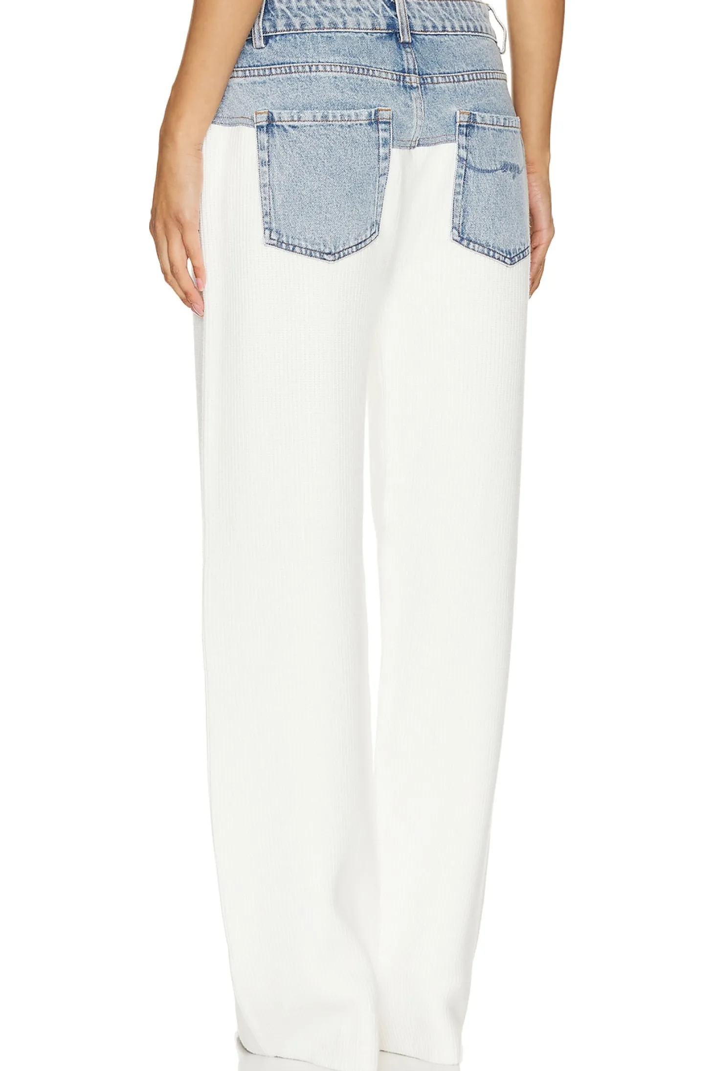 Shell: 55% nylon 20% ppt 16% acrylic 9% wool Trim: 100% cotton.Made in China.Hand wash.Zip fly with button closure.5-pocket design.Denim fabric at waist.Midweight ribbed knit fabric Item not sold as a set.18" at the knee and 18" at the leg opening