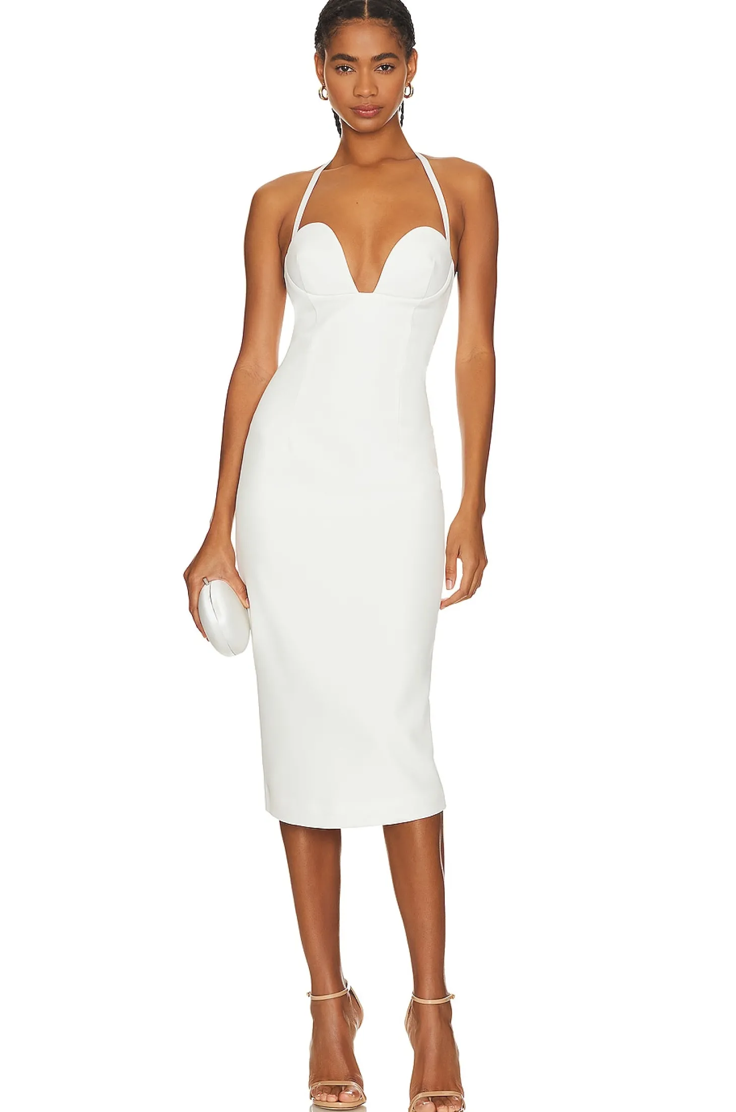 Self: 93% polyester 7% spandex Lining: 95% polyester 5% spandex.Made in China.Dry clean.Fully lined.Exposed back zipper closure Halterneck styling with adjustable snap button closure.Lightly padded cups.Midweight crepe fabric with back vent