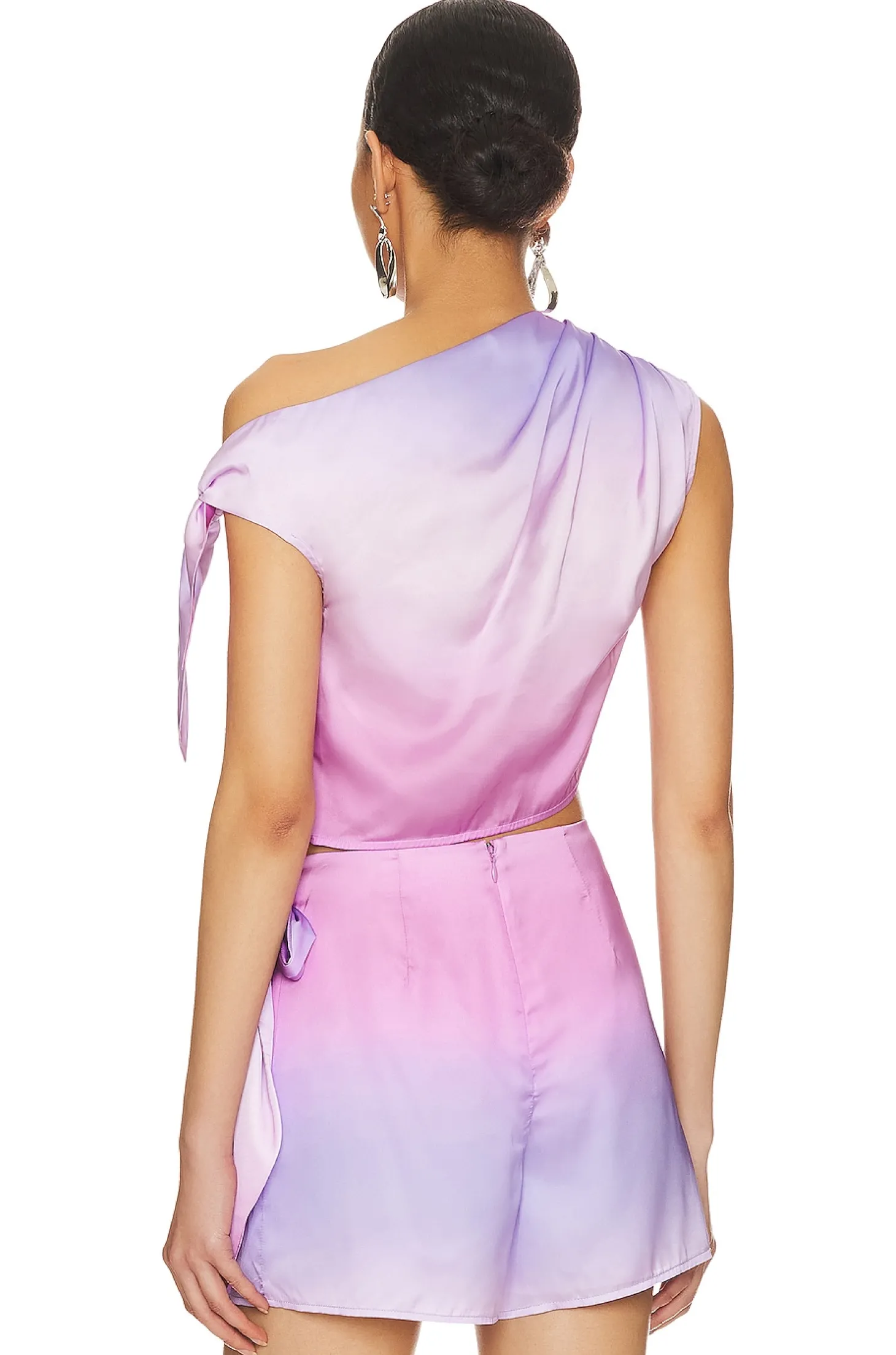 100% polyester.Made in China.Hand wash.One shoulder styling.Attached wrap tie closure at side.Lightweight satin fabric