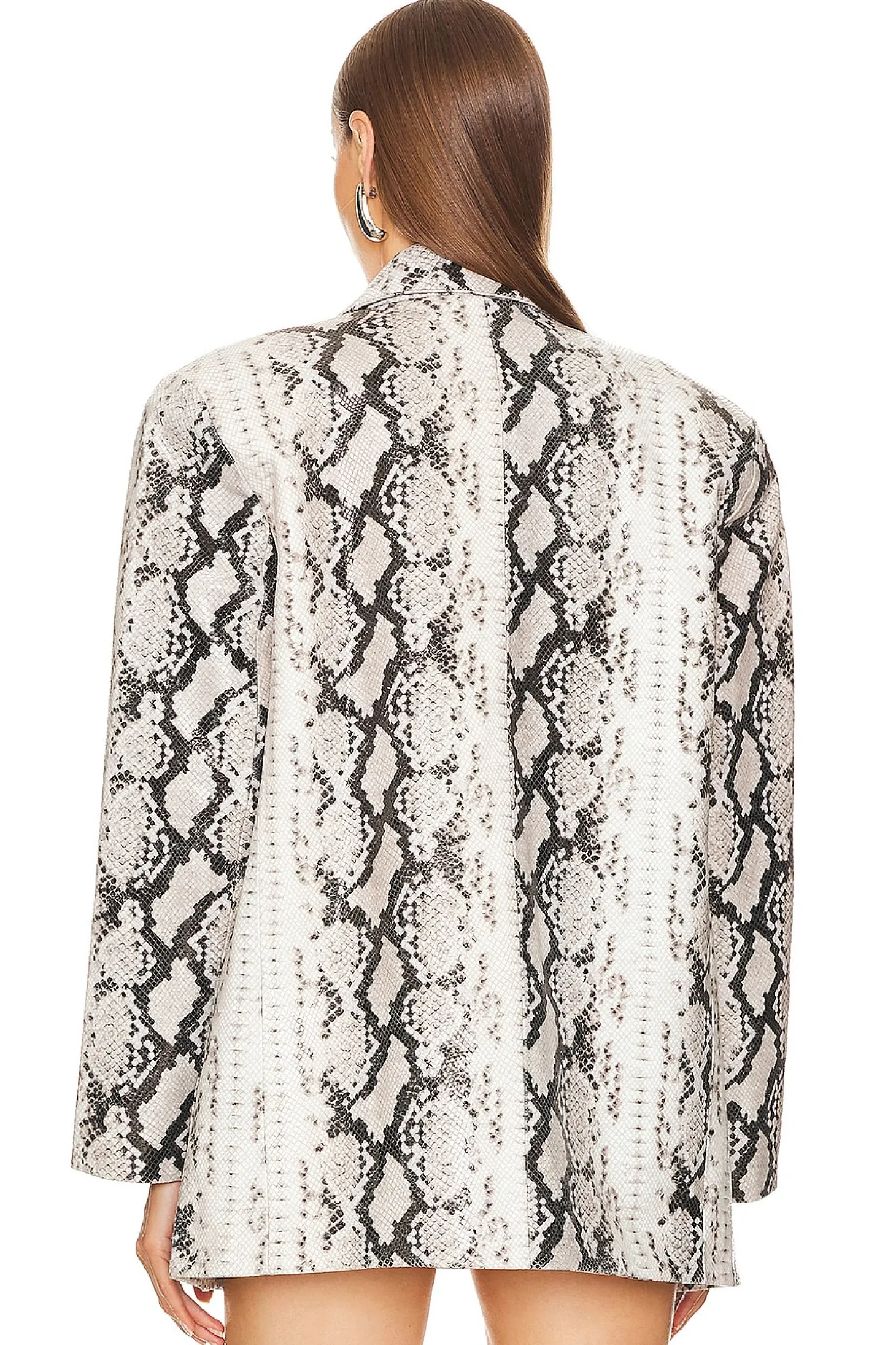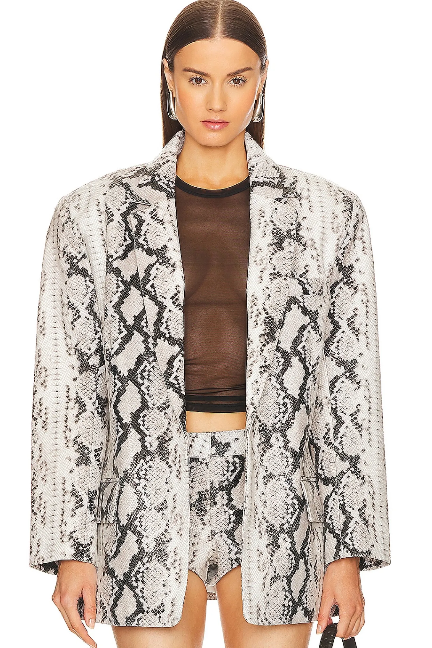 Self: 100% leather Lining: 95% polyester 5% elastane.Made in India.Professional leather clean only.Open front.3-pocket design.Padded shoulders.Midweight snake embossed patent leather fabric.Item not sold as a set