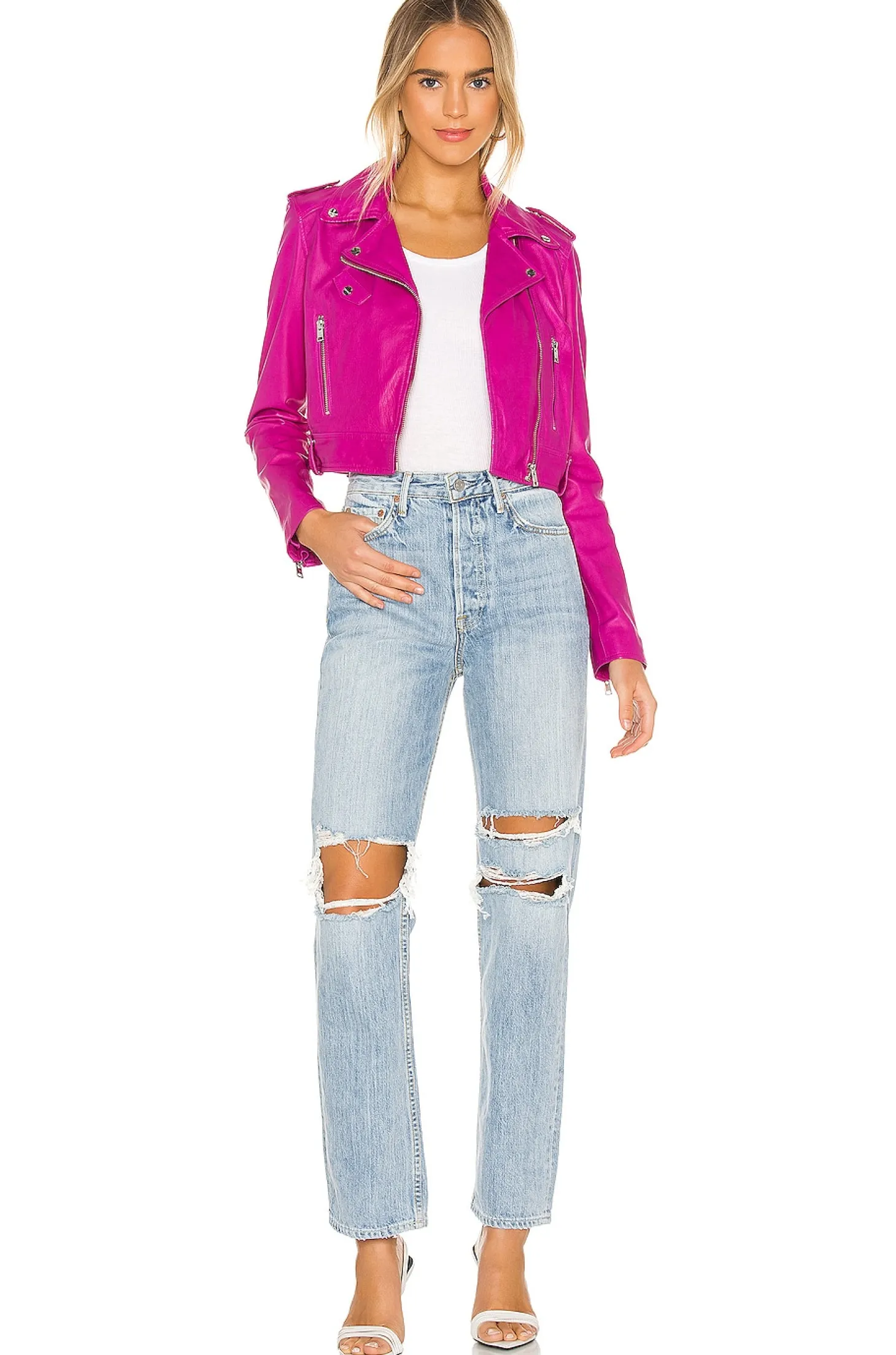 Self: 100% lamb leather Lining: 97% poly 3% spandex.Professional leather clean only.Asymmetrical front zipper closure.Side zipper pockets.Zipper gusset sleeve.Shoulder epaulette.Hem belt loop.Imported