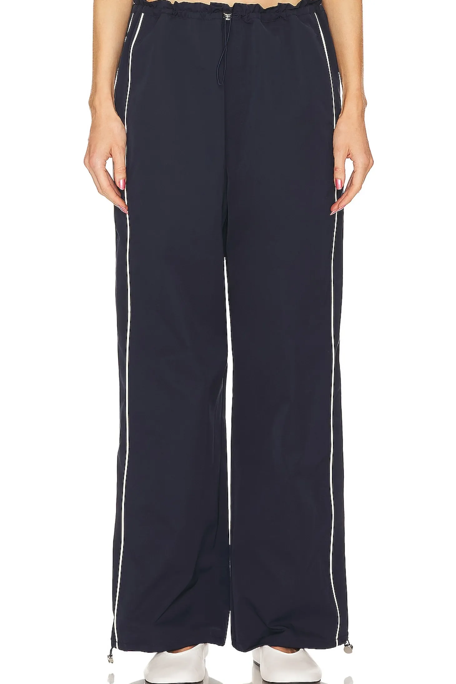 Self & Contrast Fabric: 100% polyester Lining: 55% polyester 45% rayon.Made in China.Hand wash.Drawcord elastic waist.Side seam pockets.Gabardine fabric with drawcord jogger hem.Item not sold as set.22" at the knee narrows to 13" at the leg opening