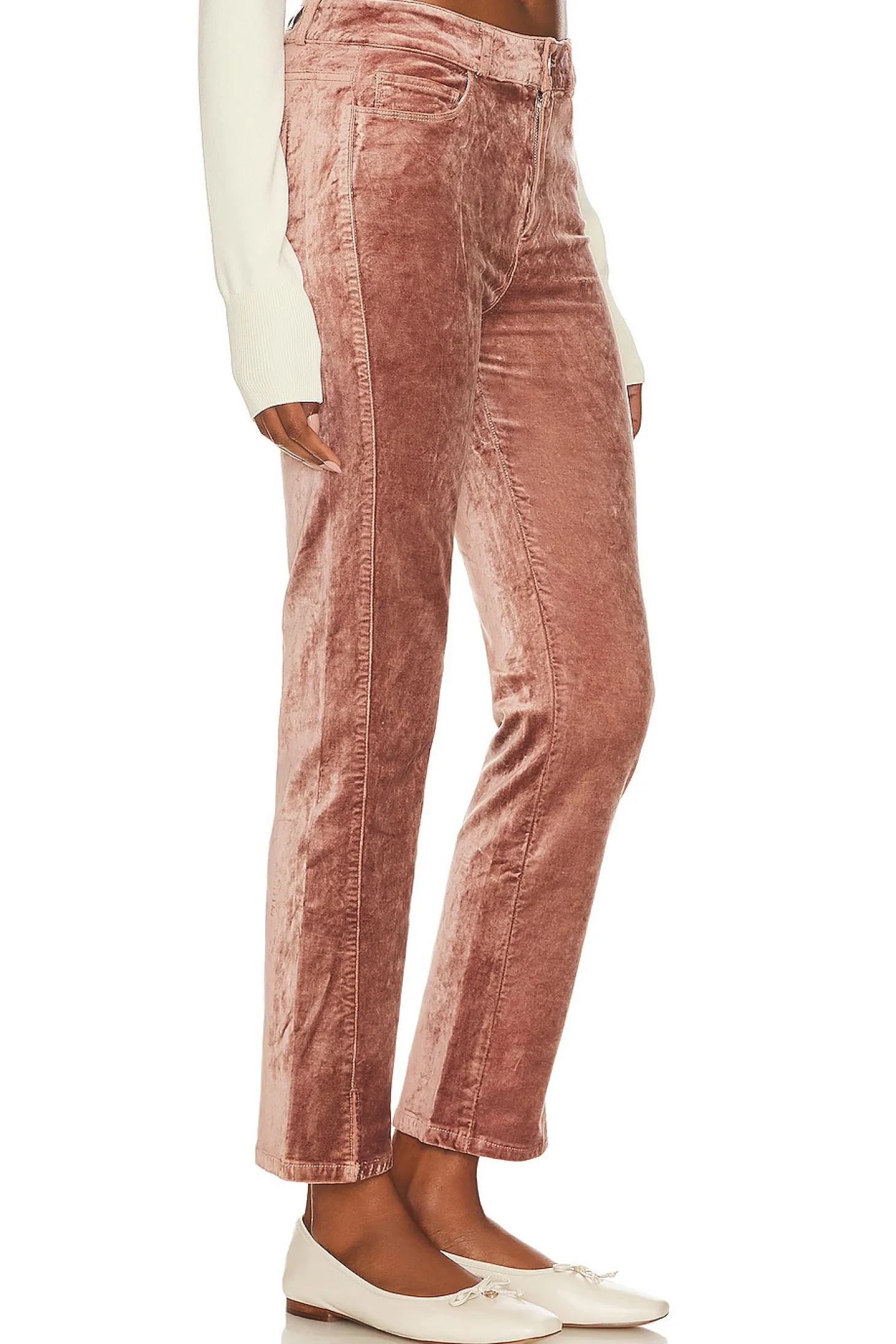 54% cotton 44% rayon 2% spandex.Made in China.Machine wash.Zip fly with button closure.5-pocket styling.Split cuffs.Velvet fabric.14" at the knee and 14" at the leg opening