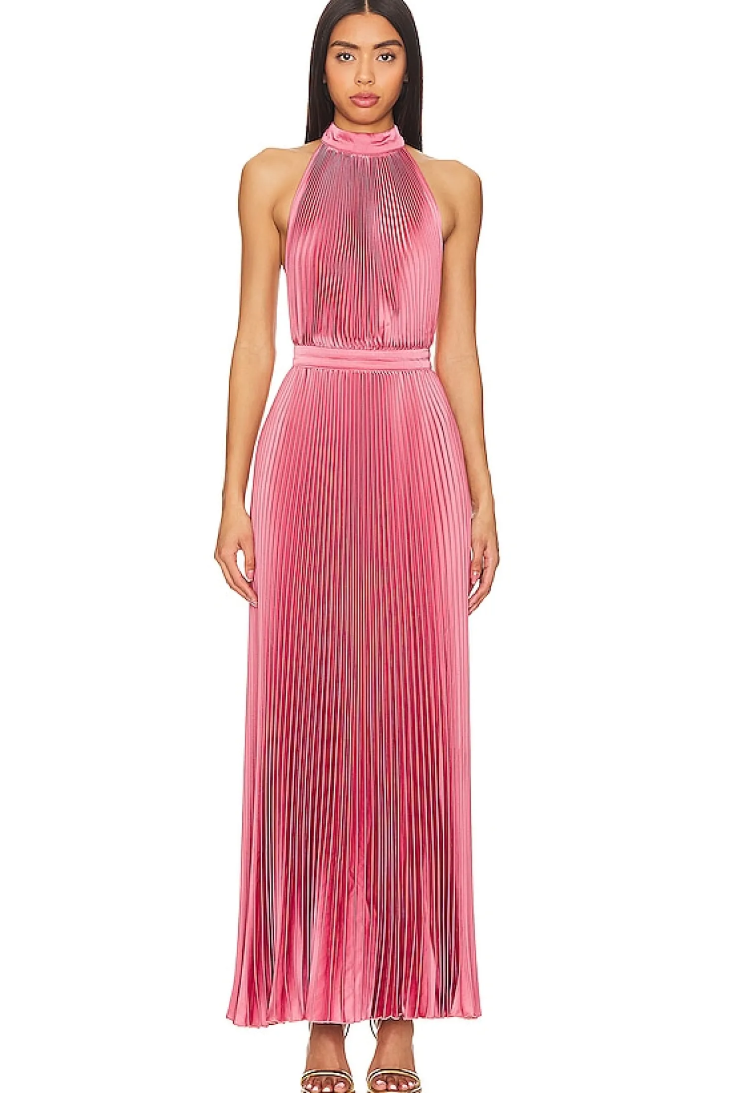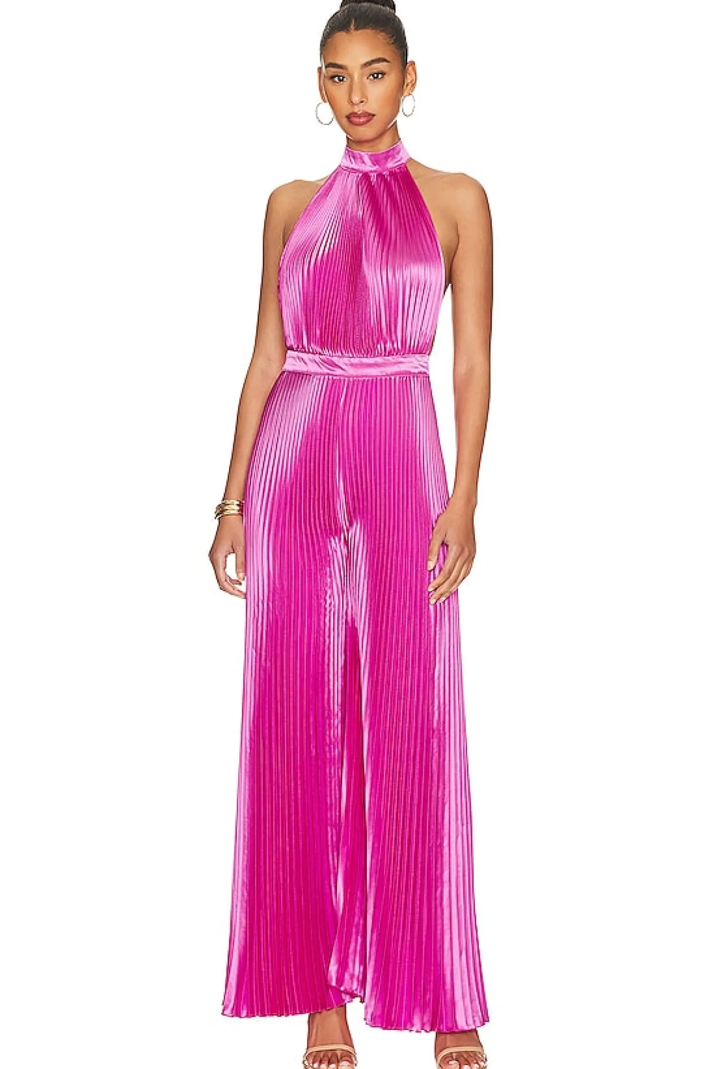 100% poly.Made in Indonesia.Hand wash.Hidden back zipper closure.Mockneck styling with back loop button closure.Pleated satin fabric