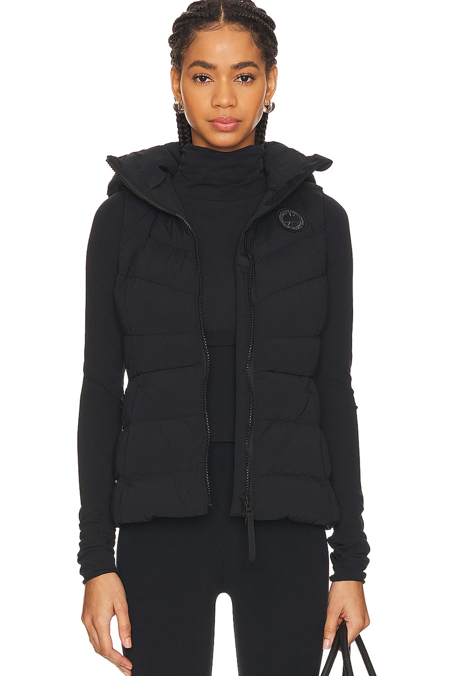 Self: 87% polyamide 13% elastane Fill: 90% duck down 10% duck feather.Made in Canada.Machine wash.Front zipper closure.Detachable hoodie.Side seam zipper pockets.Lightweight ripstop fabric