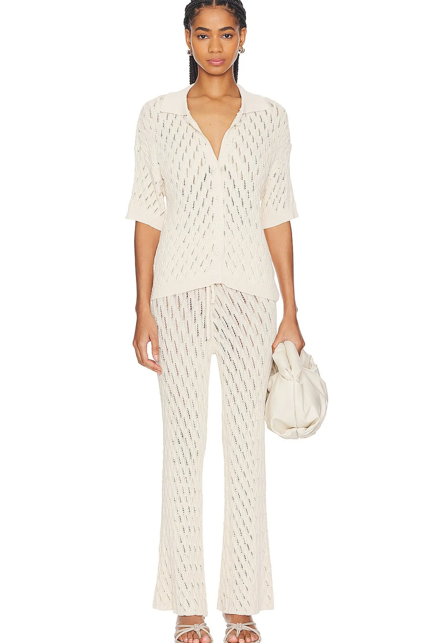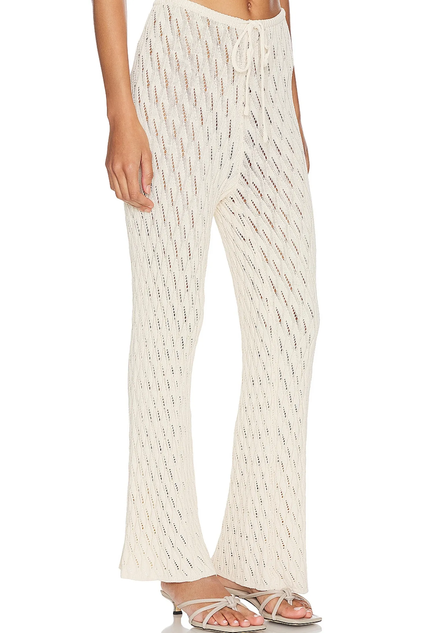63% viscose 37% nylon.Made in China.Machine wash.Unlined.Elastic drawstring waist.Open knit fabric.Item not sold as a set.16" at the knee breaks to 23.5" at the leg opening