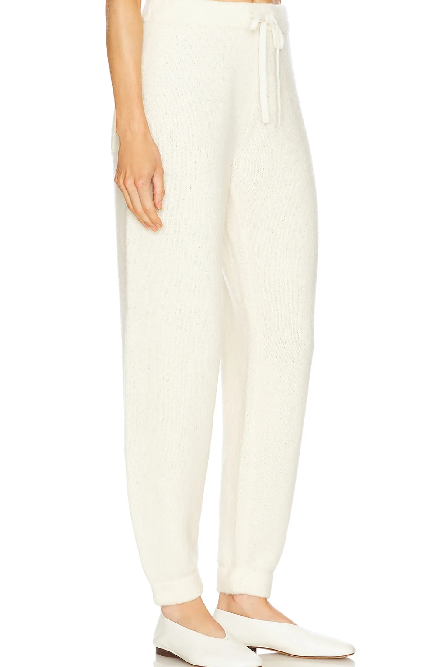 89% wool 9% polyamide 2% cashmere.Made in China.Hand wash.Pull-on styling with drawstring at waist.Singular back pouch pocket.Knit fabric.Item not sold as a set.21" at the knee narrows to 11" at the leg opening