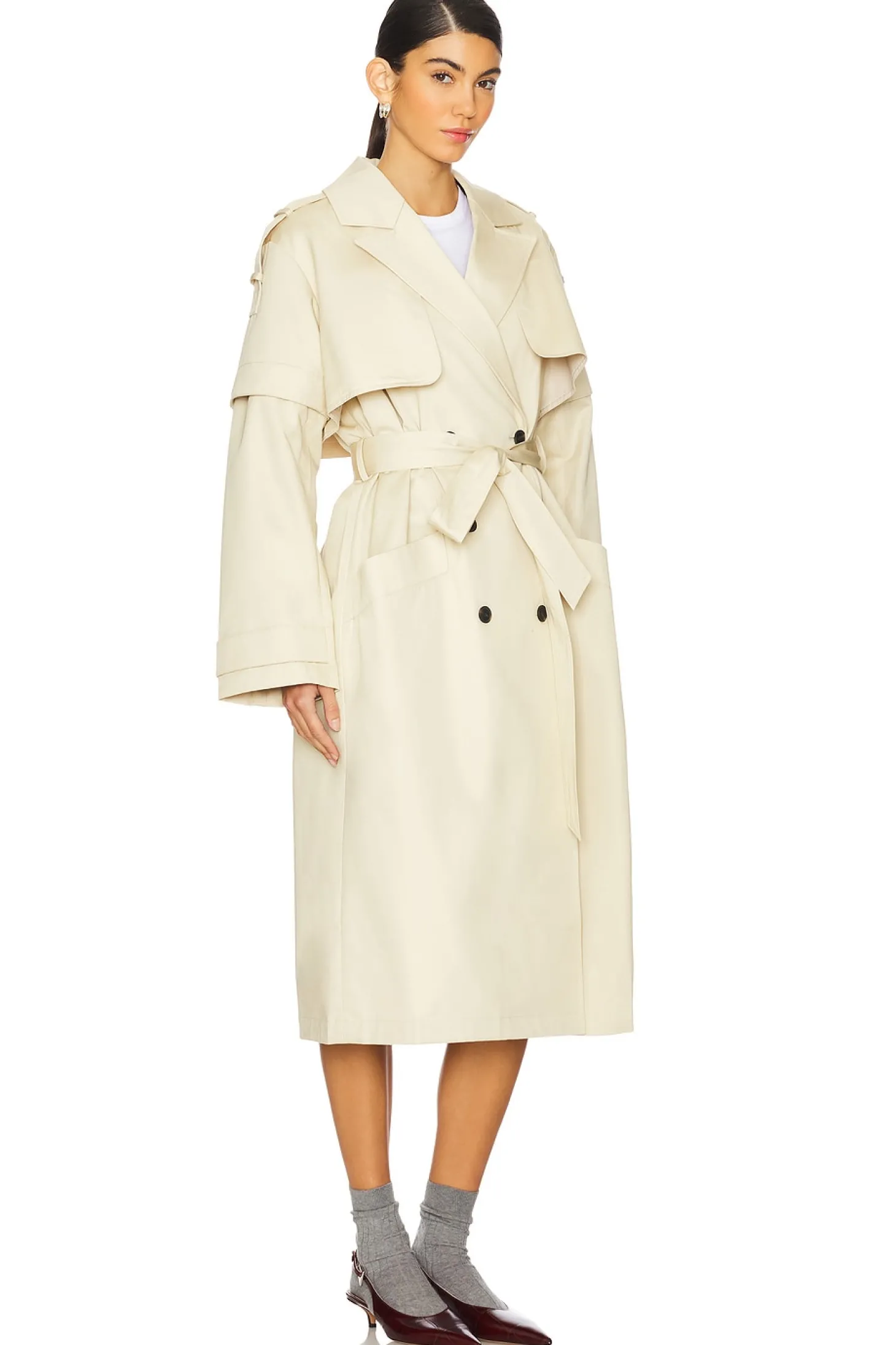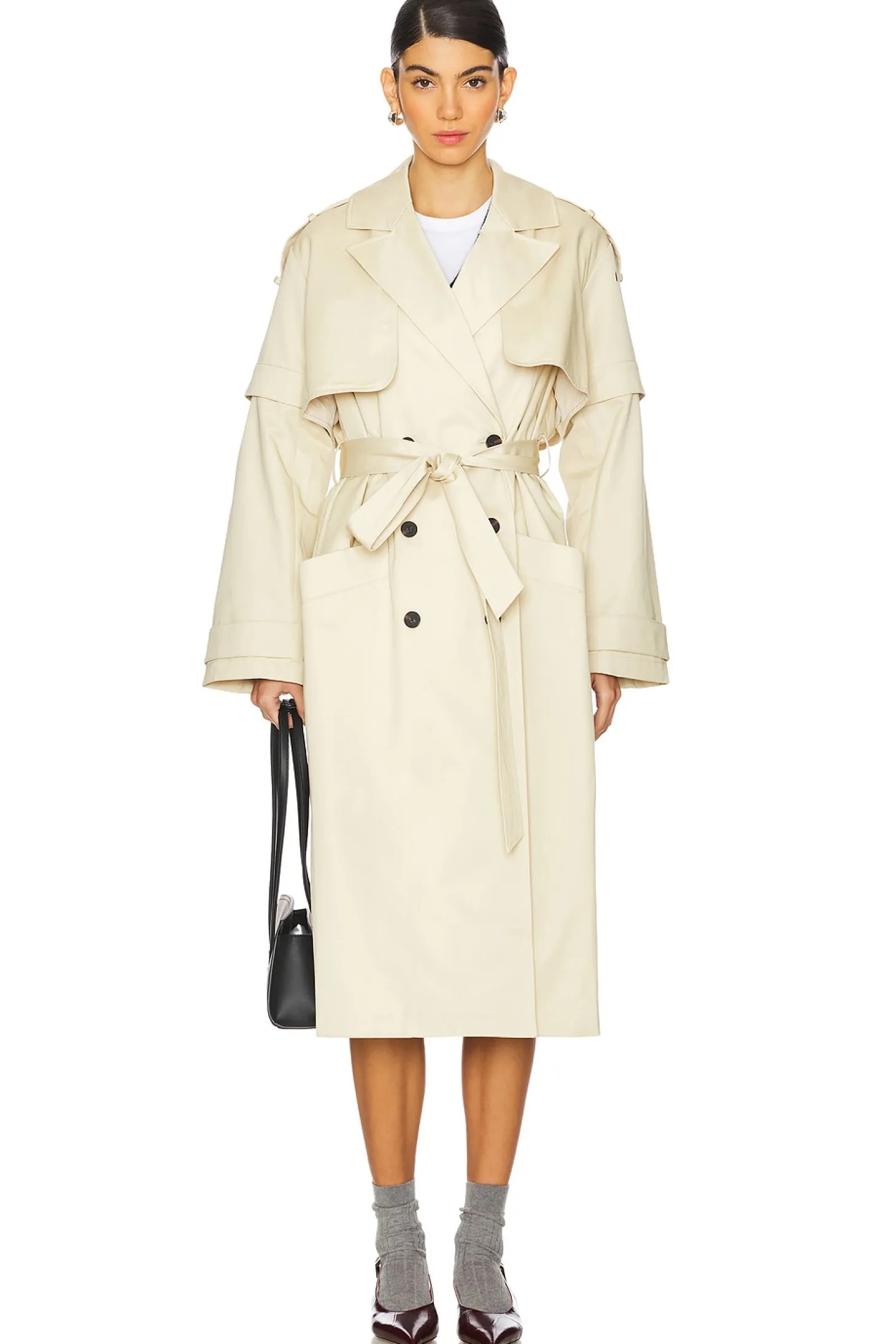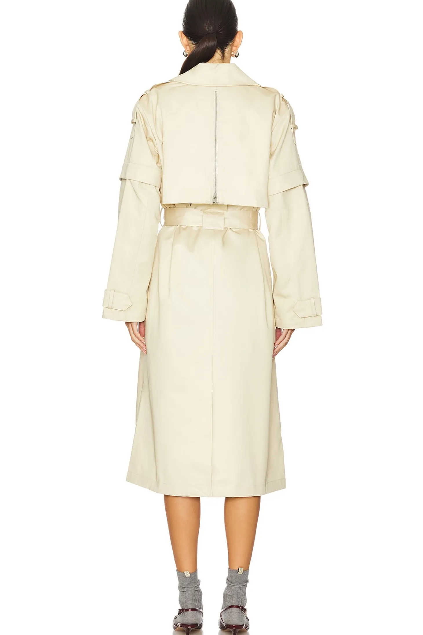 Self: 100% cotton Pocket Lining: 100% polyester.Made in China.Dry clean.Double breasted front button closure.Dual slip pockets.Detachable sleeves with snap buttons.Shoulder epaulettes.Twill fabric with detachable waist tie closure