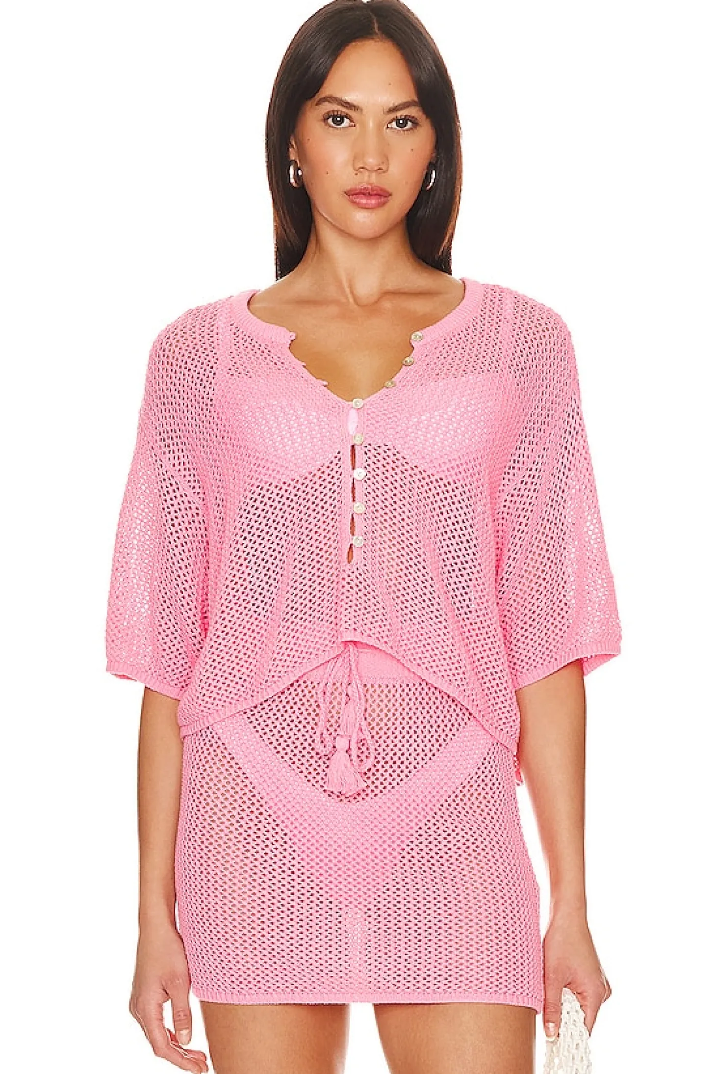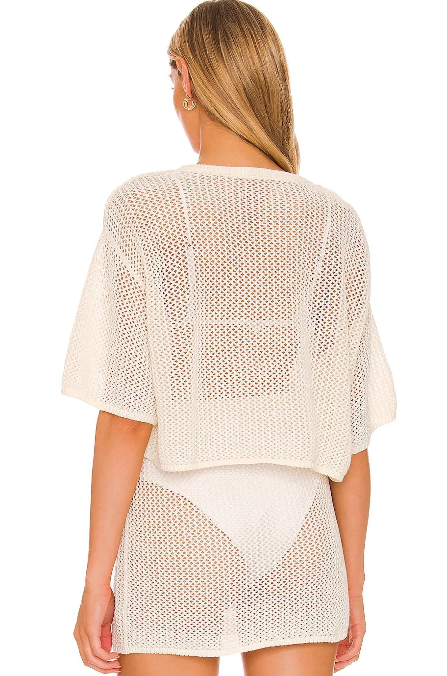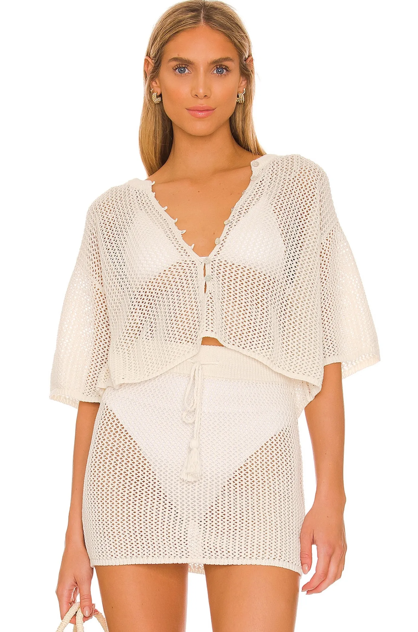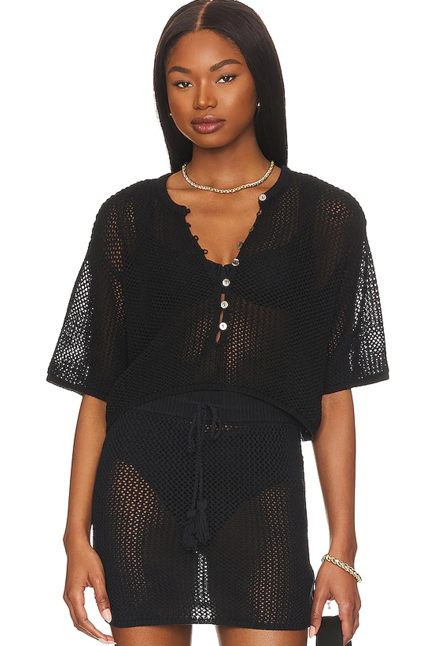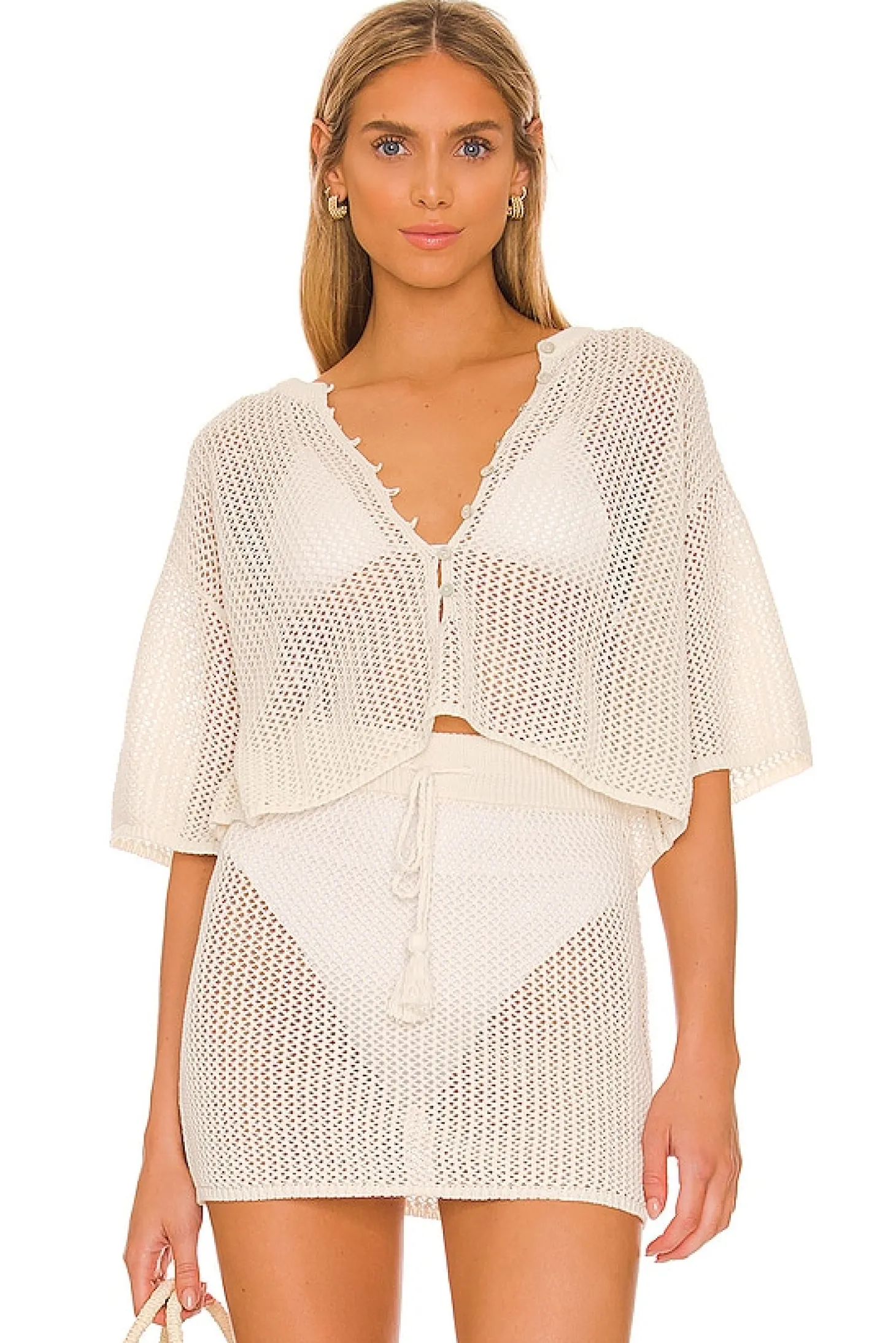 100% cotton.Made in China.Hand wash.Front loop button closure.Open knit crochet fabric.Please note: undergarments are not included.Item not sold as a set.An open-weave crochet button-down with a relaxed boxy fit.