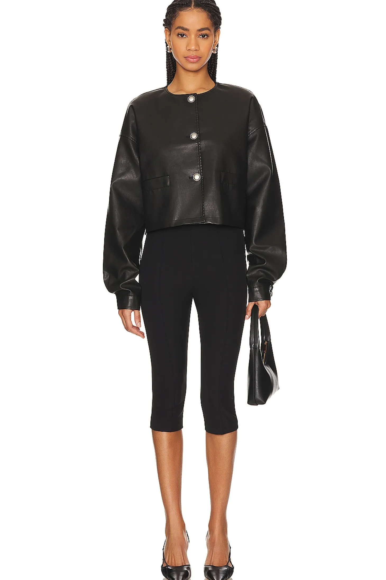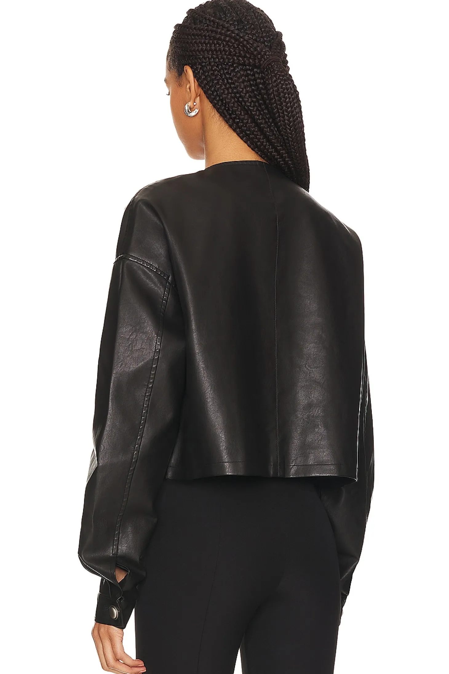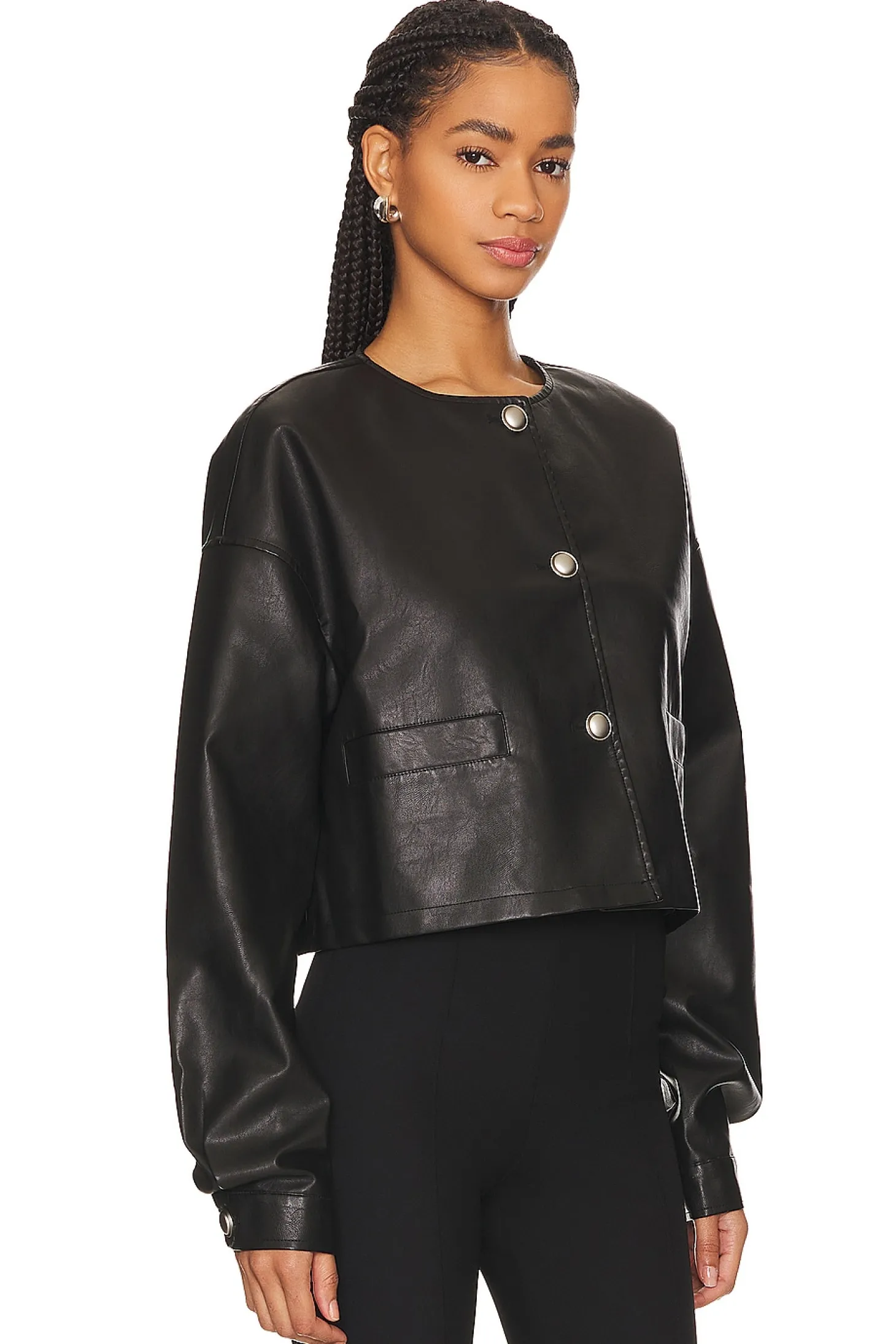 64% polyurethane 36% polyester.Made in China.Hand wash.Front button closure.Blouson sleeves with button cuffs.Front slip pockets.Lightweight faux leather fabric.The Coco jacket from Lioness features blouson sleeves and a collarless neckline for the ultimate chic look. It pairs well with denim.