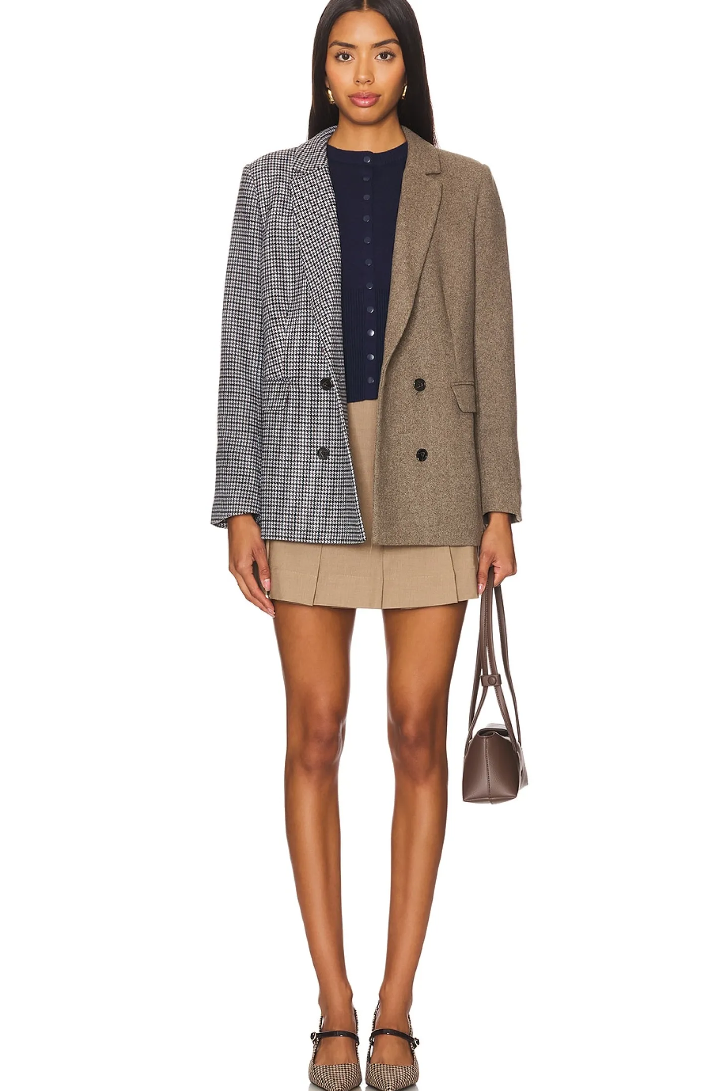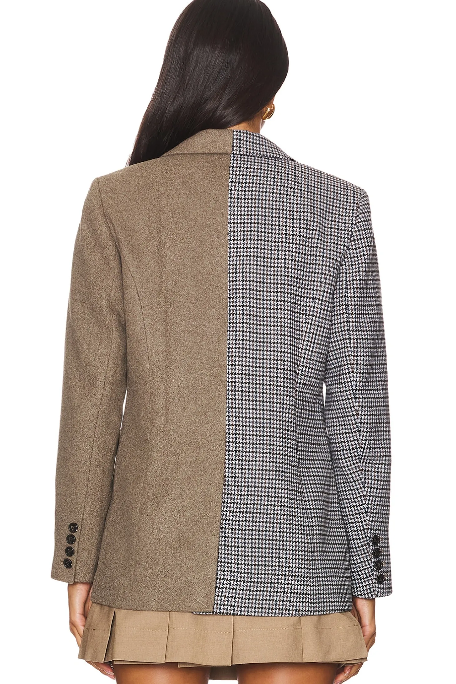 Self: 90% polyester 10% wool Lining: 100% polyester.Made in China.Dry clean only.Double breasted closure.Front flap pockets.Buttoned cuffs.Melton fabric with lightly padded shoulders